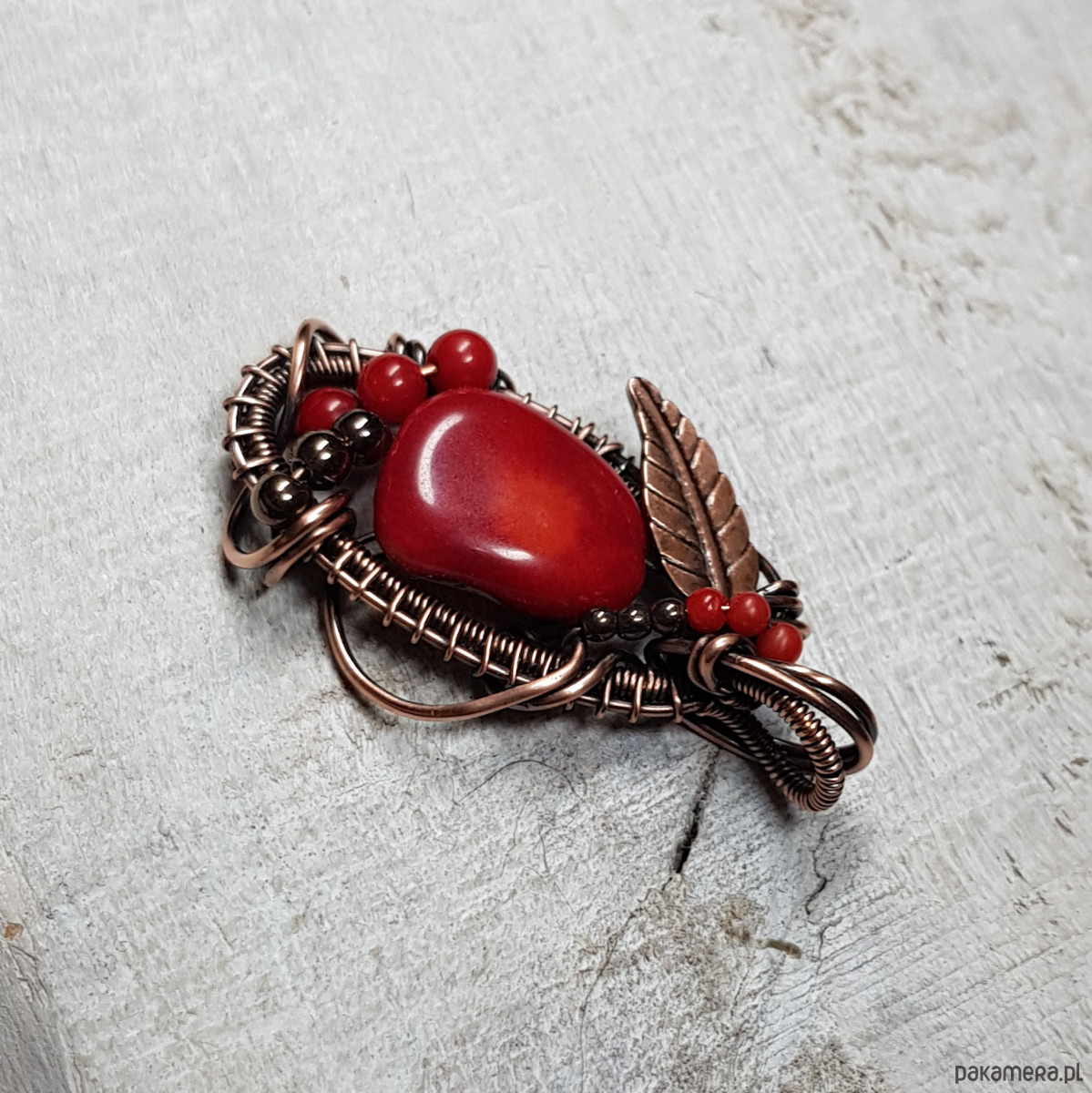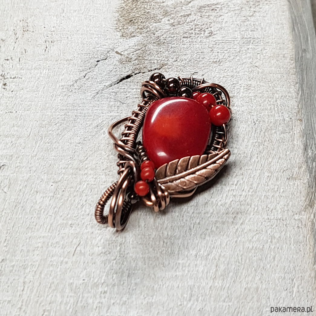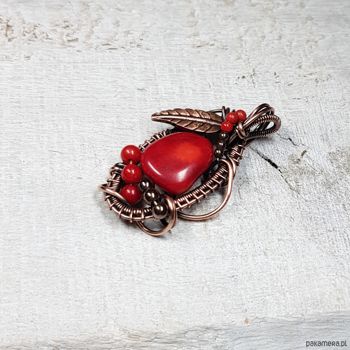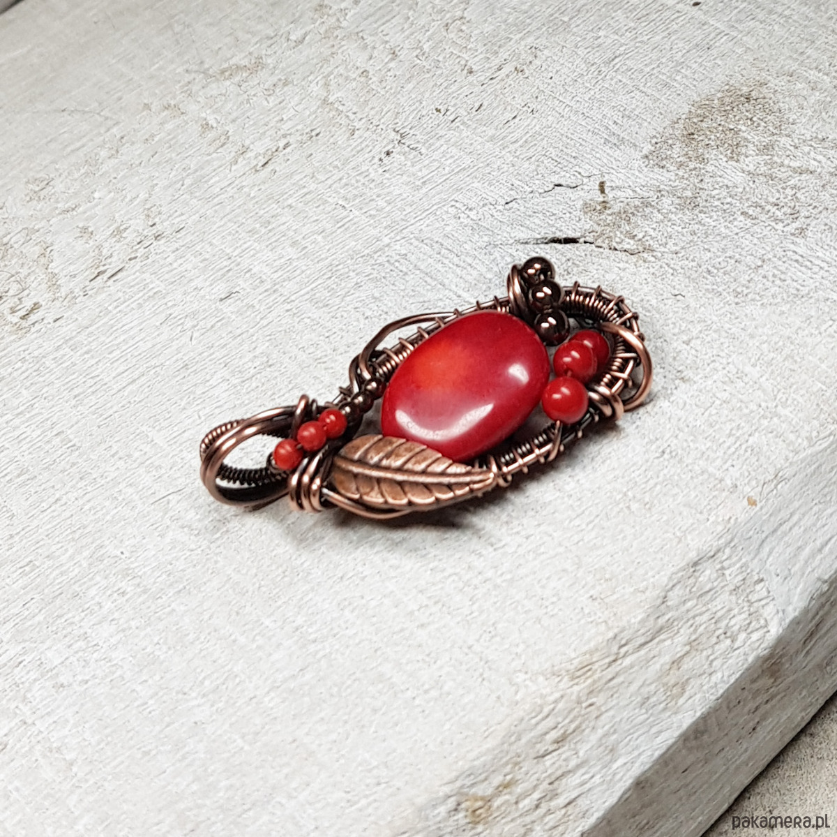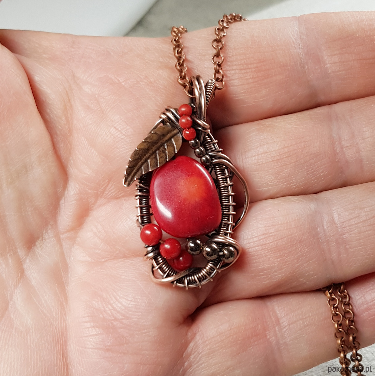 Zawieszka wykonana metodą wire-wrappingu w miedzi z naturalnego korala i koralików z korala. Wymiary wisiorka 40x22 mm, całość oksydowana i wypolerowana dla nadania szlachetnego wyglądu przyciemnienia. Do zawieszki dołączam łańcuszek długości 45-50 cm.