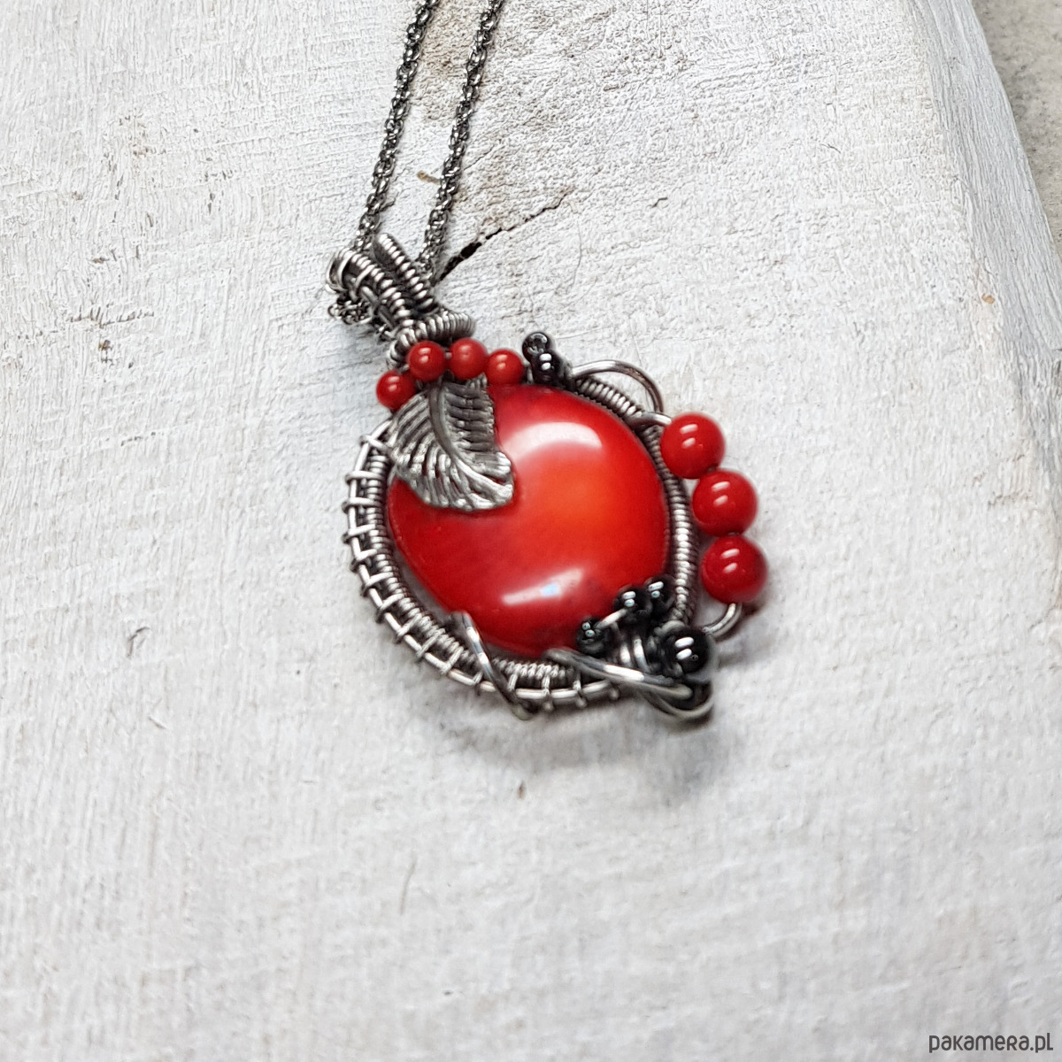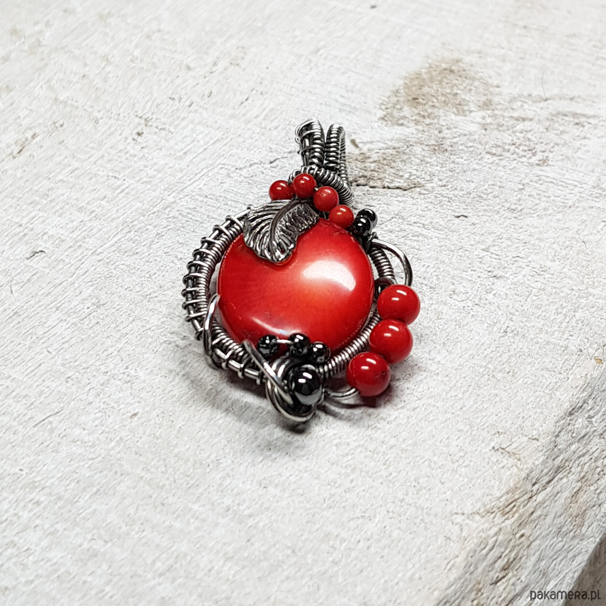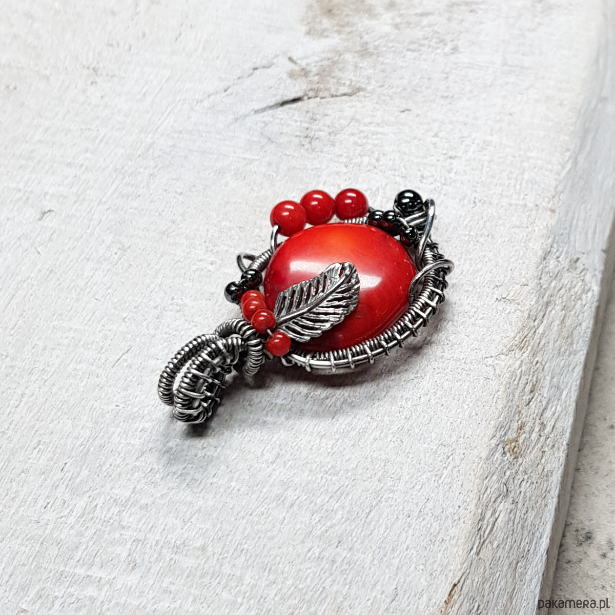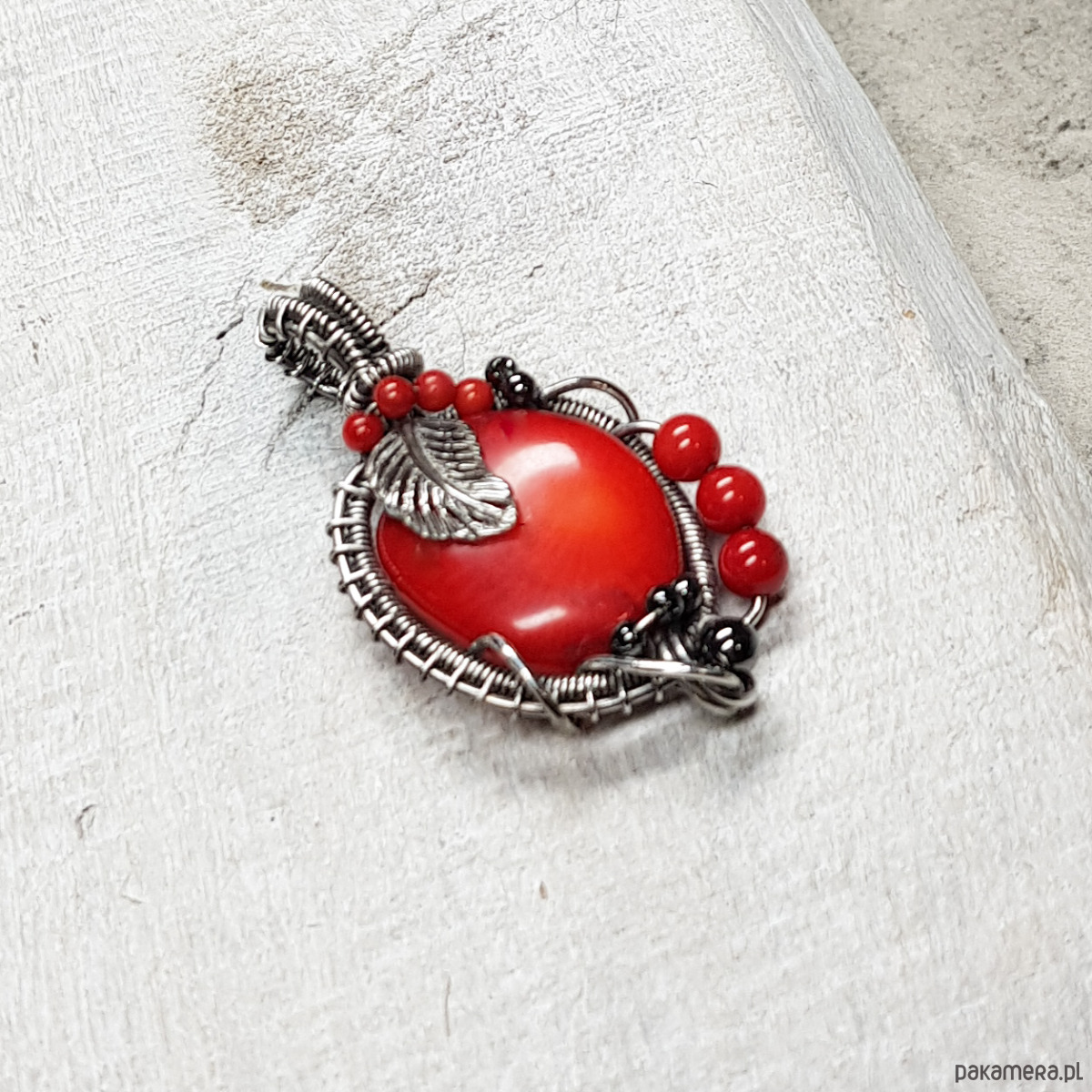 Zawieszka wykonana ręcznie metodą wire-wrappingu której głównym elementem jest naturalny koral i koraliki z korala. Do wykonania wisiorka użyłam srebra najwyższej próby 999 które następnie oksydowałam i wypolerowałam w celu uzyskania szlachetnego efektu postarzenia . Wymiary zawieszki 40x22mm z łańcuszkiem długości około 50 cm. Wisiorek jest mały, delikatny.