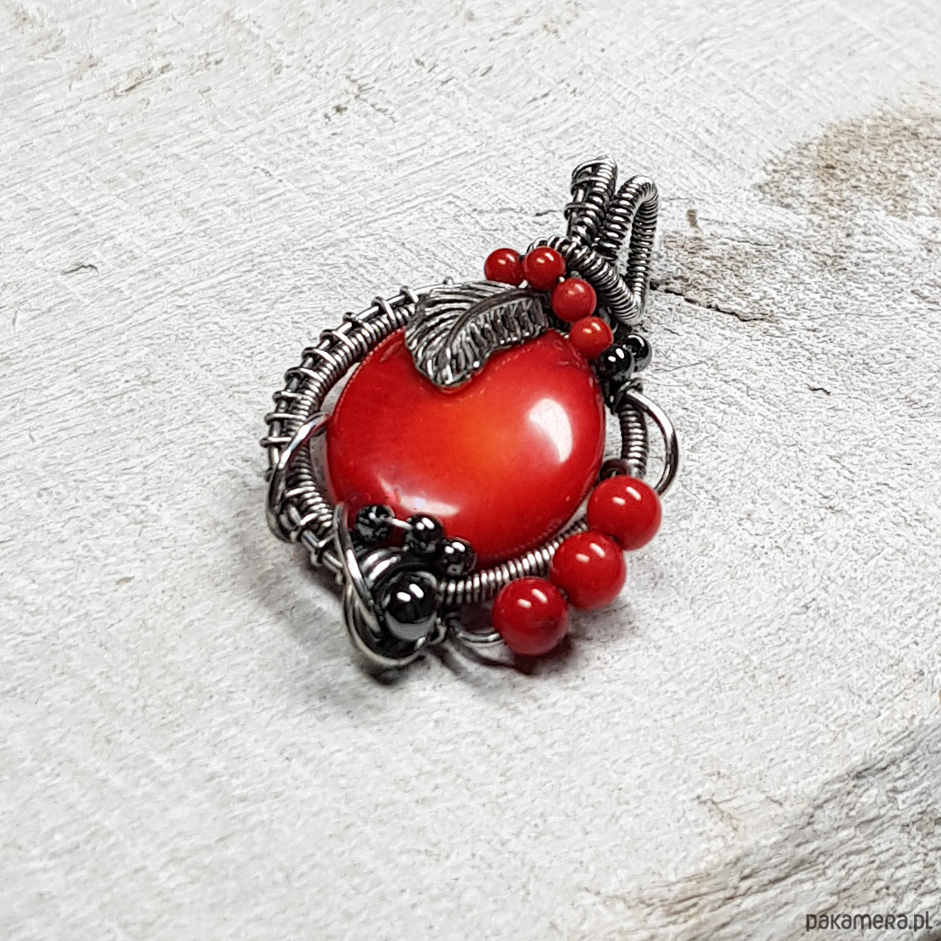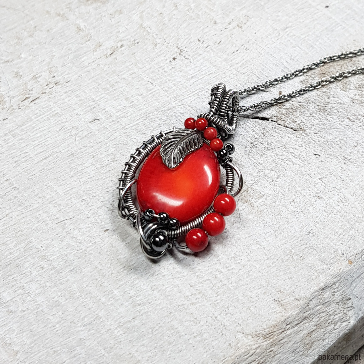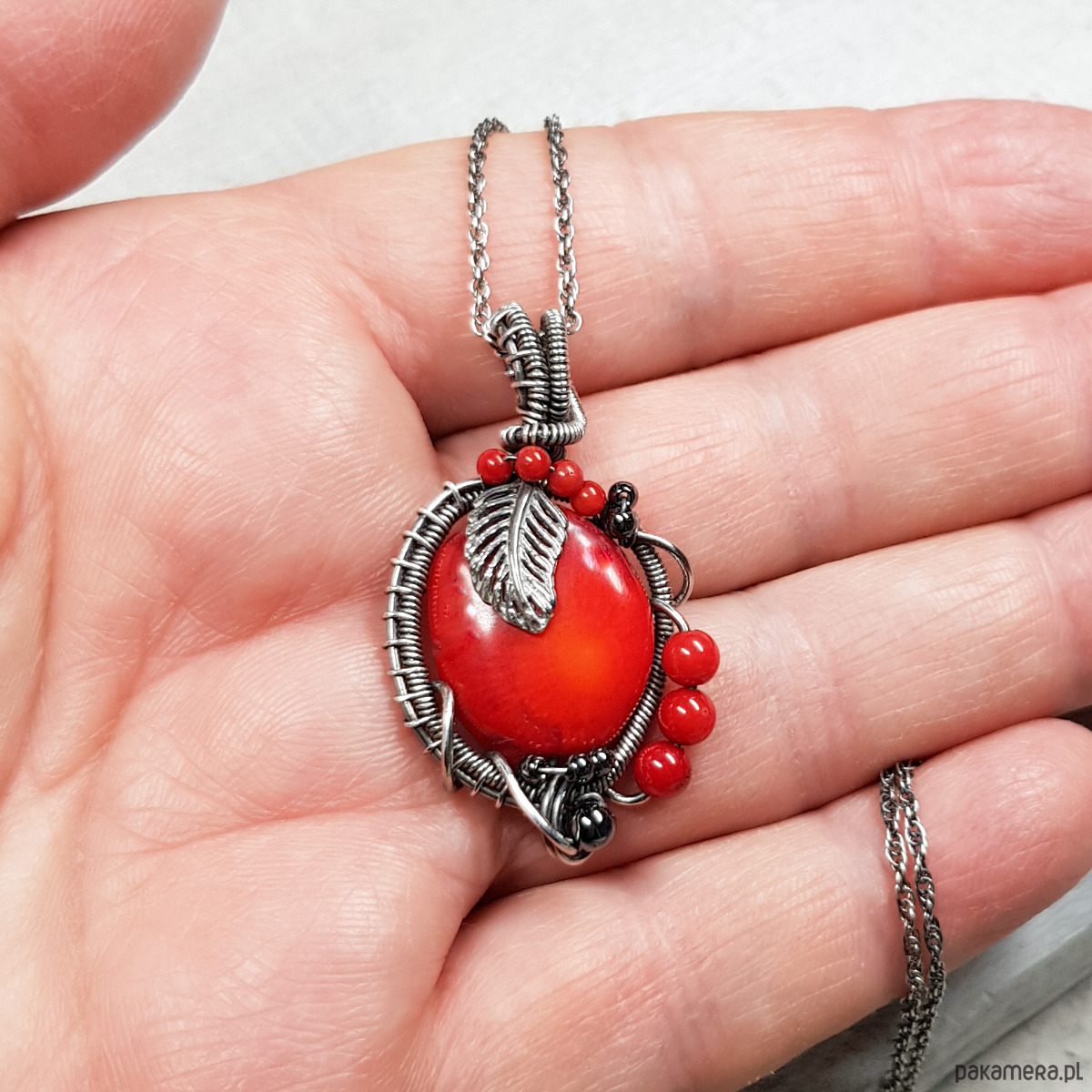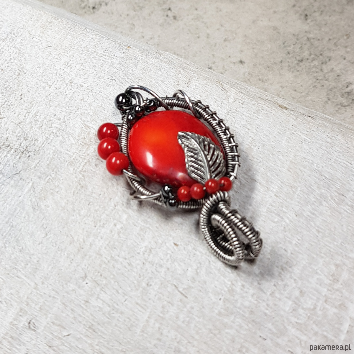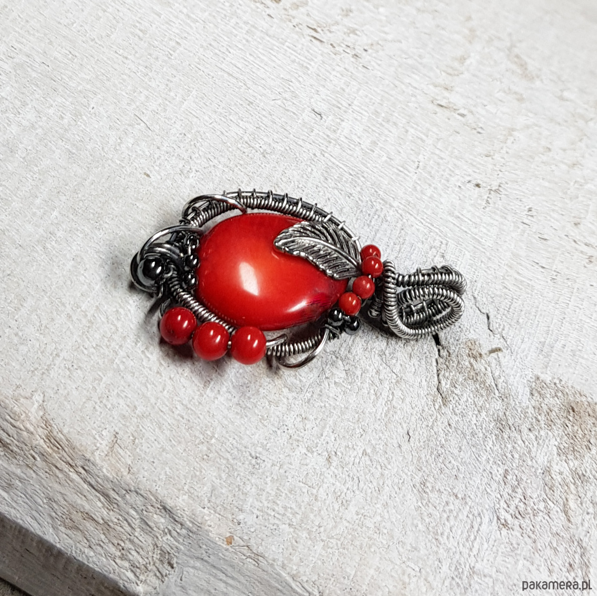 Zawieszka wykonana ręcznie metodą wire-wrappingu której głównym elementem jest naturalny koral i koraliki z korala. Do wykonania wisiorka użyłam srebra najwyższej próby 999 które następnie oksydowałam i wypolerowałam w celu uzyskania szlachetnego efektu postarzenia . Wymiary zawieszki 40x22mm z łańcuszkiem długości około 50 cm. Wisiorek jest mały, delikatny.