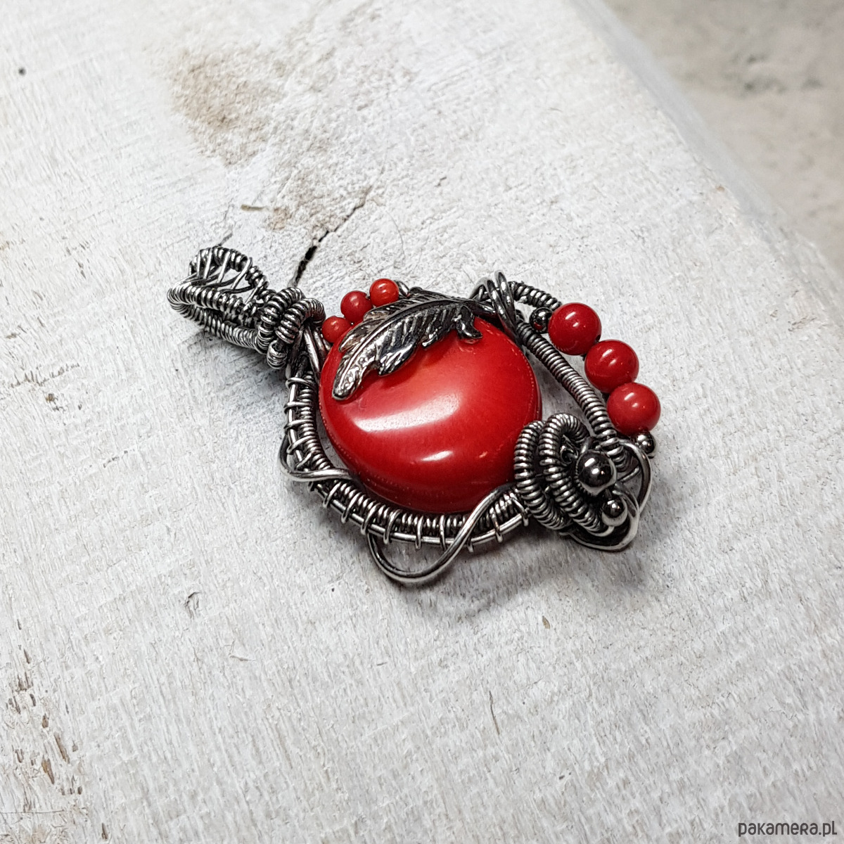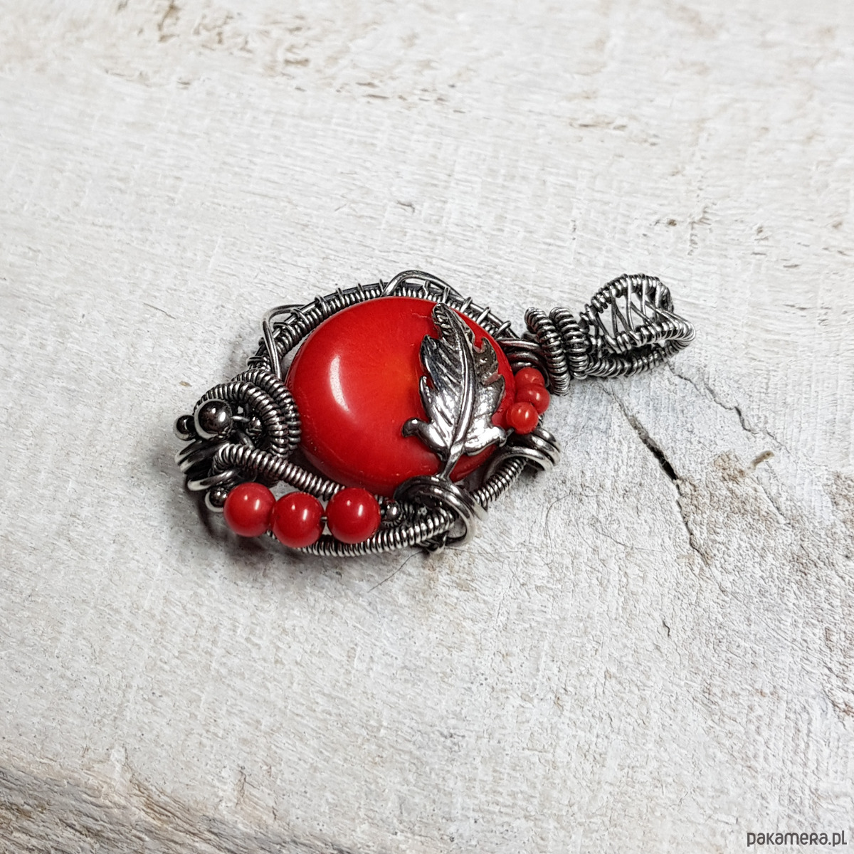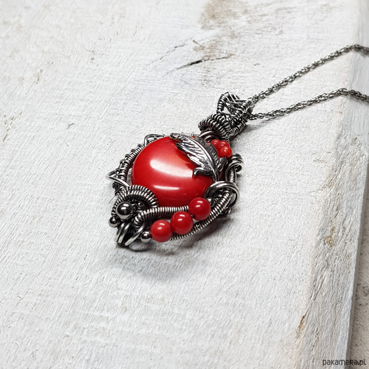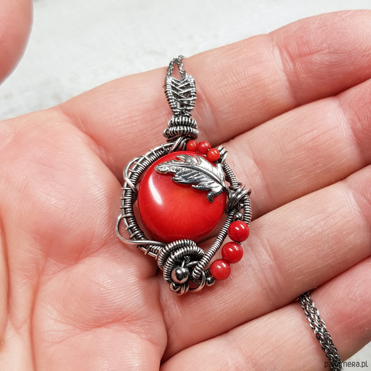 Zawieszka wykonana ręcznie metodą wire-wrappingu której głównym elementem jest naturalny koral i koraliki z korala. Do wykonania wisiorka użyłam srebra najwyższej próby 999 które następnie oksydowałam i wypolerowałam w celu uzyskania szlachetnego efektu postarzenia . Wymiary zawieszki 42x26mm z łańcuszkiem długości około 50 cm. Wisiorek jest mały, delikatny.