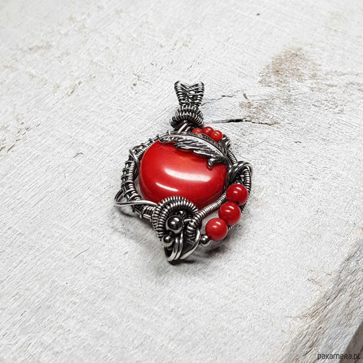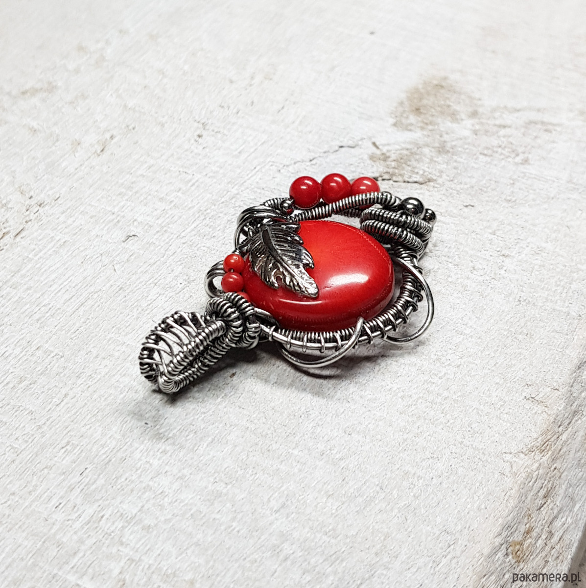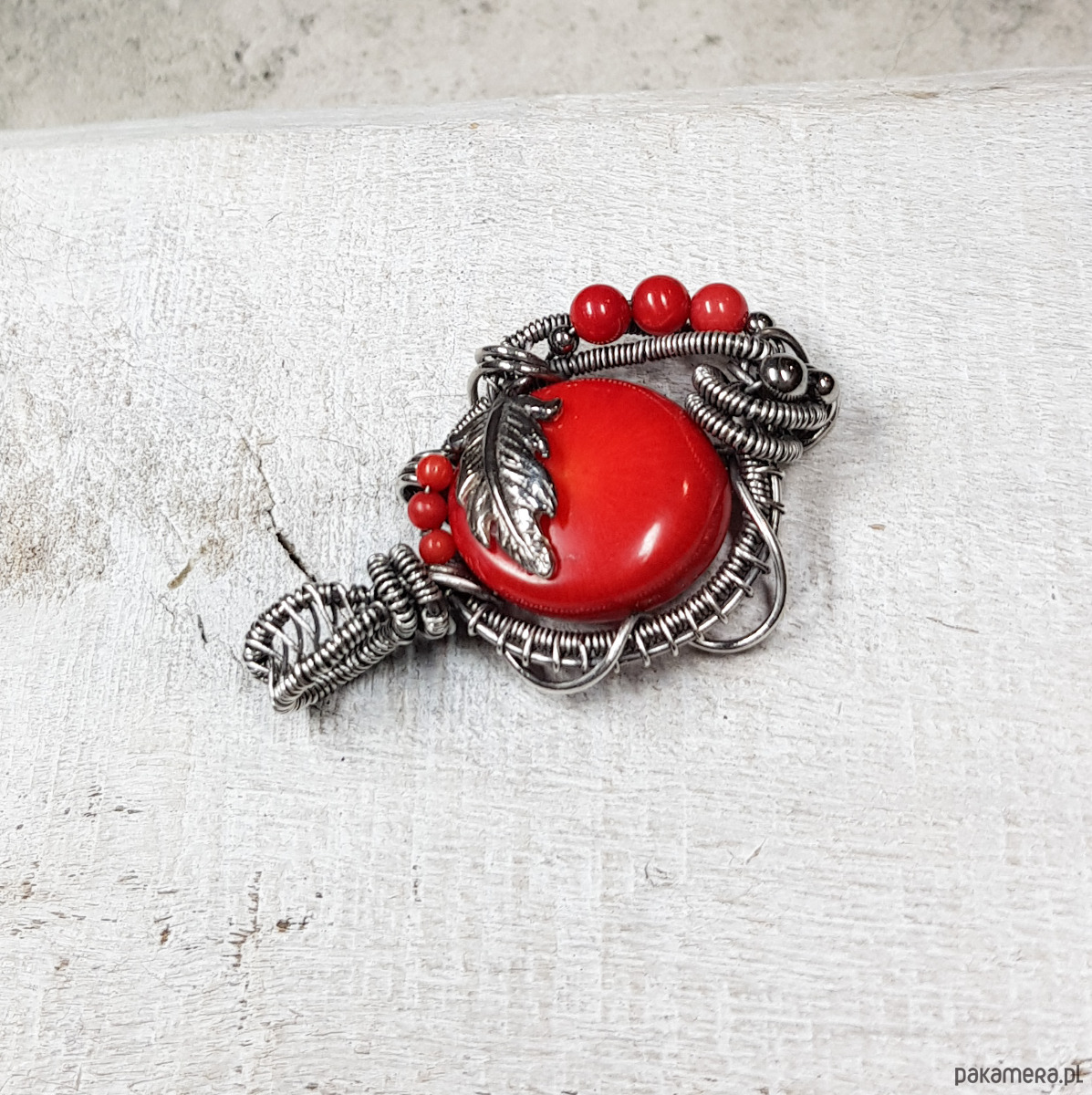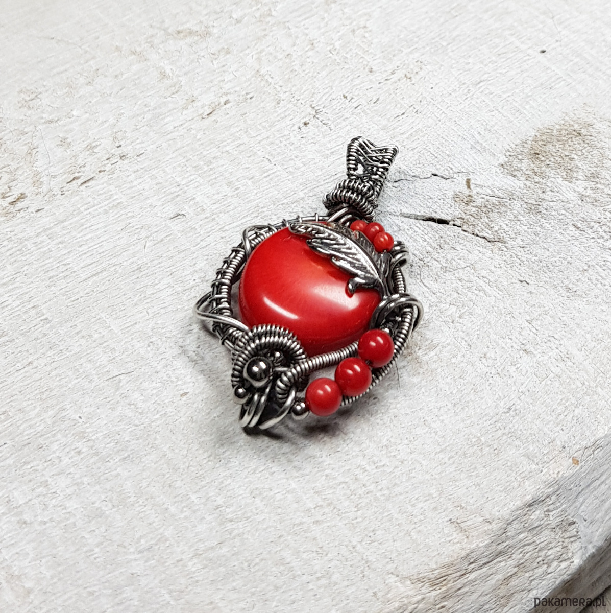 Zawieszka wykonana ręcznie metodą wire-wrappingu której głównym elementem jest naturalny koral i koraliki z korala. Do wykonania wisiorka użyłam srebra najwyższej próby 999 które następnie oksydowałam i wypolerowałam w celu uzyskania szlachetnego efektu postarzenia . Wymiary zawieszki 42x26mm z łańcuszkiem długości około 50 cm. Wisiorek jest mały, delikatny.