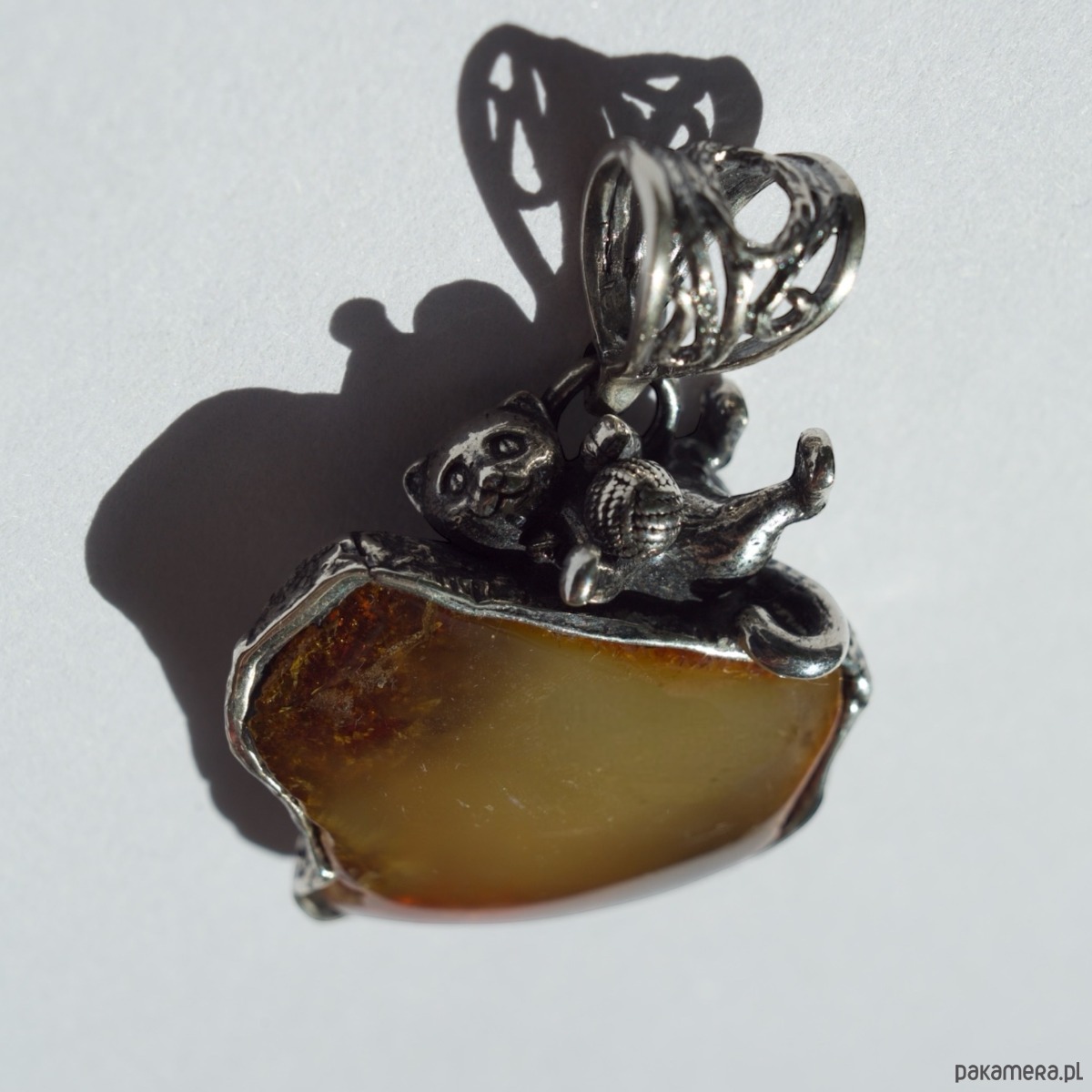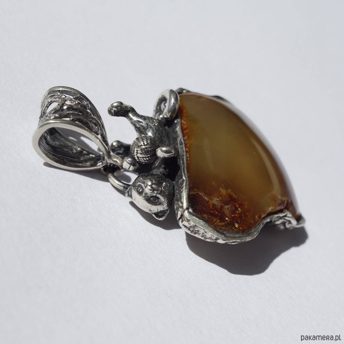 Ręcznie wykonany wisiorek z naturalnym bursztynem bałtyckim w ciepłym odcieniu koniakowym. Oprawa została wzbogacona o srebrną figurkę kotka bawiącego się włóczką, co nadaje całości oryginalny i pełen wdzięku charakter. Dzięki starannemu wykonaniu i dbałości o detale wisiorek łączy elegancję srebra z lekkością fantazyjnego wzornictwa. To propozycja idealna dla miłośników kotów oraz osób, które cenią nietuzinkową biżuterię z charakterem.