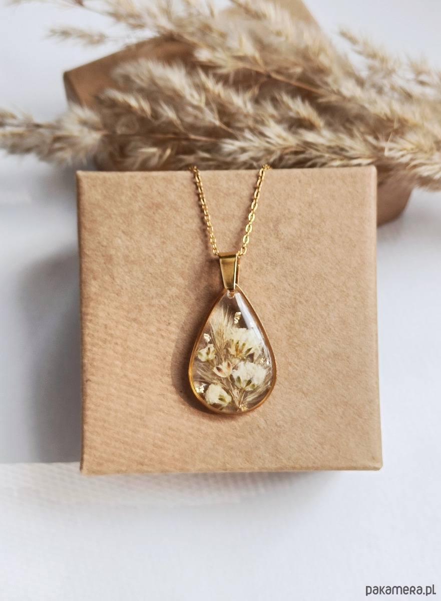 Uroczy wisiorek z zatopionymi kwiatami białej gipsówki, trawą i drobinkami złota. Wykonany z wysokiej klasy żywicy, która nie zmienia koloru pod wpływem promieniowania uv oraz wysokiej jakości stali chirurgicznej.
