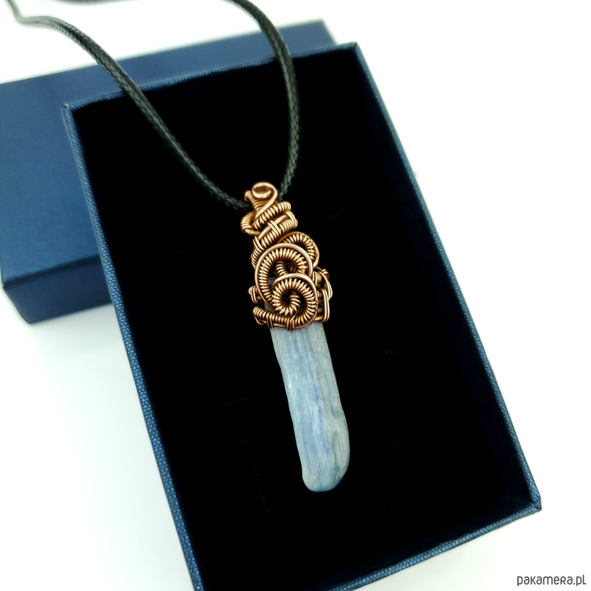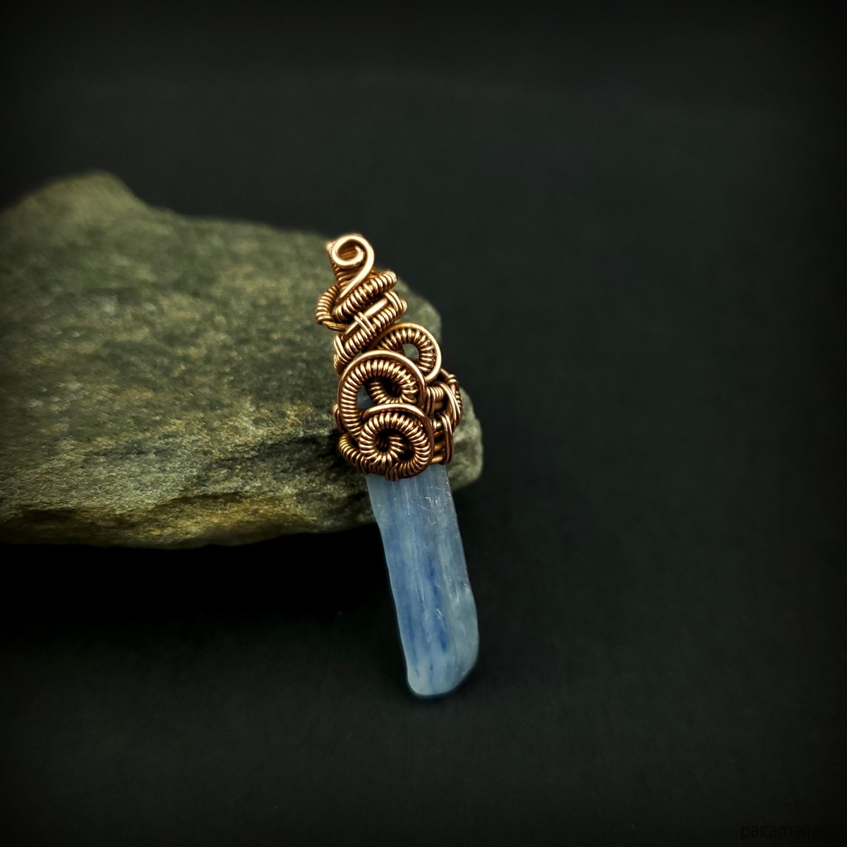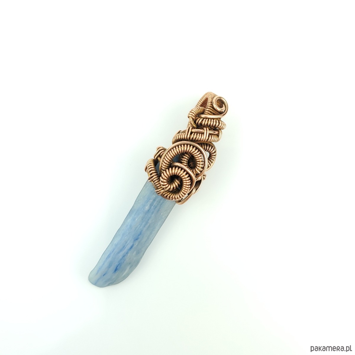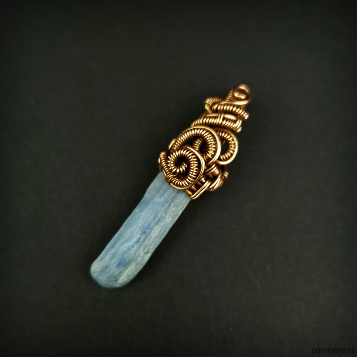 Wisiorek powstał z kyanitu o nieregularnym kształcie. Całość misternie opleciona miedzią.