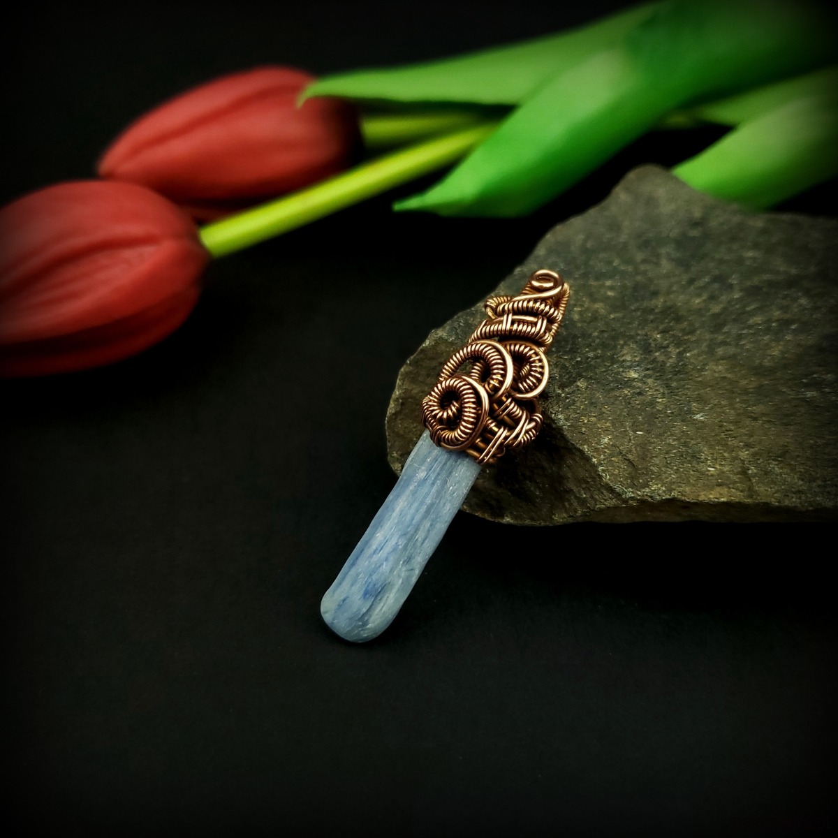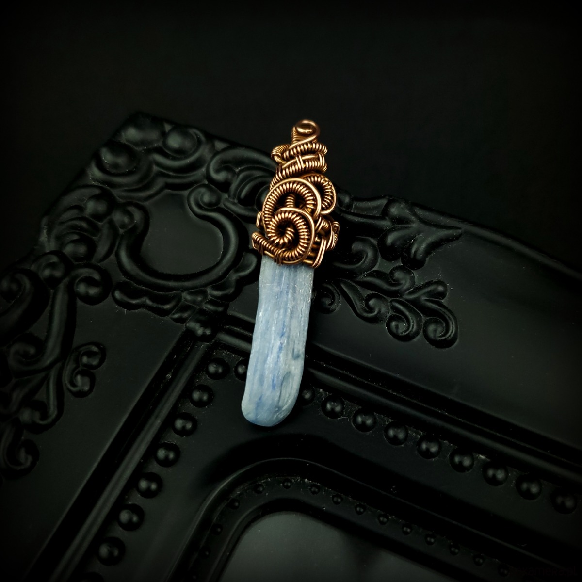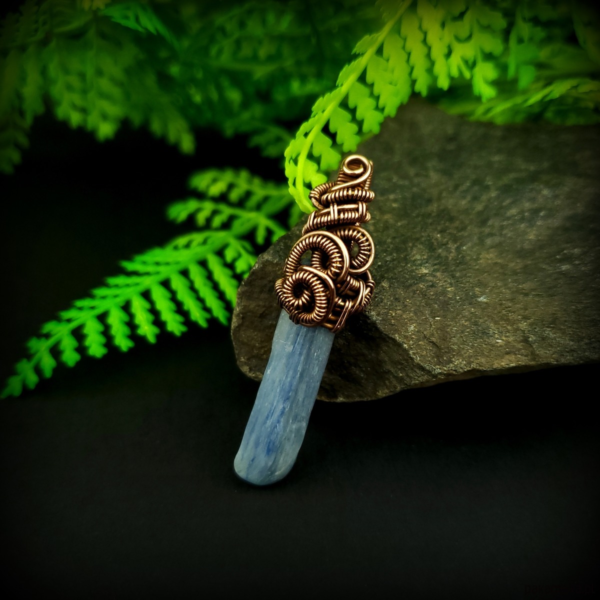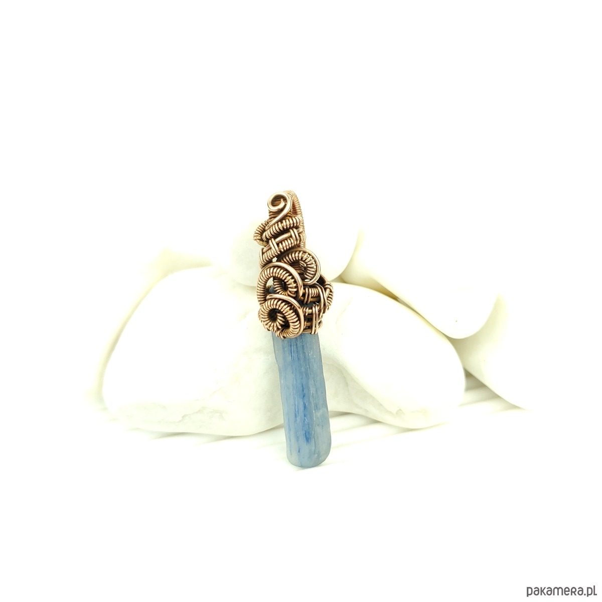 Wisiorek powstał z kyanitu o nieregularnym kształcie. Całość misternie opleciona miedzią.