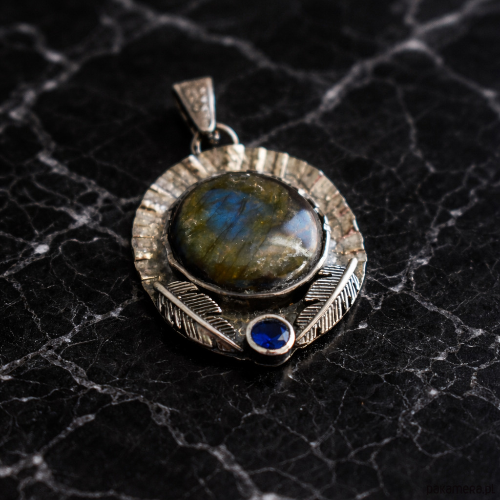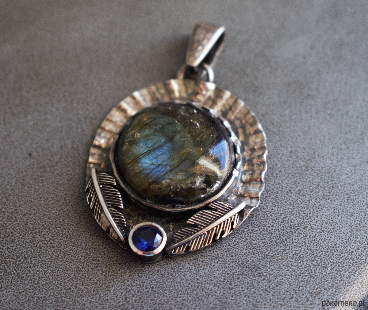 ✦ Unikalny wisiorek ręcznie wykonany od podstaw ze srebra pr 925 , pięknego naturalnego labradorytu , który mieni się wieloma kolorami w zależności jak pada światło, oraz szafiru syntetycznego.