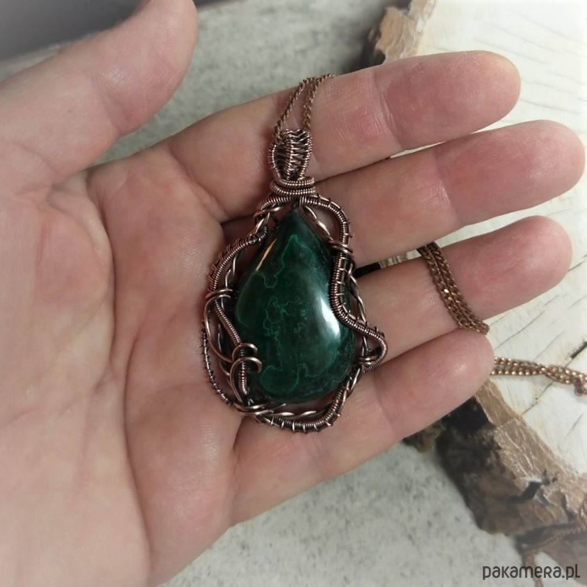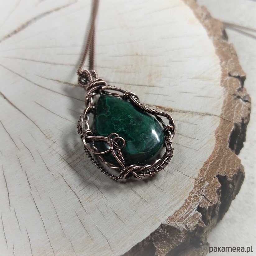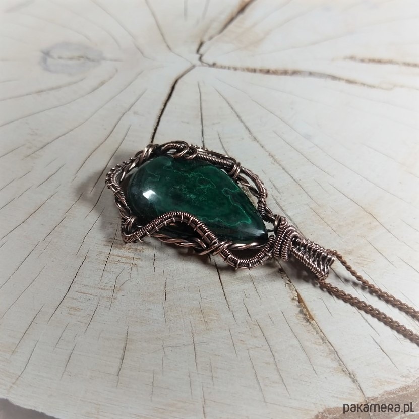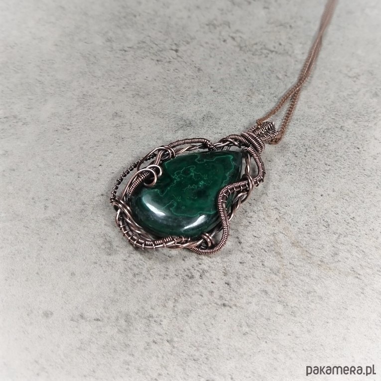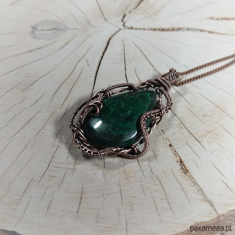 Zawieszka wykonana ręcznie metodą wire-wrappingu której głównym elementem jest naturalny malachit. Do wykonania wisiorka użyłam miedzi następnie zaoksydowałam i wypolerowałam w celu uzyskania szlachetnego efektu postarzenia. Wymiary zawieszki 58x35mm z łańcuszkiem długości około 48-50 cm.