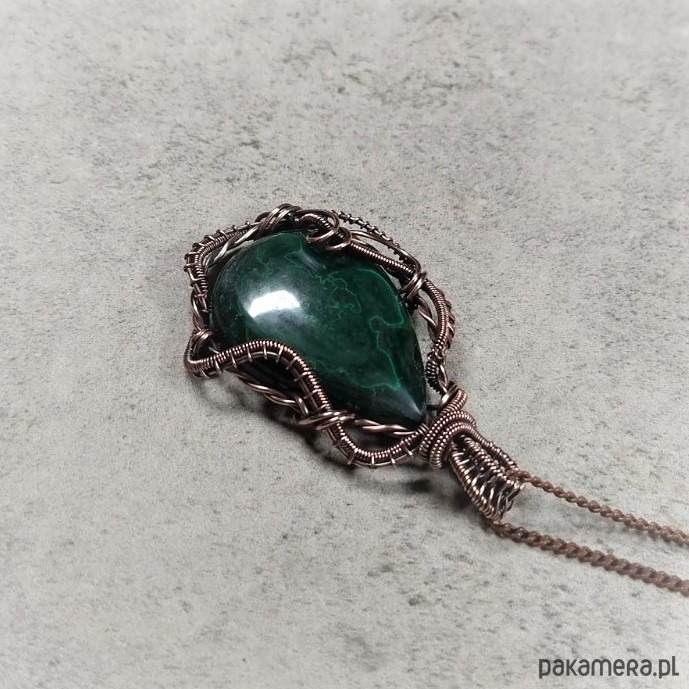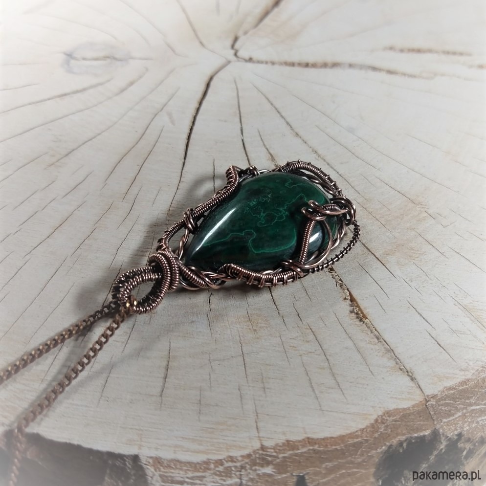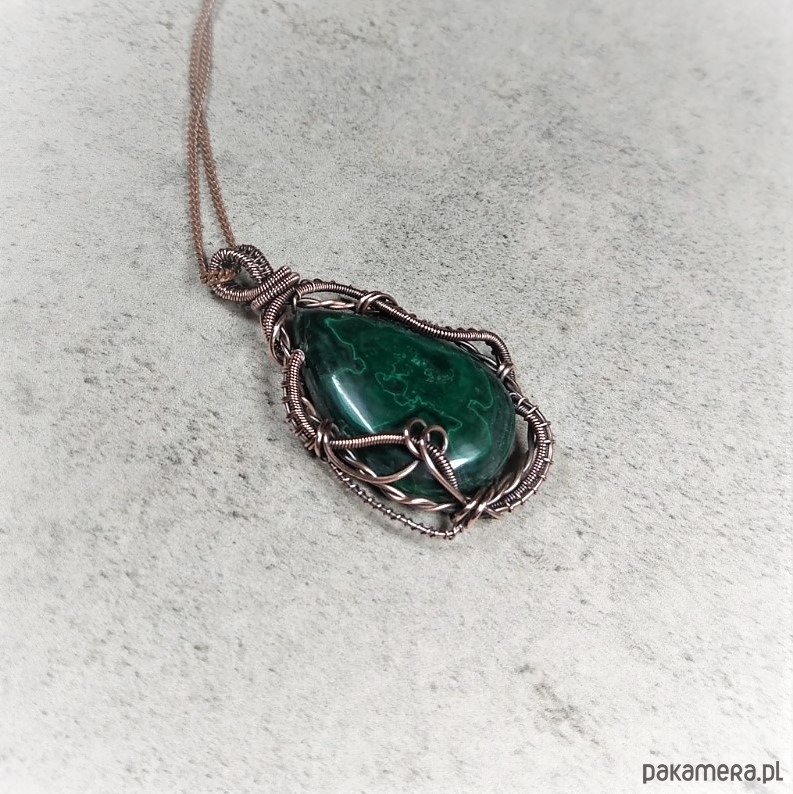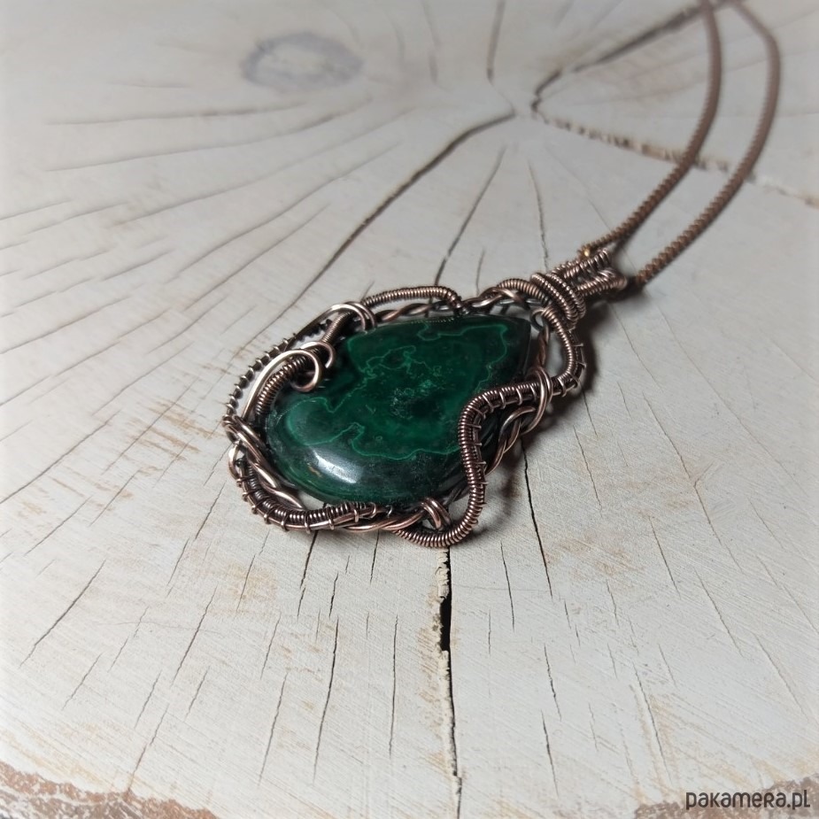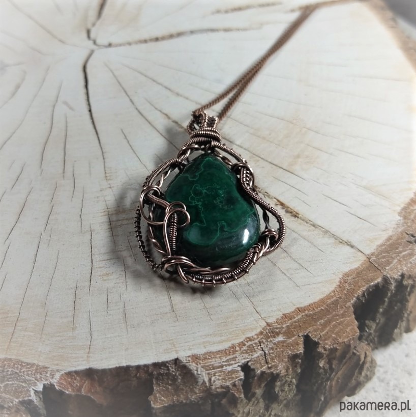 Zawieszka wykonana ręcznie metodą wire-wrappingu której głównym elementem jest naturalny malachit. Do wykonania wisiorka użyłam miedzi następnie zaoksydowałam i wypolerowałam w celu uzyskania szlachetnego efektu postarzenia. Wymiary zawieszki 58x35mm z łańcuszkiem długości około 48-50 cm.