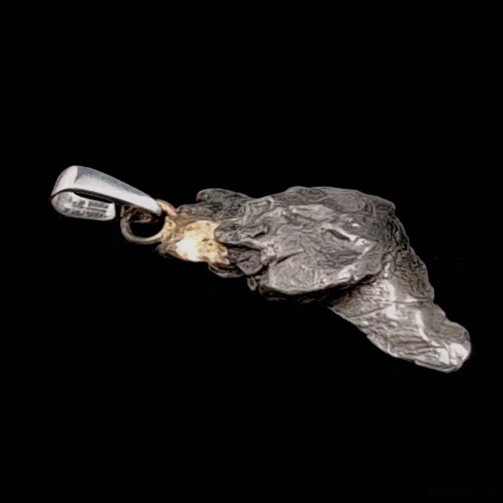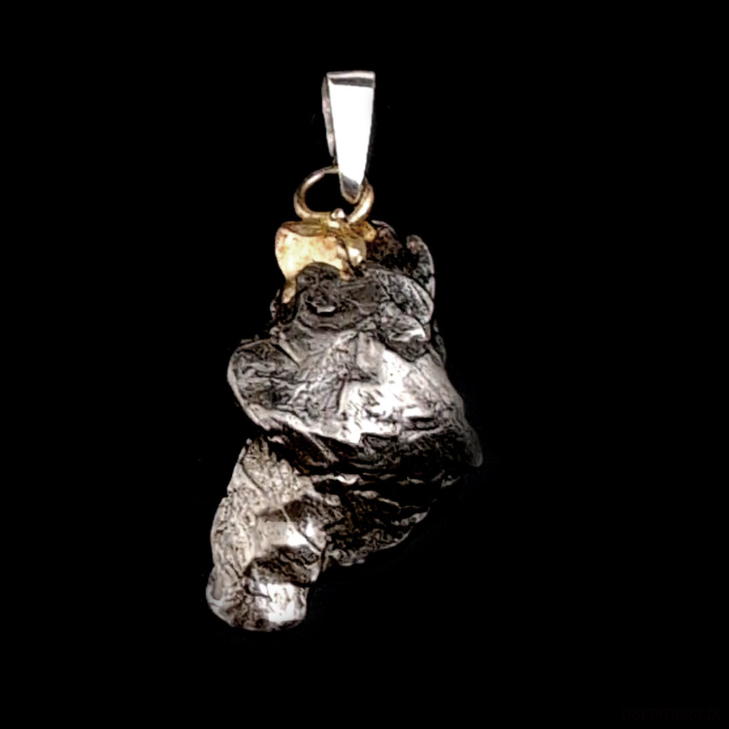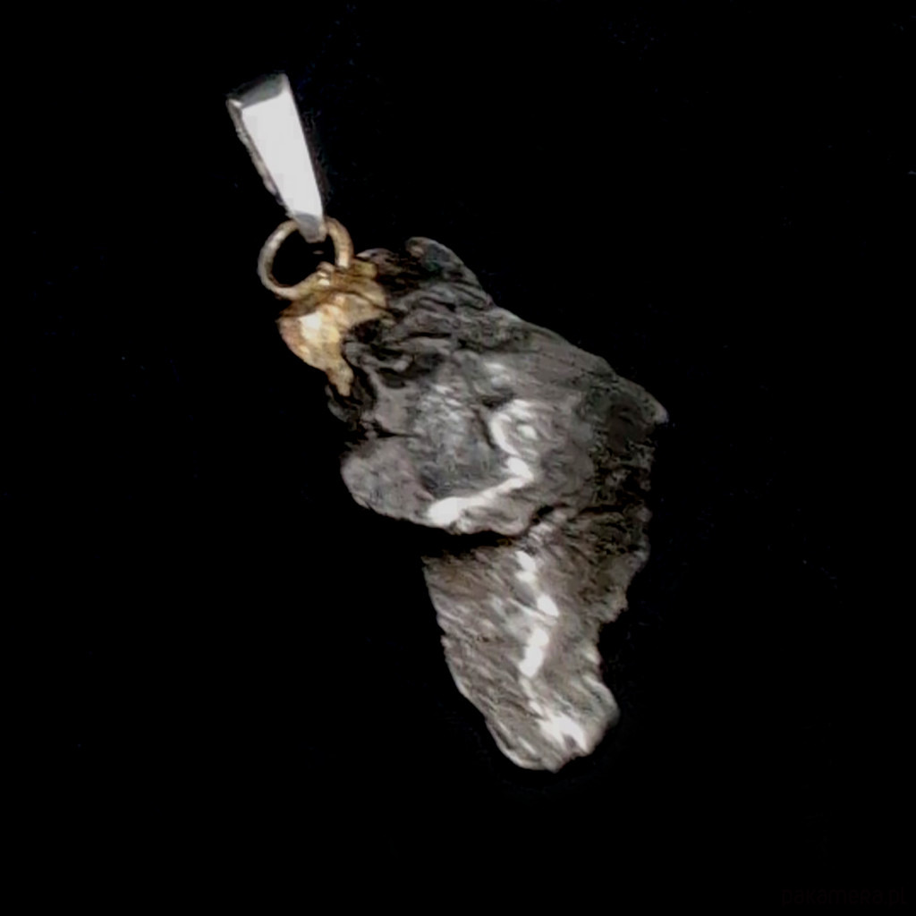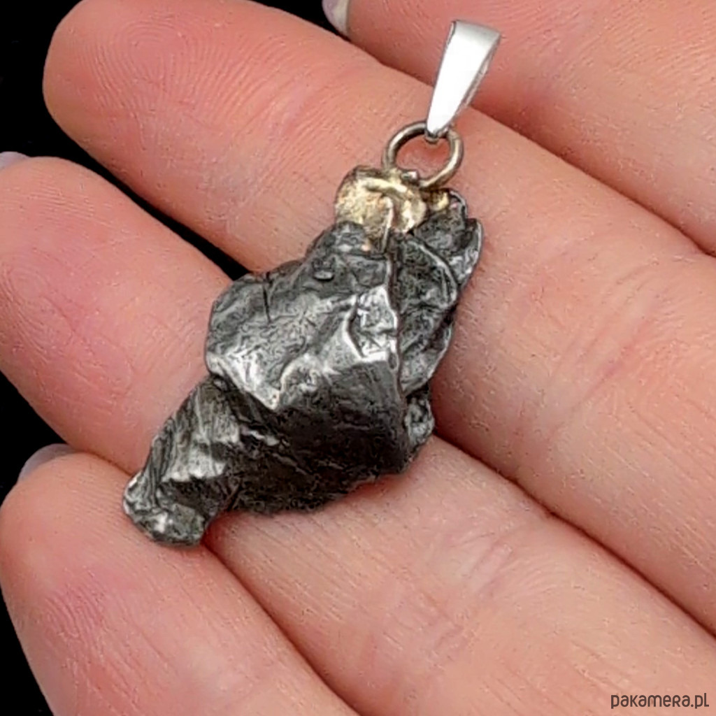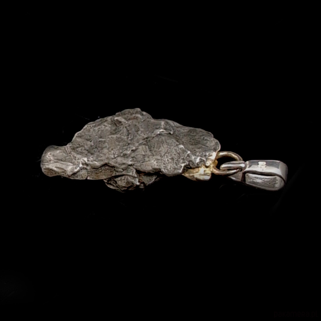 Wisiorek z meteorytem żelaznym Campo del Cielo, który znaleziono w 1576 roku w Argentynie. Krawatka srebro 925, oksydowane. Uniwersalny, dla niego lub dla niej. Wymiary 25 x 15 mm. Długość max 33 mm. Waga wisiora 6,5 g. Do meteorytu dołączona zostanie metryka z datą, miejscem spadku i wagą. Wisiorek zostanie zapakowany w ozdobne pudełeczko.