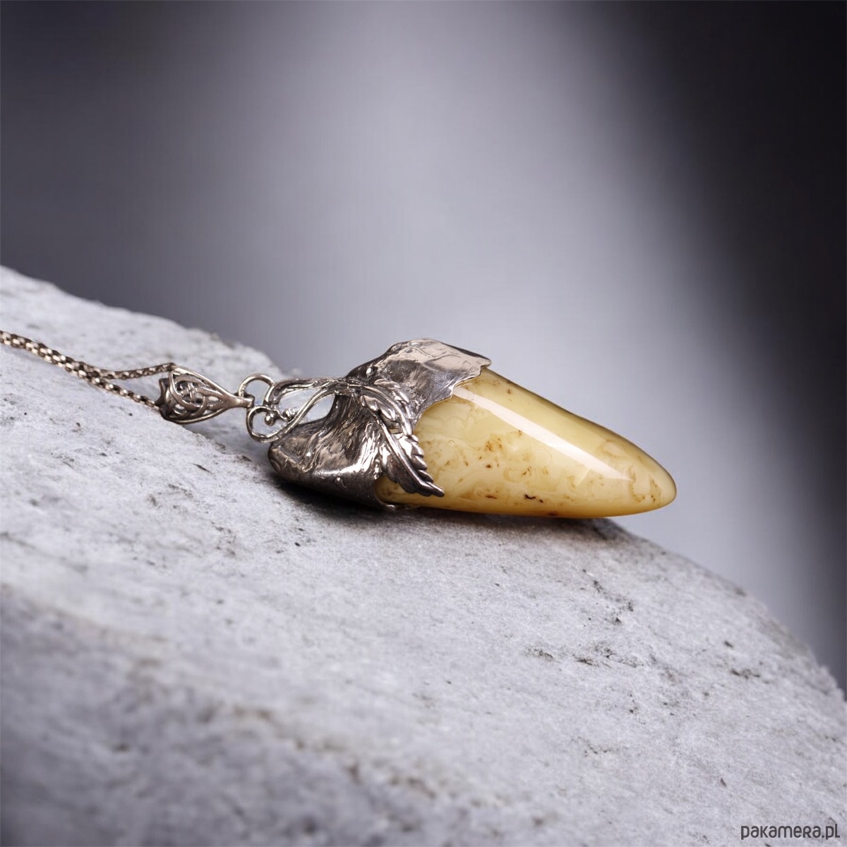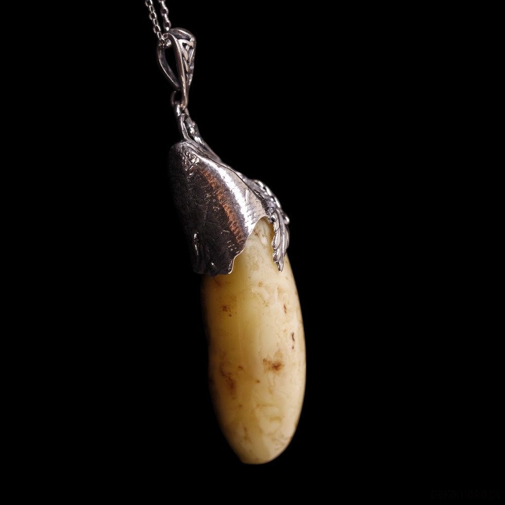 Ręcznie wykonany, efektowny wisiorek ze srebra z dużym bursztynem bałtyckim w jasnym, mlecznym odcieniu. Gładki, wydłużony kamień opływa plastyczna srebrna oprawa o organicznych liniach, dzięki czemu całość przypomina małą rzeźbę zawieszoną na łańcuszku. To wyrazista biżuteria, która pięknie prezentuje się na prostych, gładkich tkaninach.