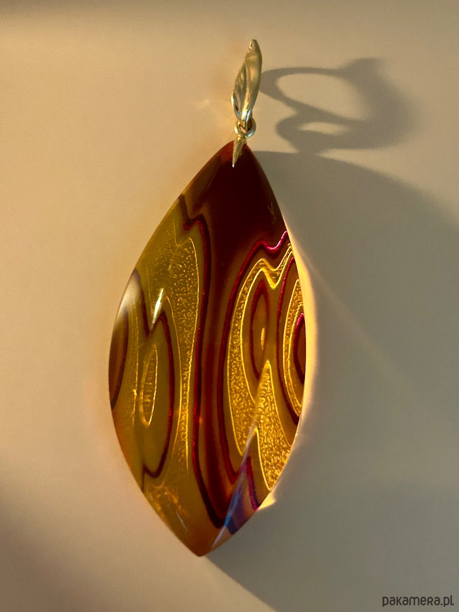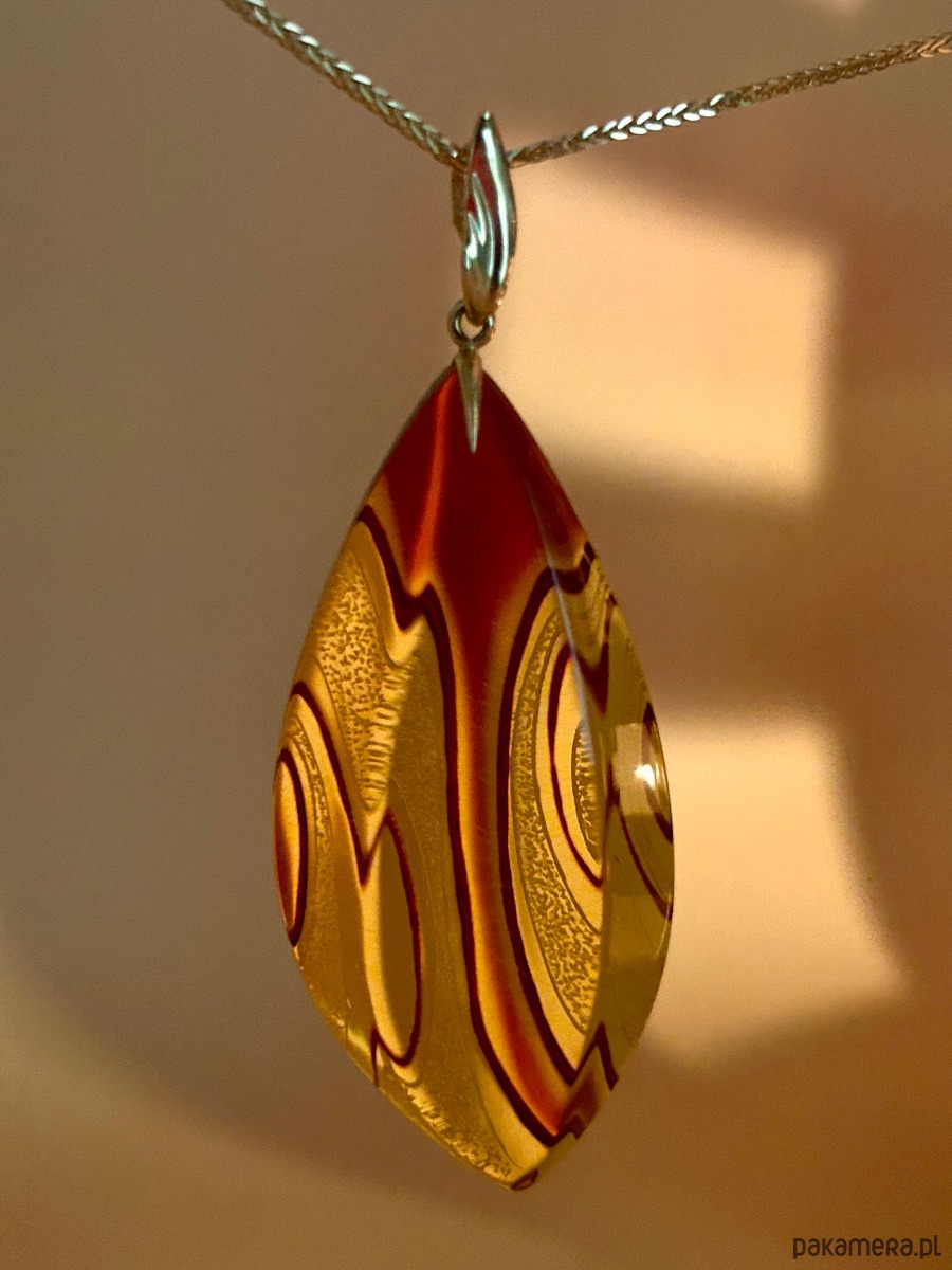 Wyjątkowy wisiorek wykonany z naturalnego bursztynu bałtyckiego, ręcznie rzeźbionego, dzięki czemu jego powierzchnia zyskuje niezwykłą głębię i dynamiczny rysunek. Naturalne warstwy bursztynu układają się w falujące, organiczne linie w odcieniach miodowego złota i ciepłej czerwieni, tworząc niepowtarzalną kompozycję inspirowaną naturą.
