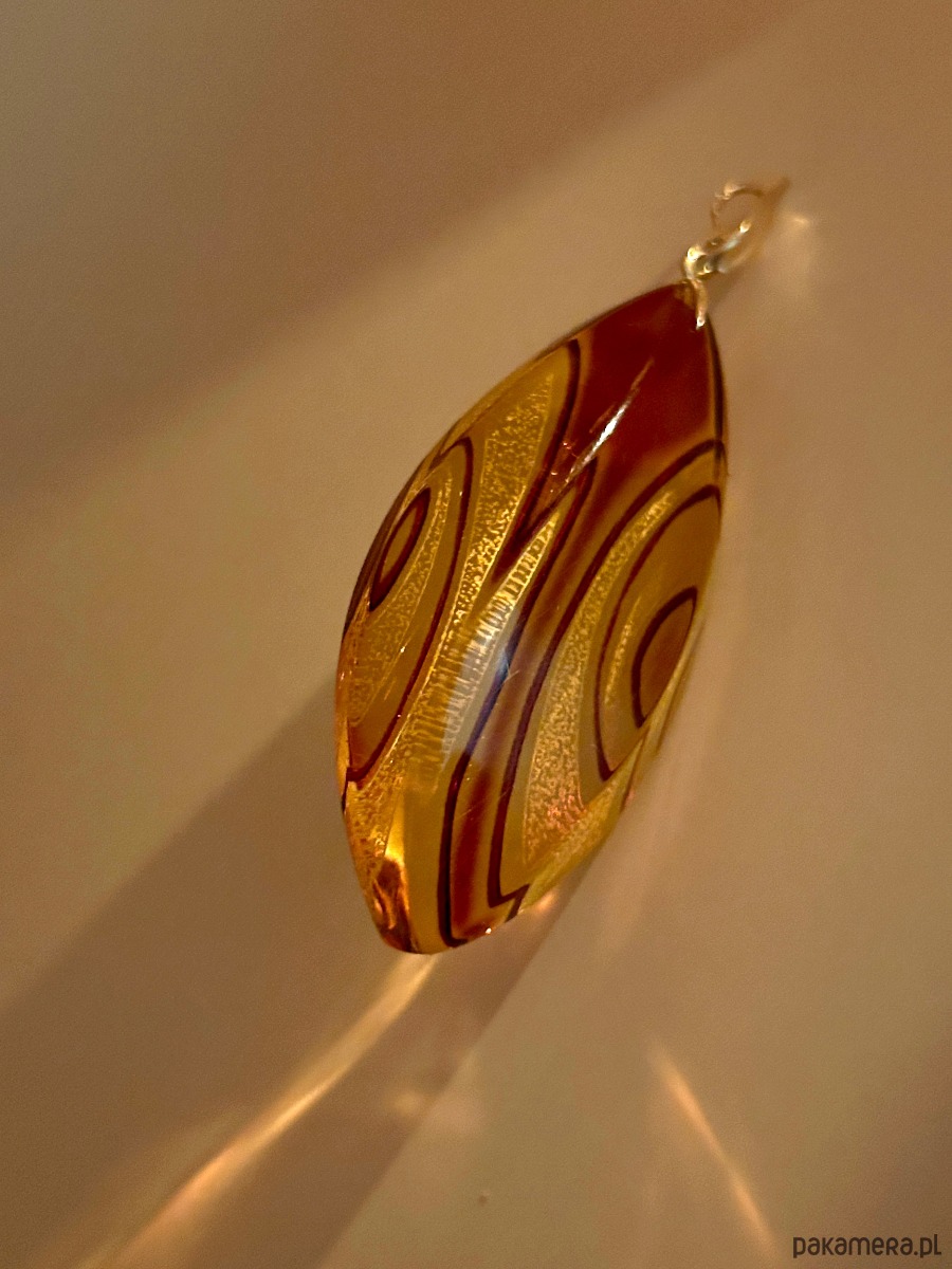Smukła, wydłużona forma podkreśla elegancję wisiorka, a każdy egzemplarz jest unikatem — nie ma dwóch identycznych wzorów. Bursztyn pięknie reaguje na światło, subtelnie zmieniając charakter w zależności od kąta patrzenia.