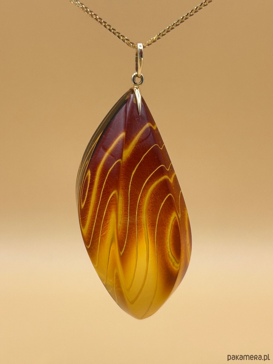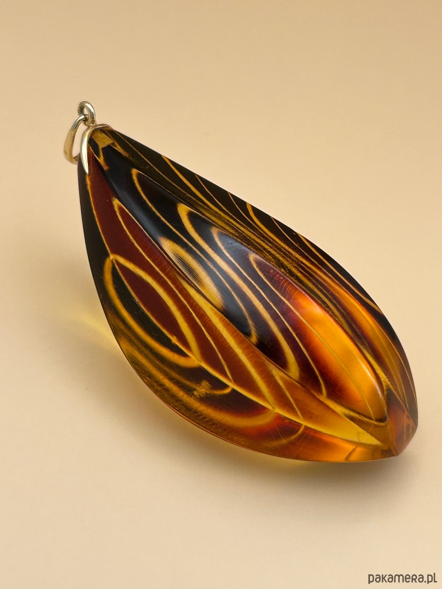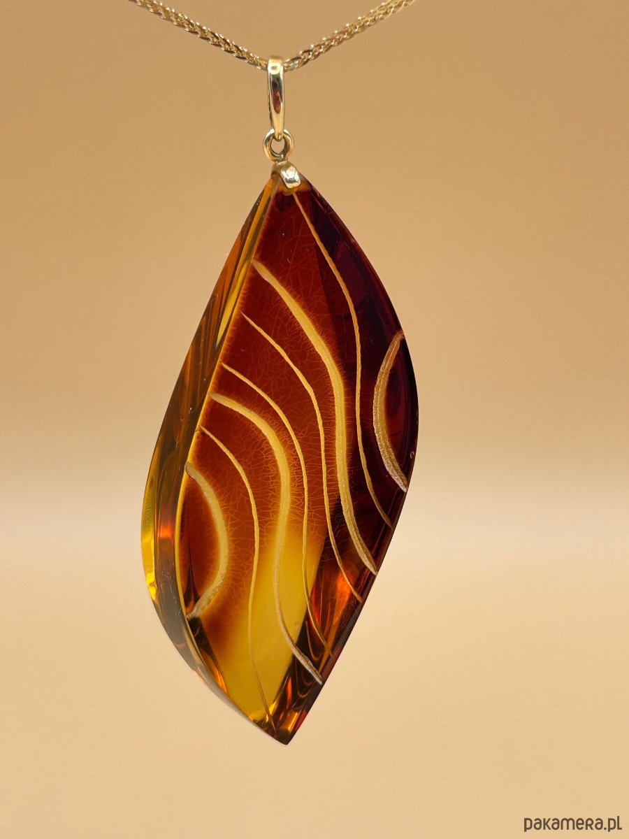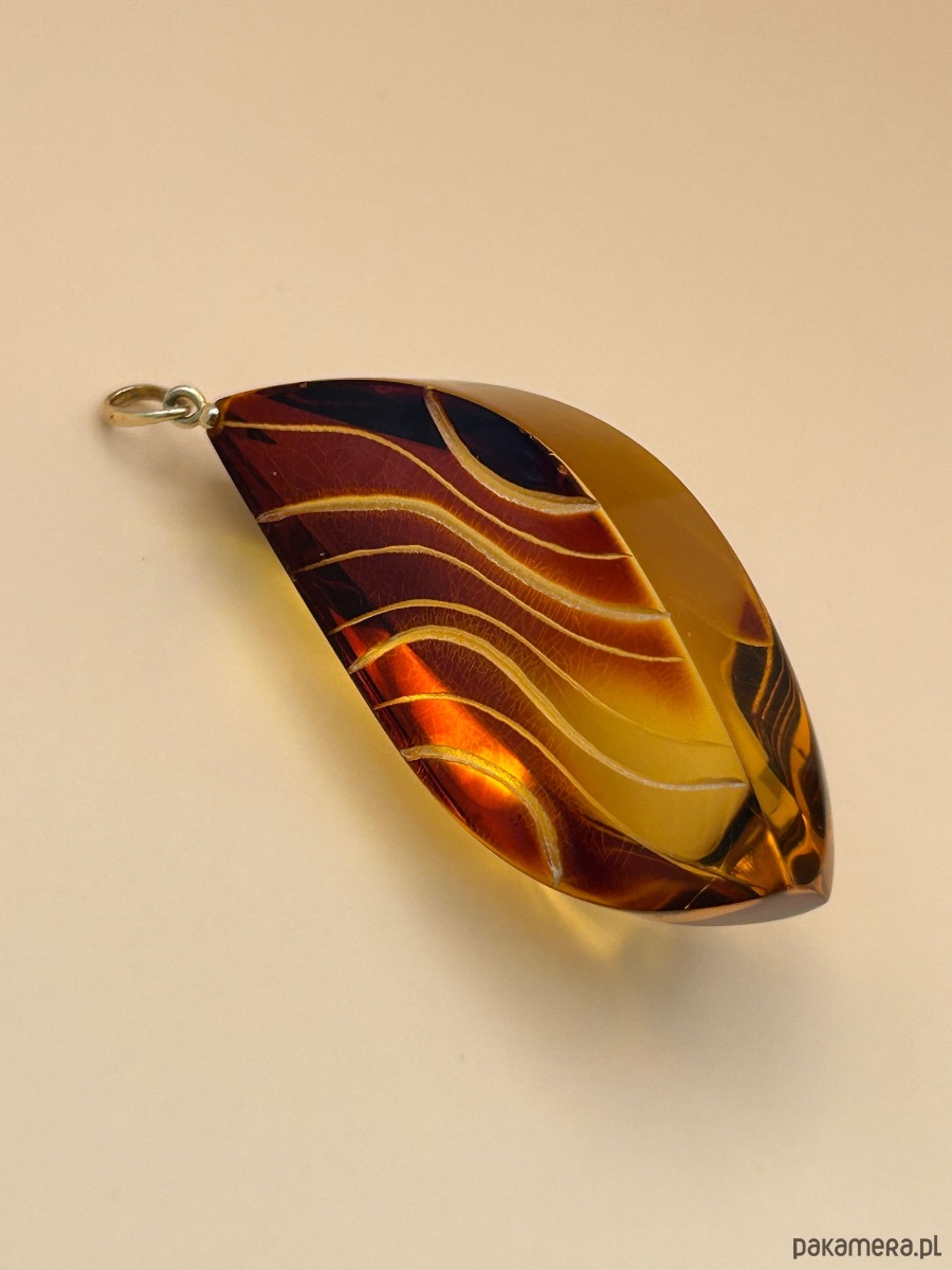Unikatowy wisiorek wykonany z wysokiej jakości bursztynu bałtyckiego o głębokiej, miodowo-koniakowej barwie. Bursztyn został precyzyjnie wyrzeźbiony w formie smukłej, skręcanej kropli, co pięknie podkreśla jego naturalne pasma i przejścia kolorystyczne. Rzeźbione linie tworzą dekoracyjny, falisty wzór, który pod światło wydobywa ciepły żar i charakterystyczny blask bursztynu.
