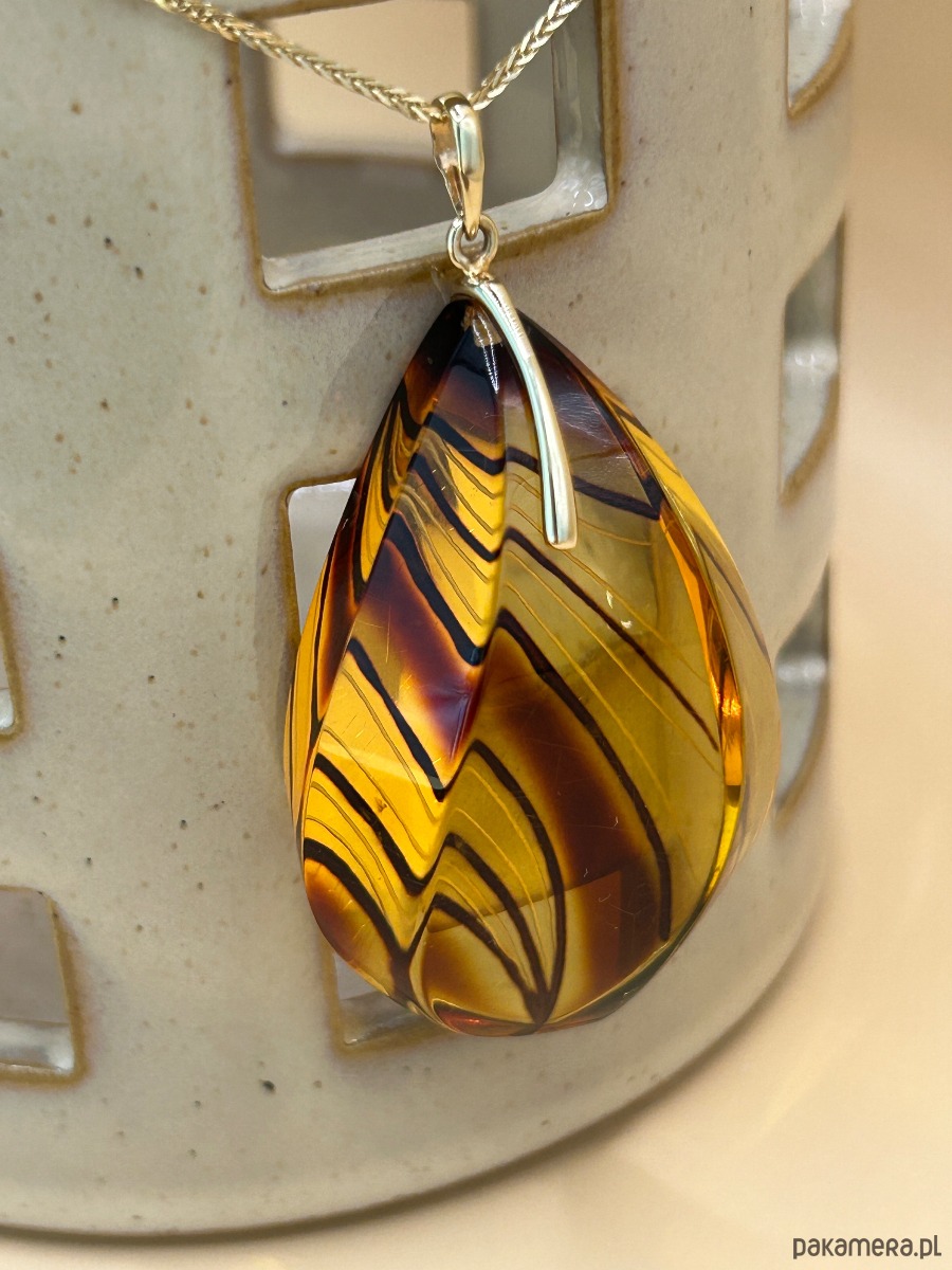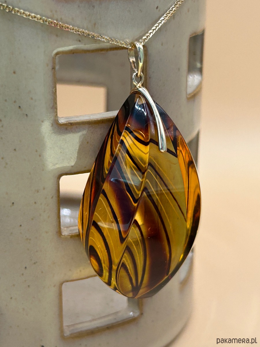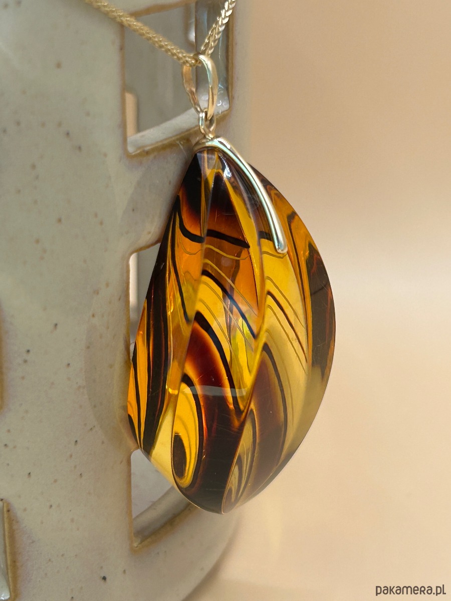 Ten wyjątkowy wisior z ręcznie rzeźbionego bałtyckiego bursztynu zachwyca dynamicznym rysunkiem i głębią barw. W bursztynie układają się naturalne fale miodu, karmelu i ciemniejszych tonów, które tworzą efekt niemal malarskiej kompozycji. Każde załamanie i linia podkreśla kunszt ręcznego szlifowania, dzięki czemu wisior pięknie odbija światło i prezentuje się inaczej z każdego kąta.