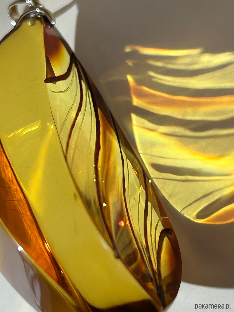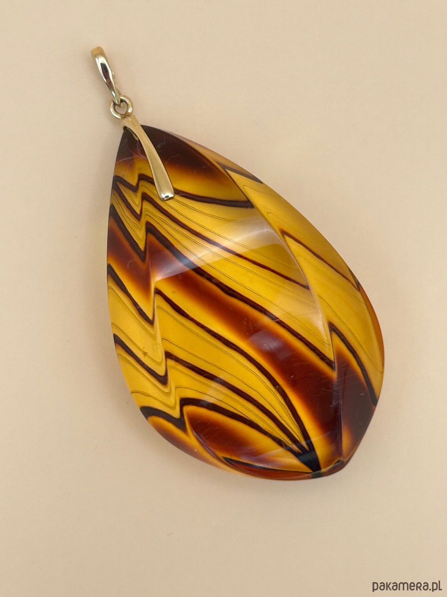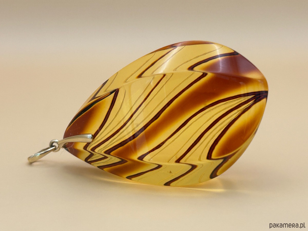Ten wyjątkowy wisior z ręcznie rzeźbionego bałtyckiego bursztynu zachwyca dynamicznym rysunkiem i głębią barw. W bursztynie układają się naturalne fale miodu, karmelu i ciemniejszych tonów, które tworzą efekt niemal malarskiej kompozycji. Każde załamanie i linia podkreśla kunszt ręcznego szlifowania, dzięki czemu wisior pięknie odbija światło i prezentuje się inaczej z każdego kąta.