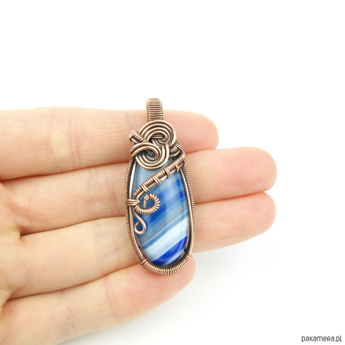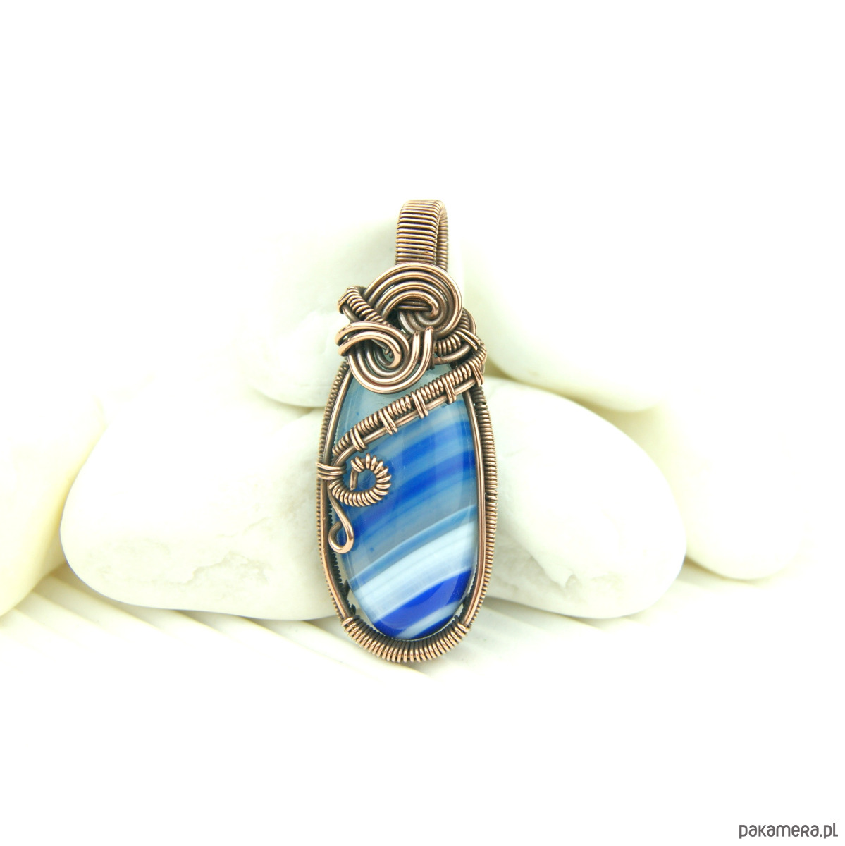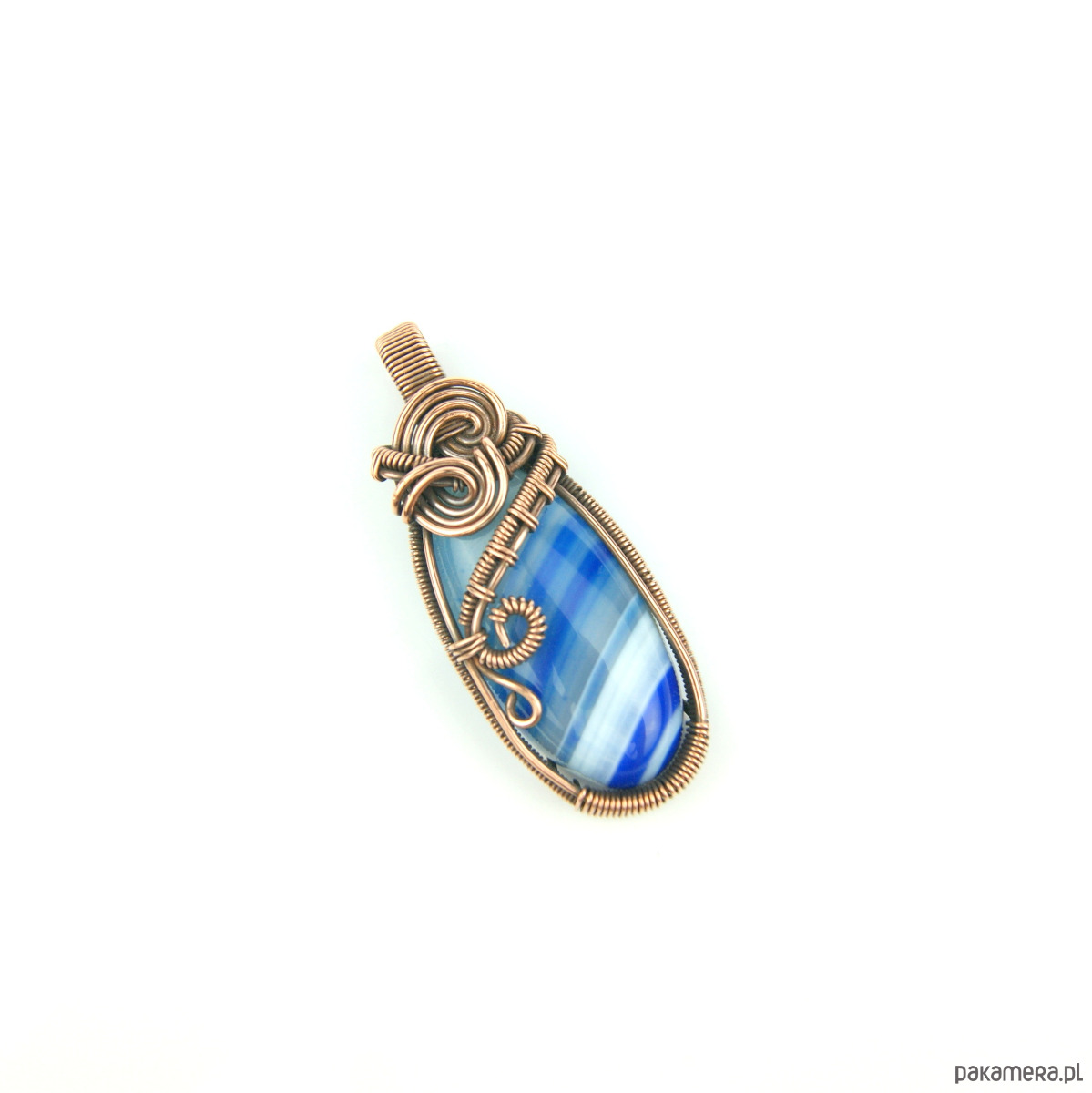 Wisiorek powstał z agatu o niebieskiej barwie. Całość misternie opleciono miedzią. Biżuteria oksydowana.