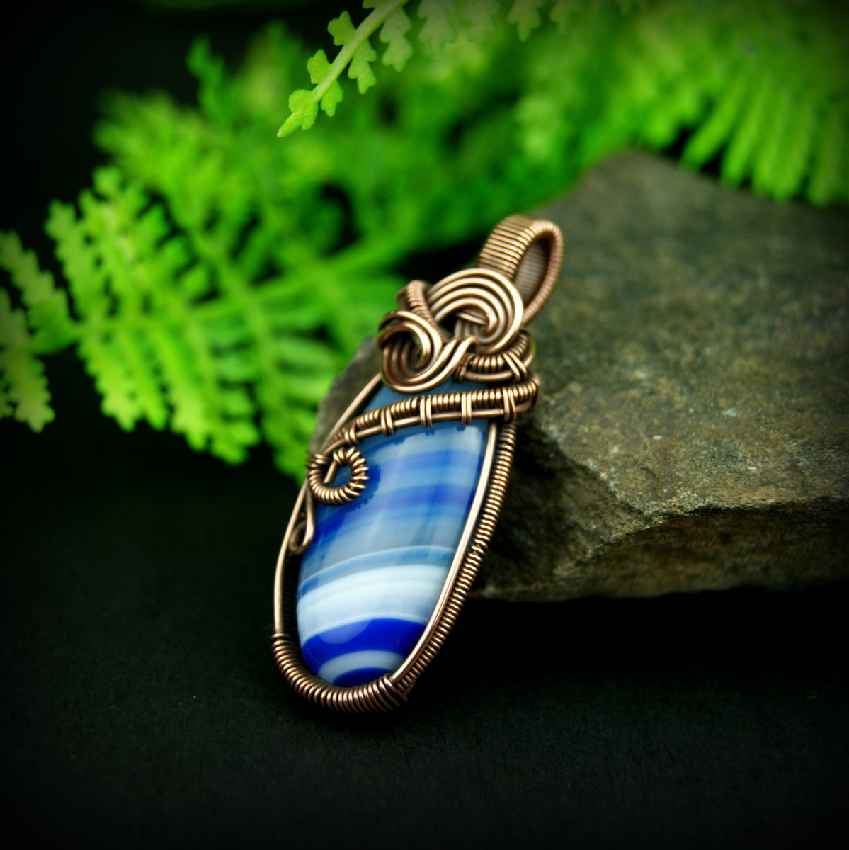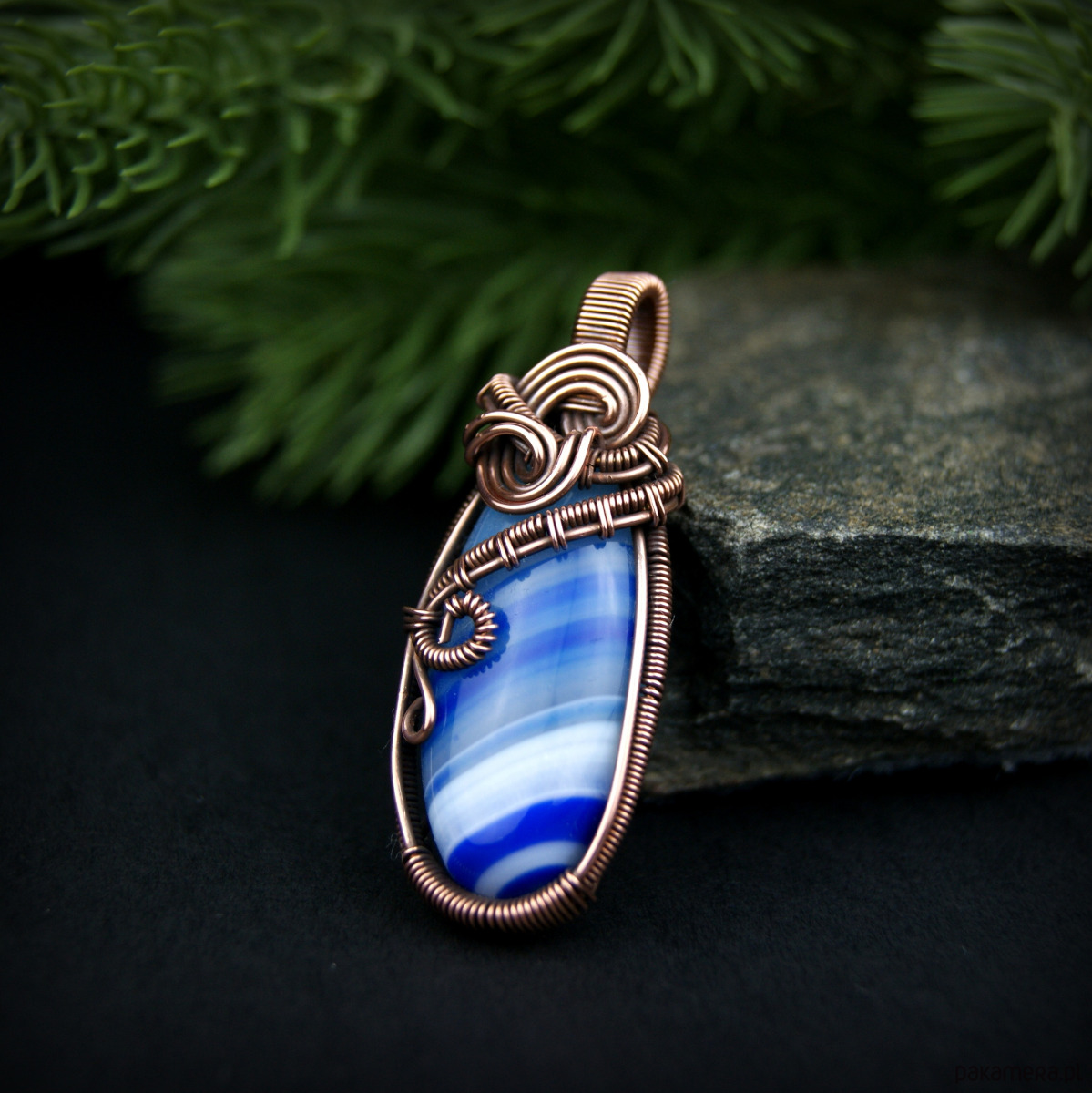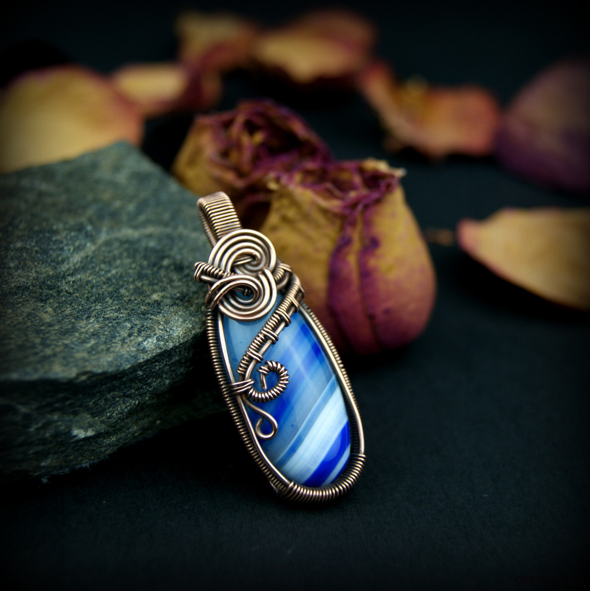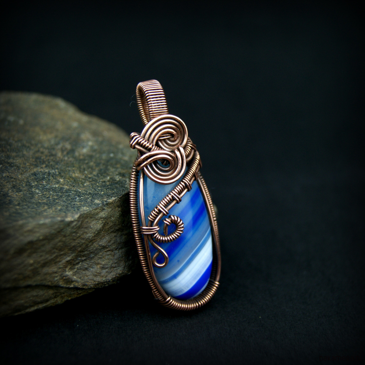 Wisiorek powstał z agatu o niebieskiej barwie. Całość misternie opleciono miedzią. Biżuteria oksydowana.