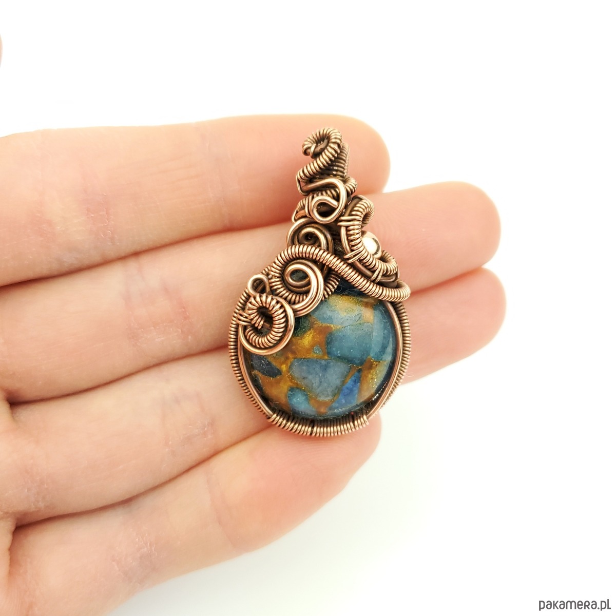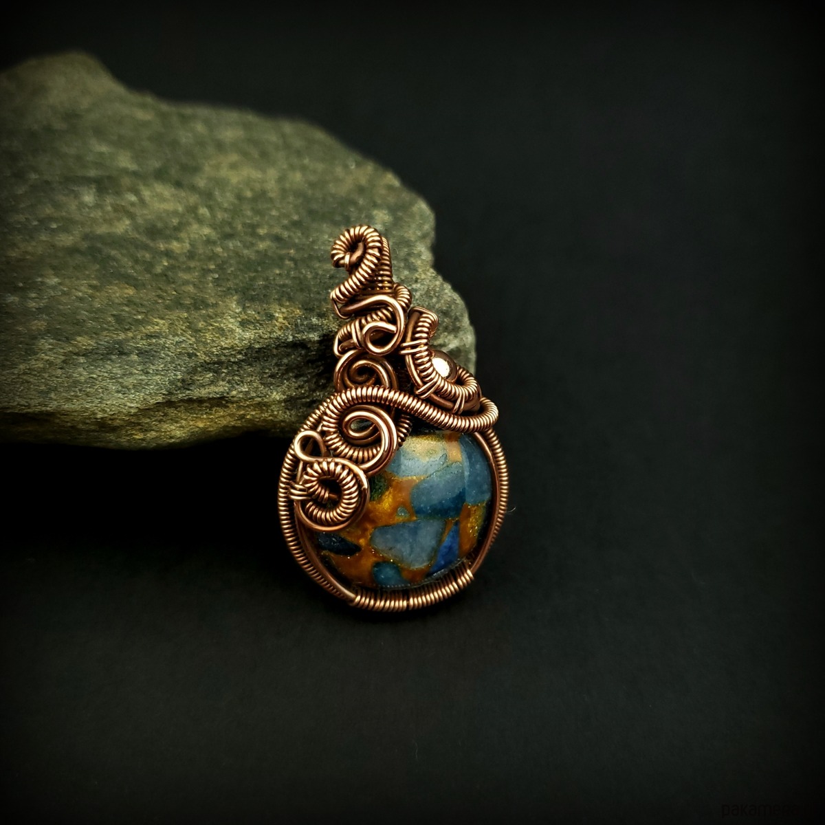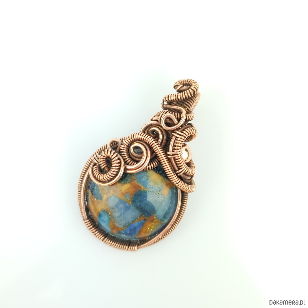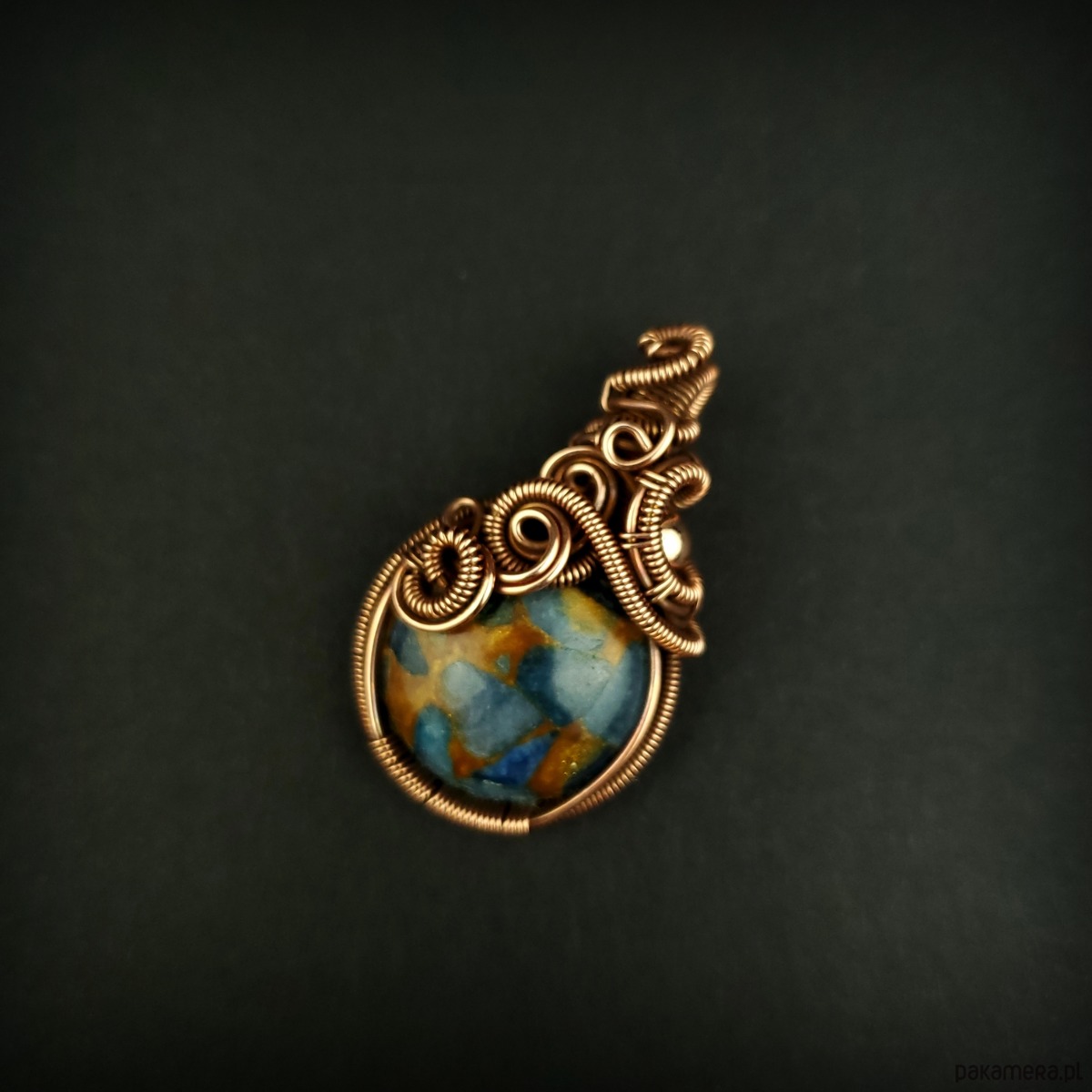 Wisiorek powstał z kamienia rekonstruowanego - fragmenty agatu zostały połączone żywicą i uformowane w okrągły kaboszon. Całość misternie opleciono miedzią. Biżuteria oksydowana.
