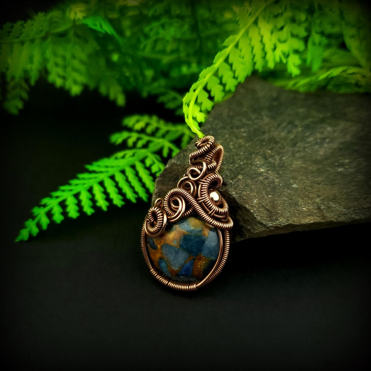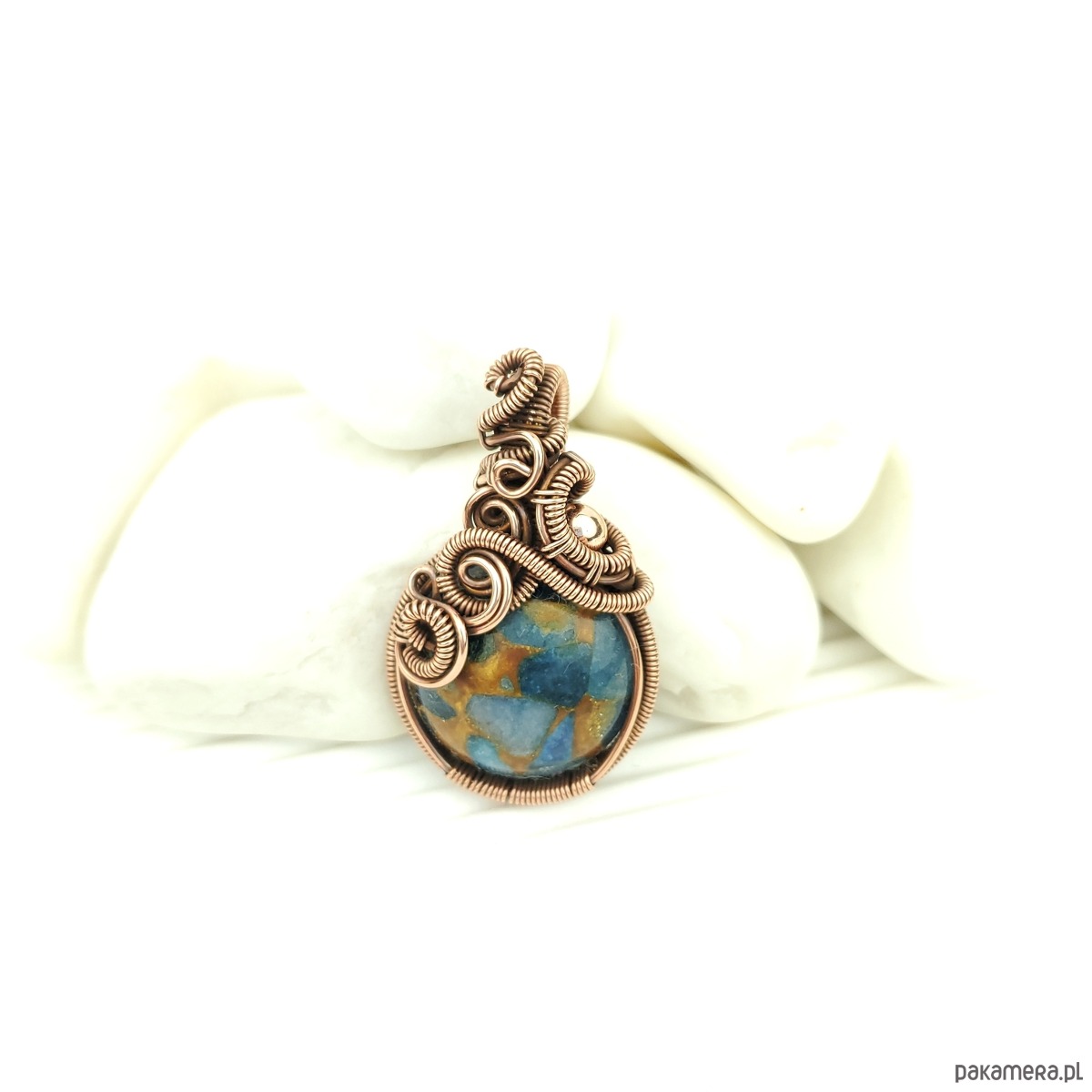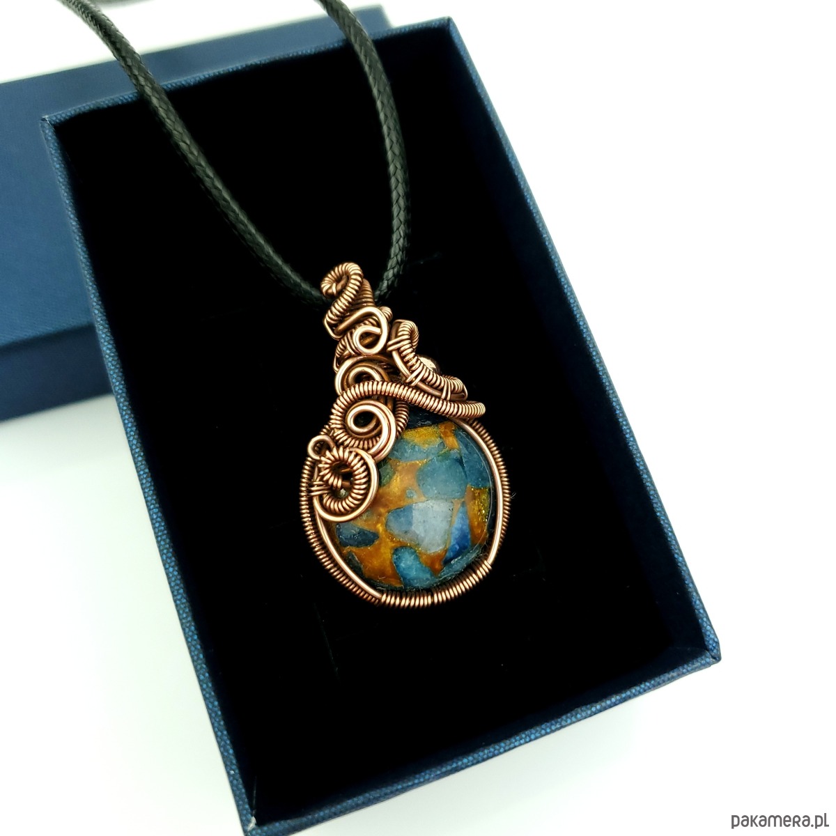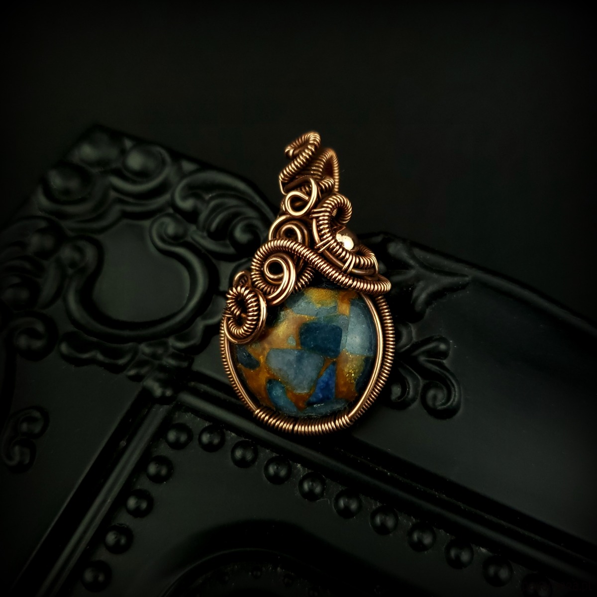 Wisiorek powstał z kamienia rekonstruowanego - fragmenty agatu zostały połączone żywicą i uformowane w okrągły kaboszon. Całość misternie opleciono miedzią. Biżuteria oksydowana.