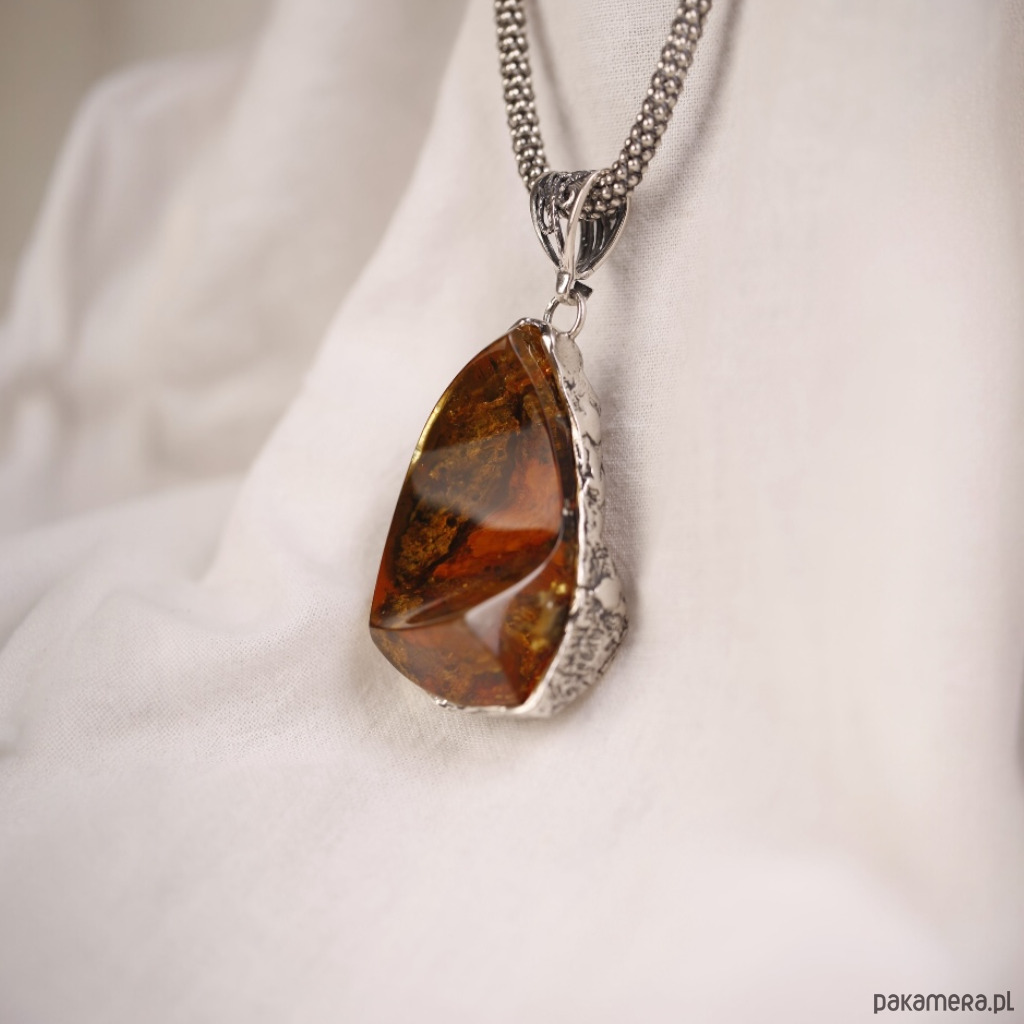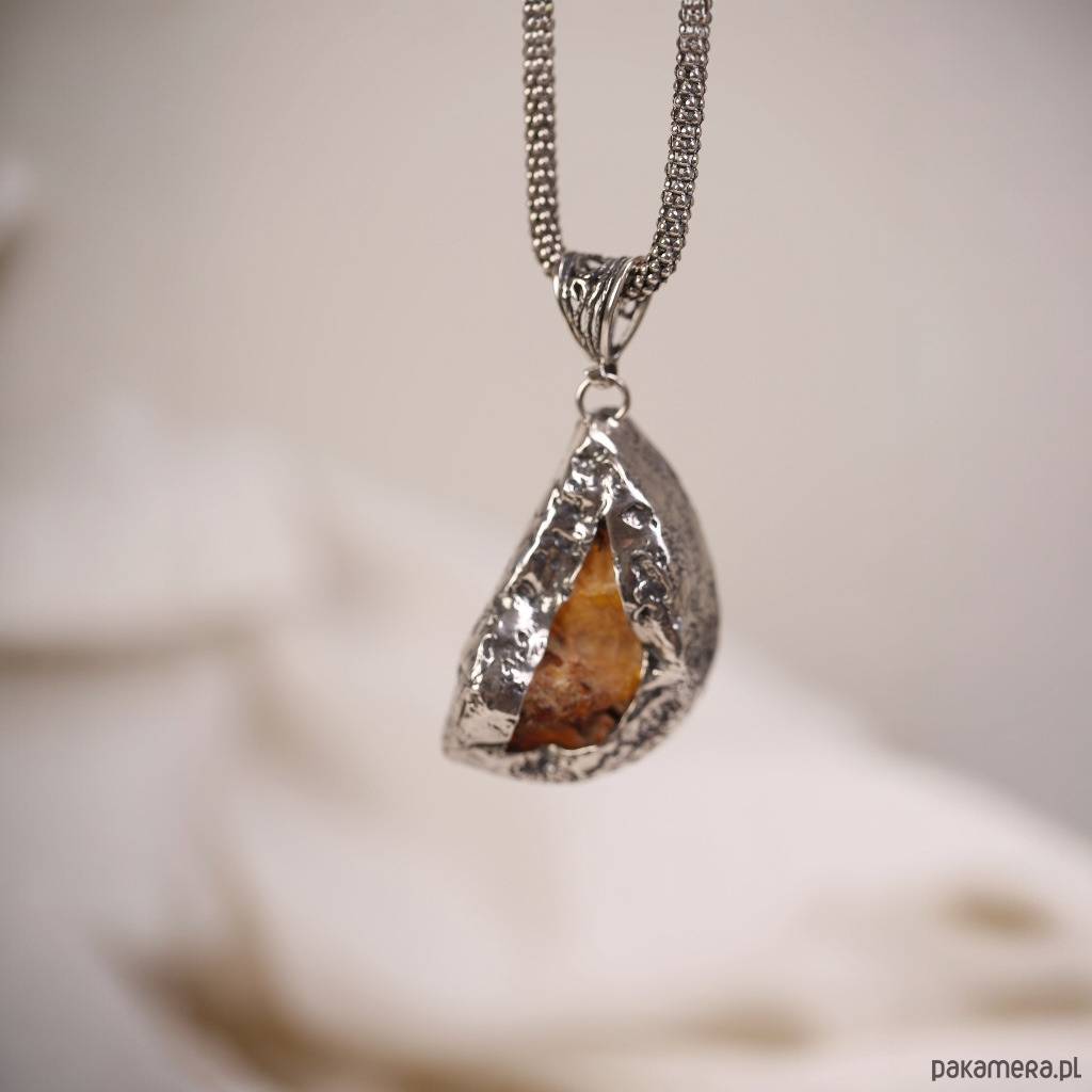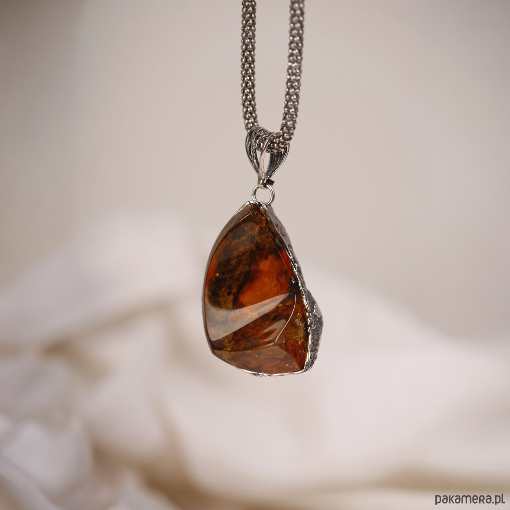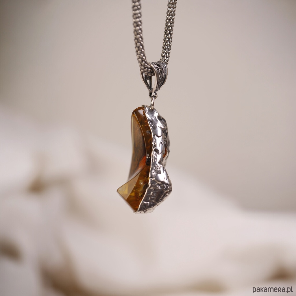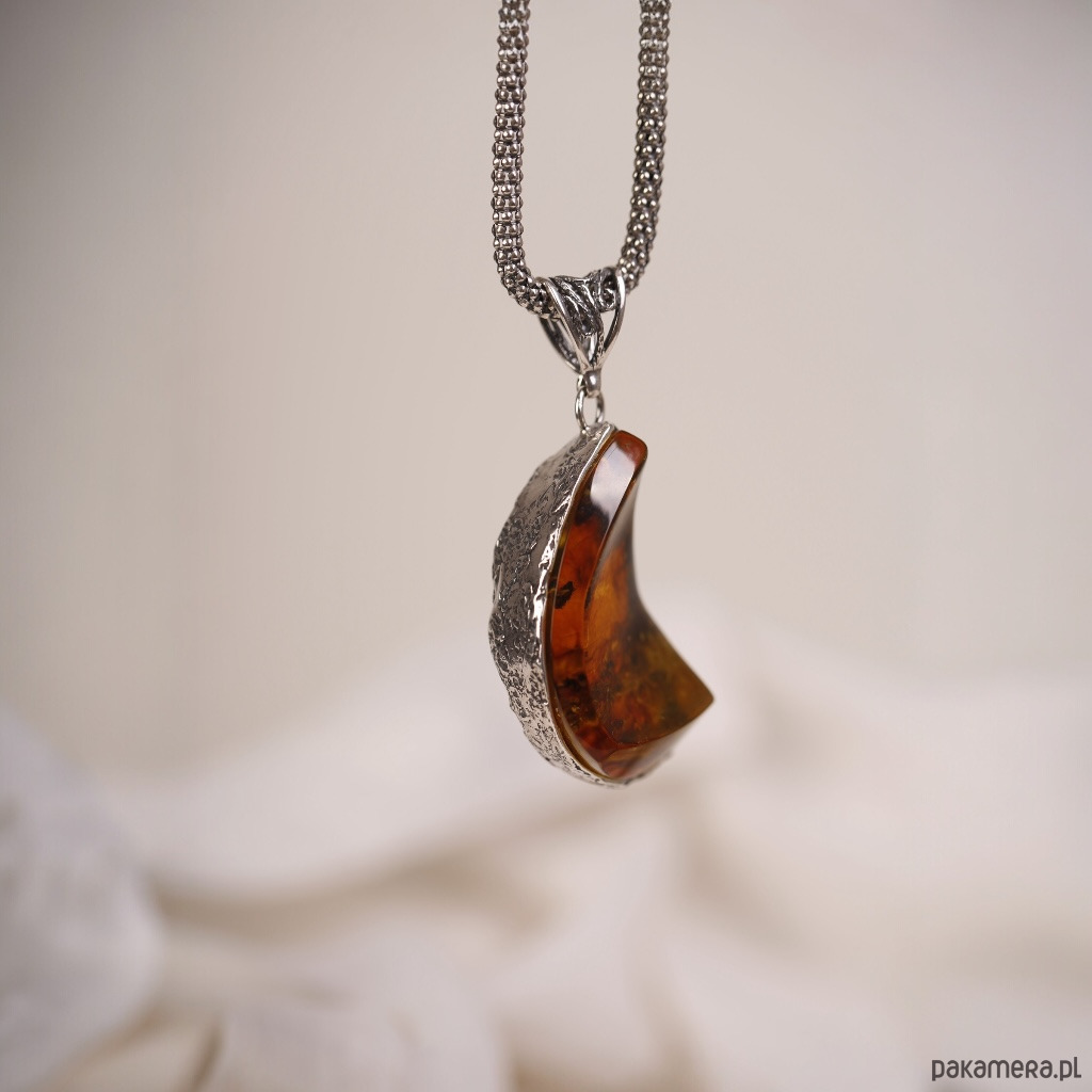 Ręcznie wykonany wisiorek z bursztynem bałtyckim o nieregularnym, lekko półksiężycowym kształcie. Ciepły koniakowy bursztyn pięknie mieni się przy każdym ruchu, a srebrna oprawa podkreśla jego naturalne inkluzje i głębię koloru. To wyrazista, ale nadal bardzo elegancka biżuteria, która świetnie wygląda na prostych, jasnych tkaninach.