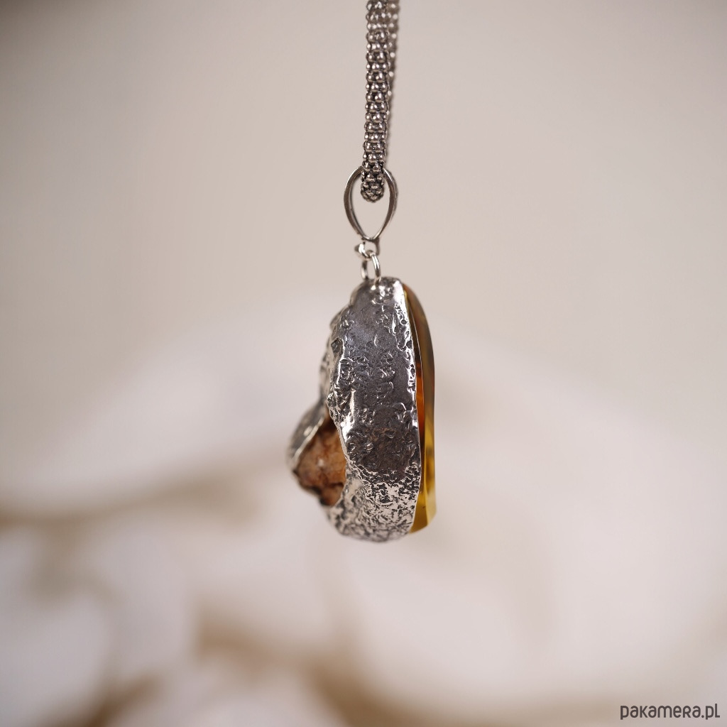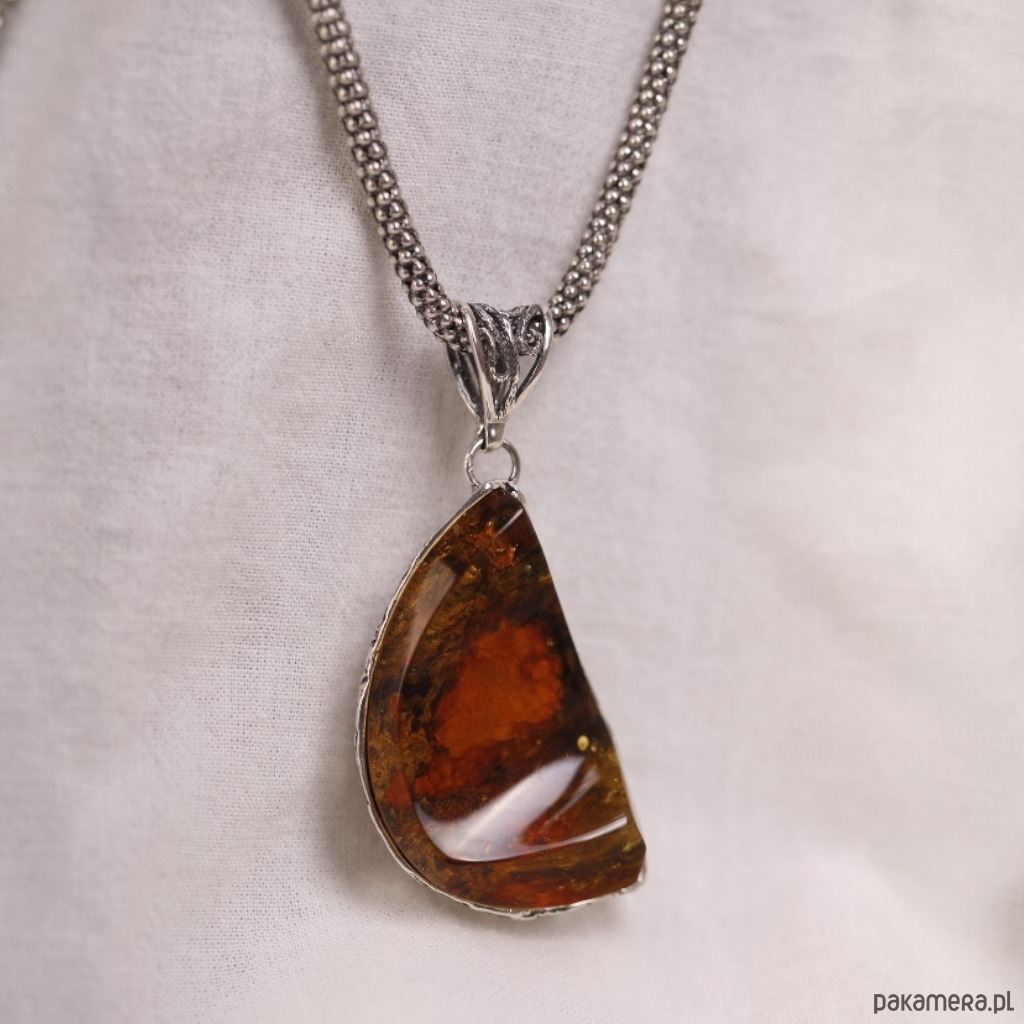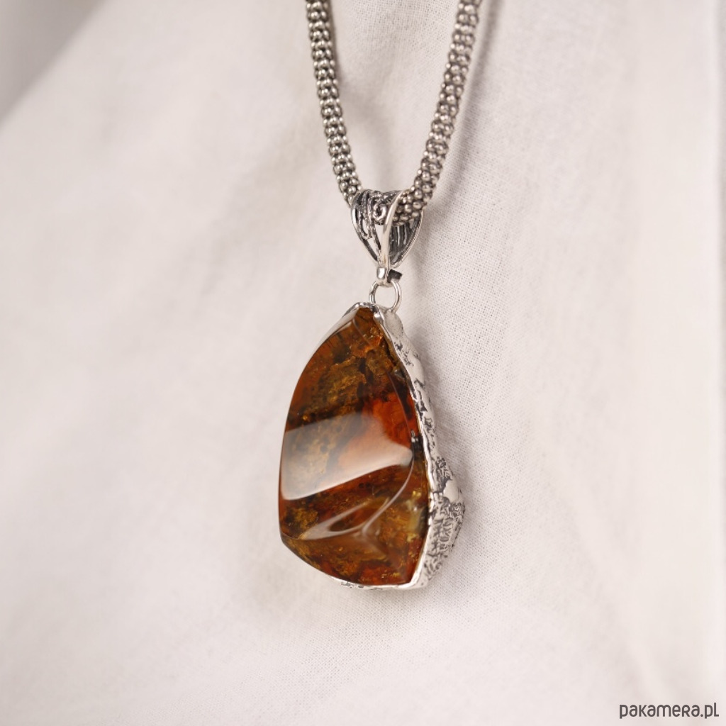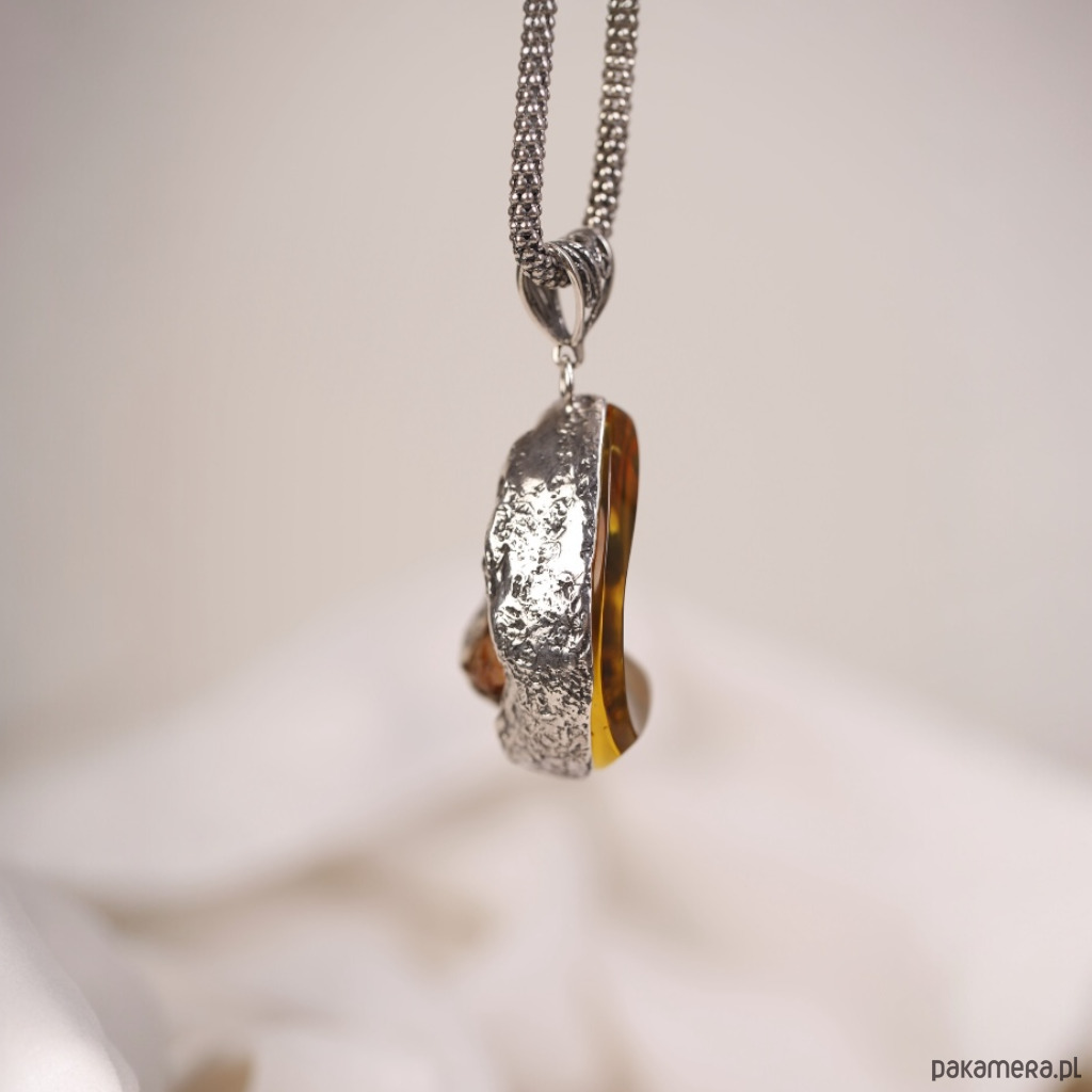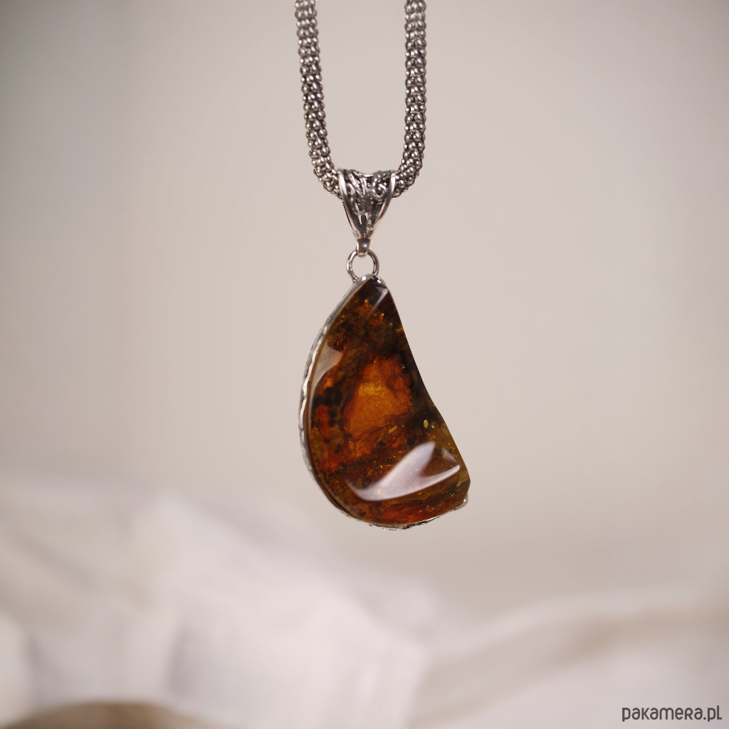 Ręcznie wykonany wisiorek z bursztynem bałtyckim o nieregularnym, lekko półksiężycowym kształcie. Ciepły koniakowy bursztyn pięknie mieni się przy każdym ruchu, a srebrna oprawa podkreśla jego naturalne inkluzje i głębię koloru. To wyrazista, ale nadal bardzo elegancka biżuteria, która świetnie wygląda na prostych, jasnych tkaninach.