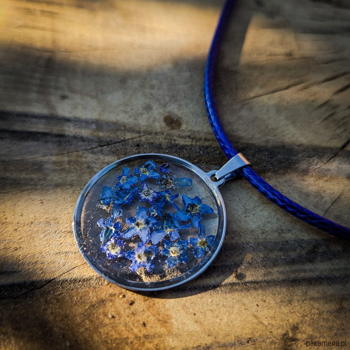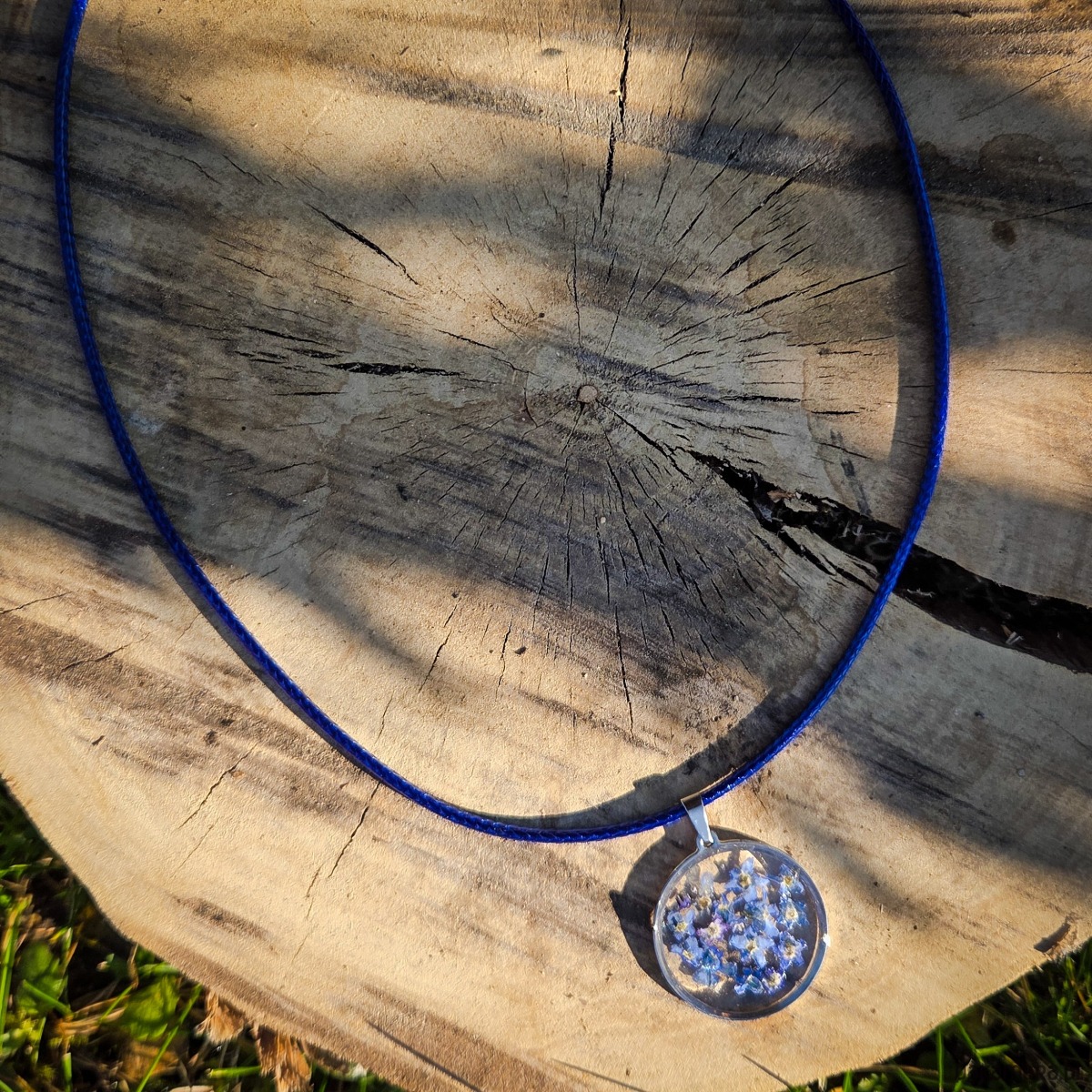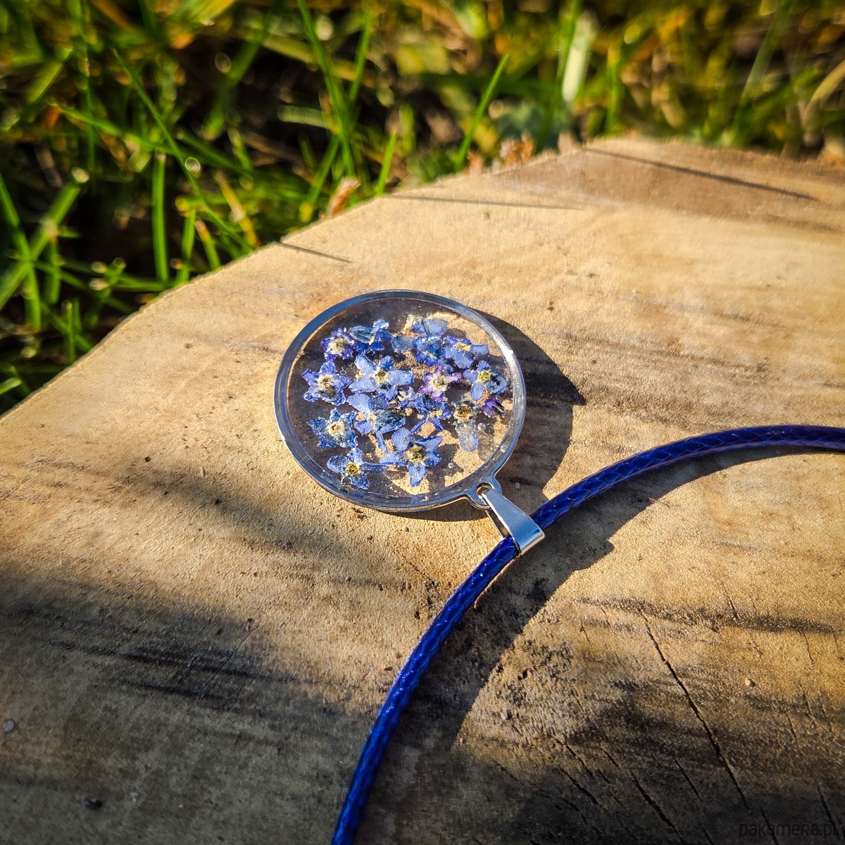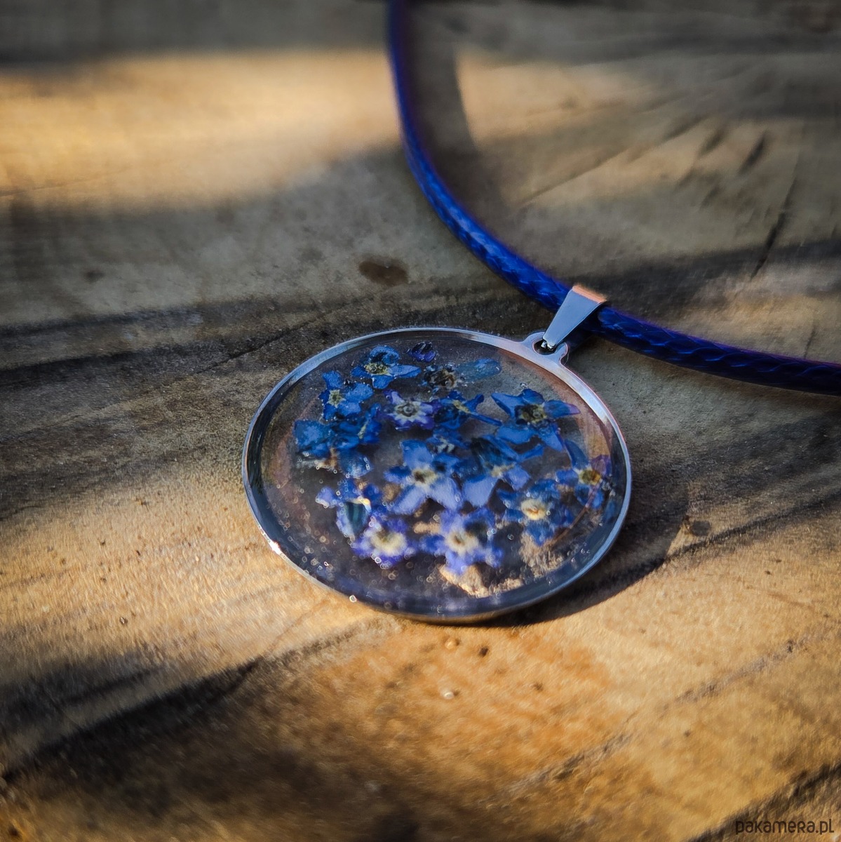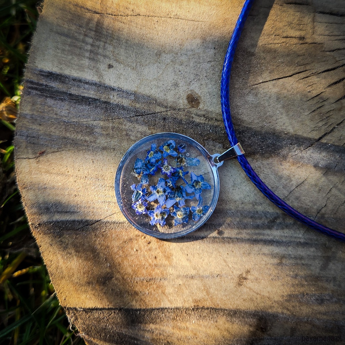 Zawieszka z zatopionymi w żywicy epoksydowej płatkami niezapominajek.