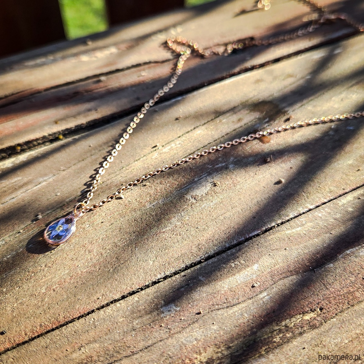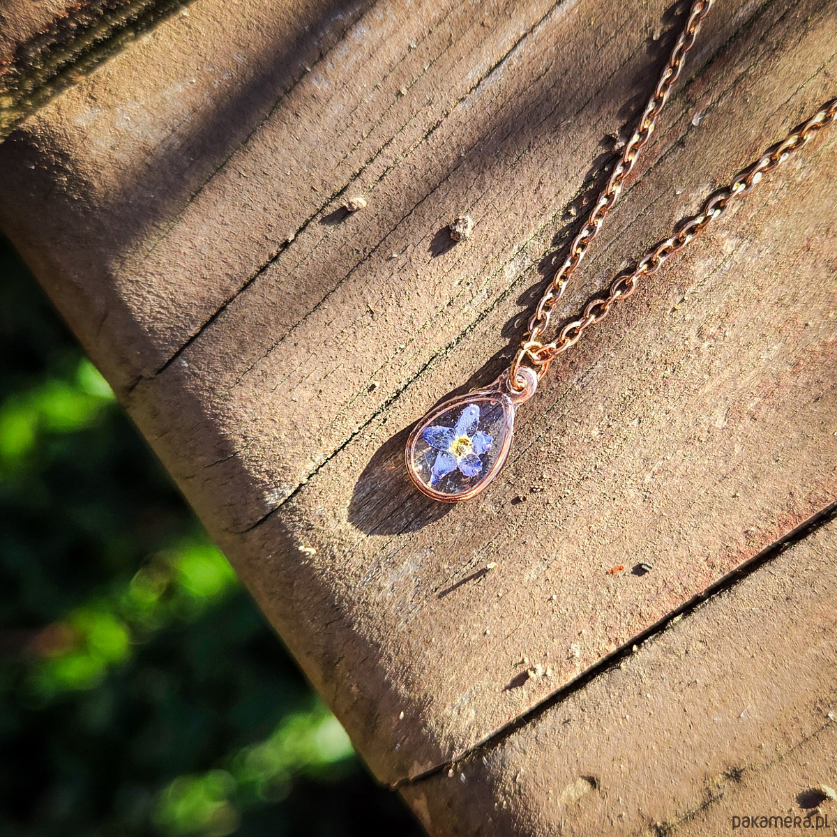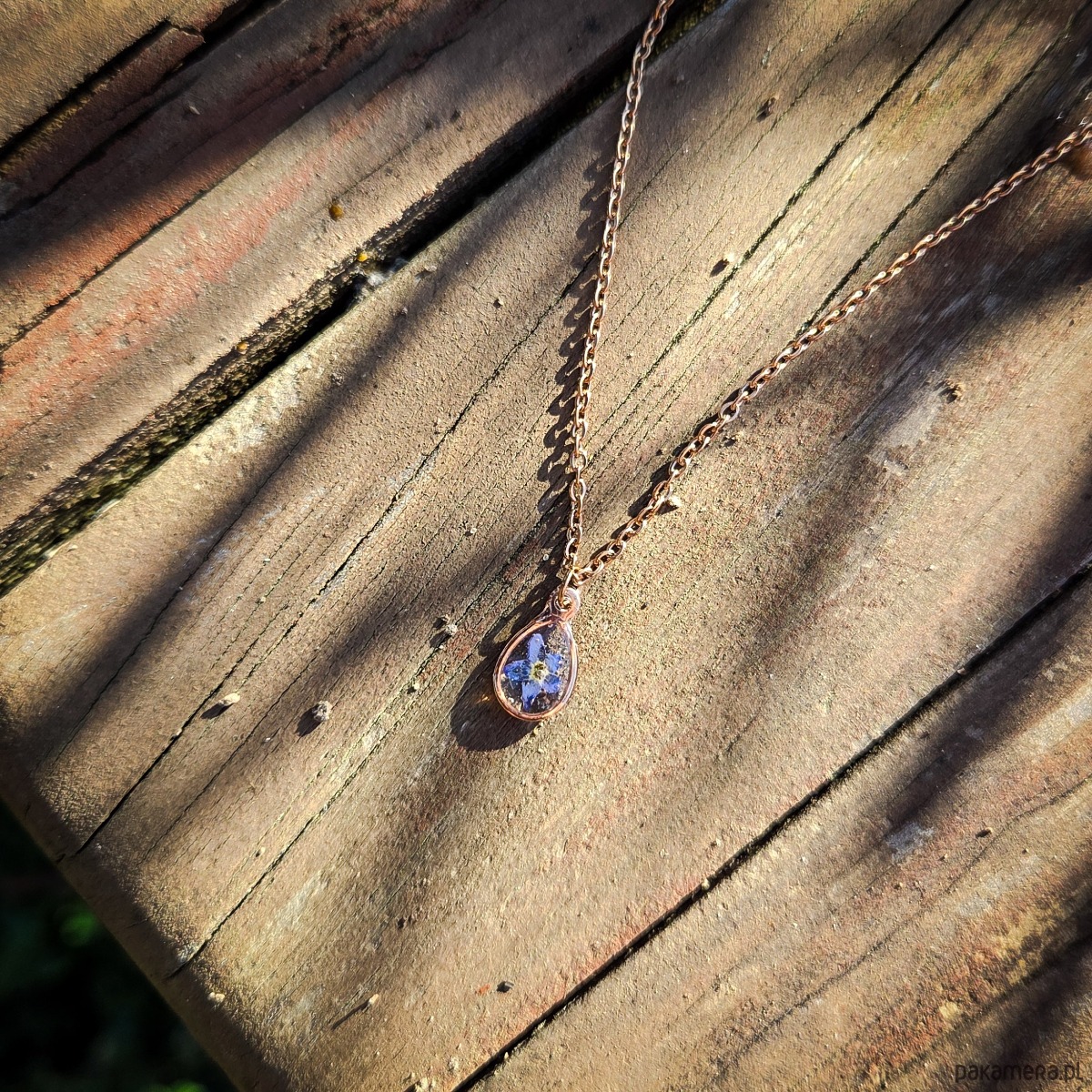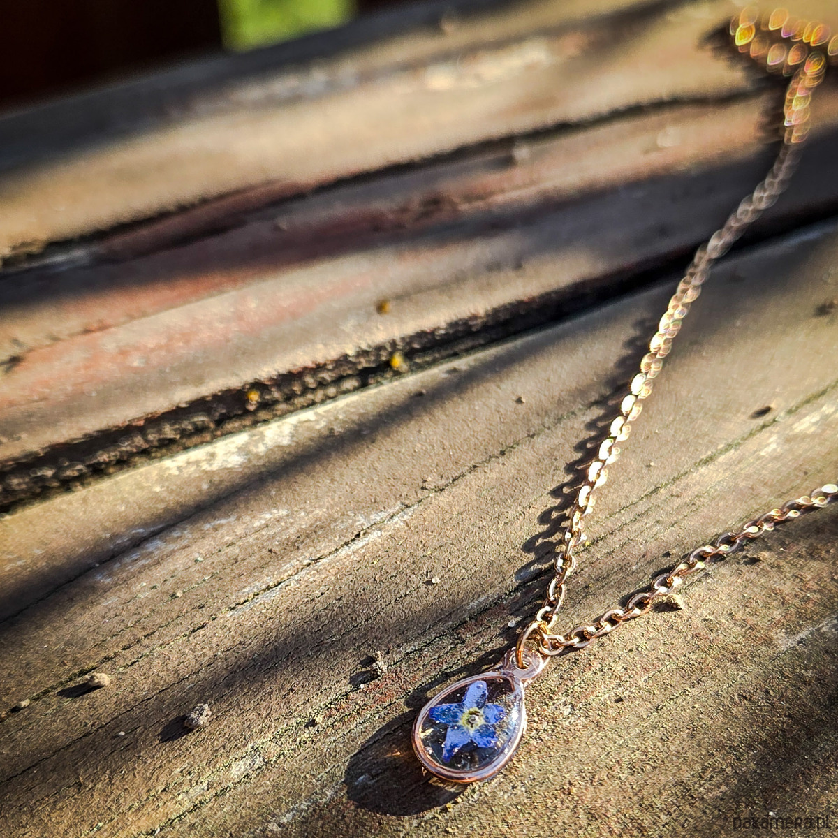 Zawieszka z zatopionymi w żywicy epoksydowej płatkami niezapominajek, łańcuszek w kolorze różowego złota.
