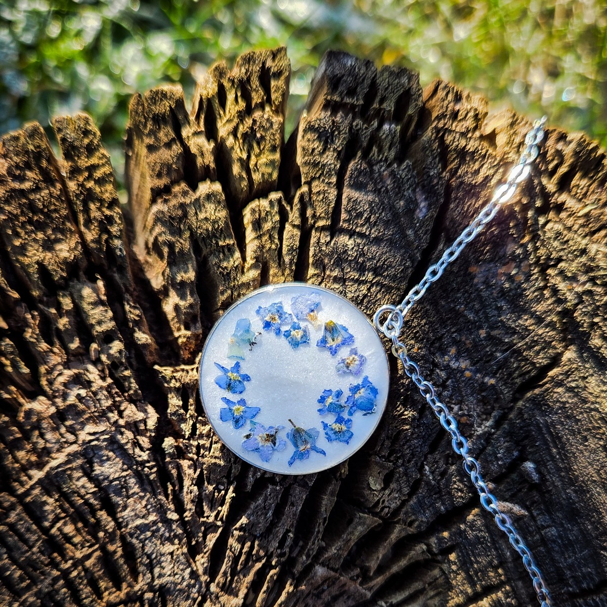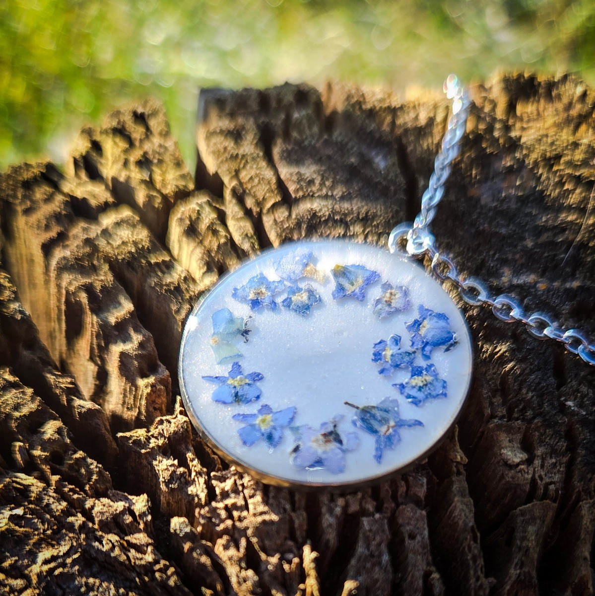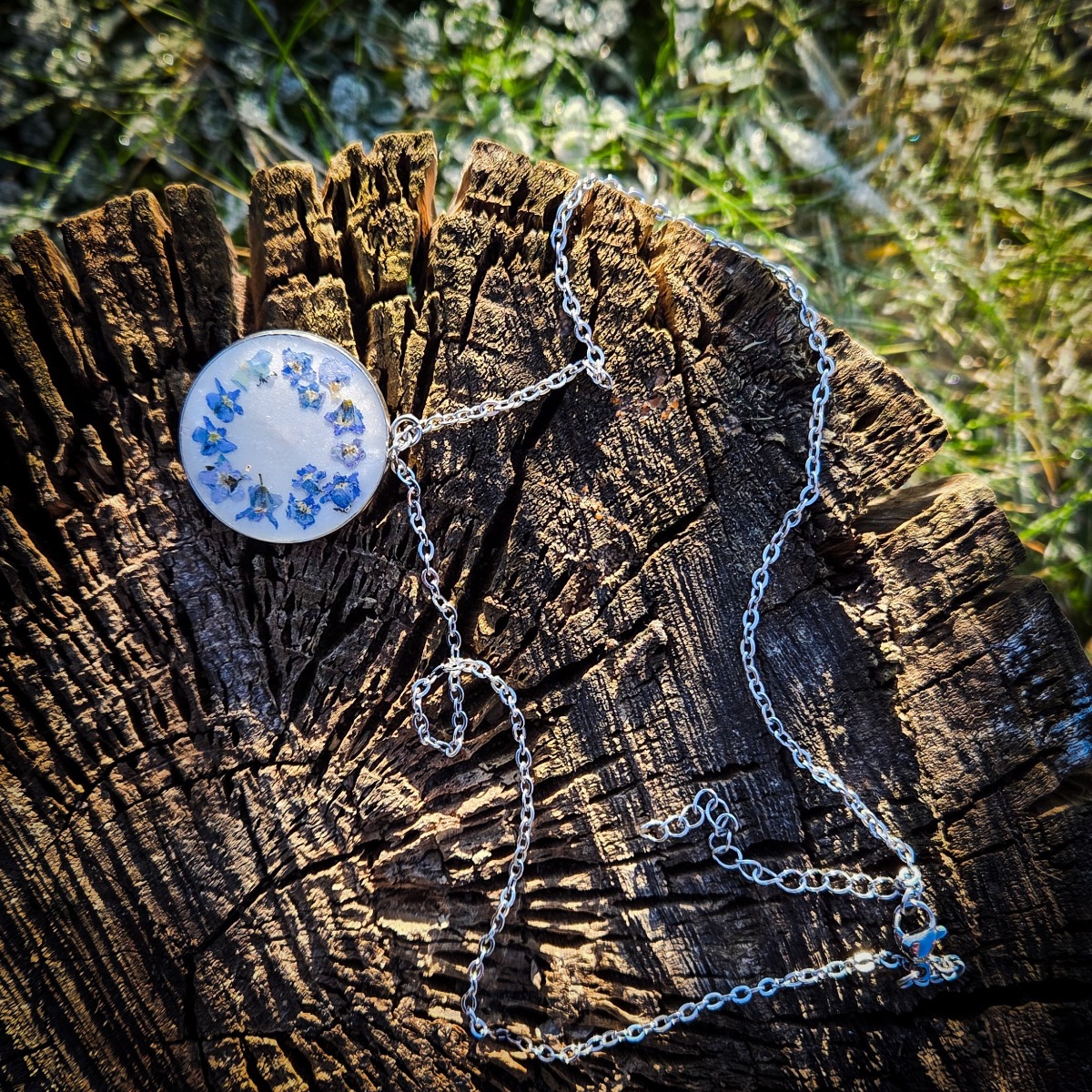 Zawieszka z zatopionymi w żywicy epoksydowej niezapominajkami.