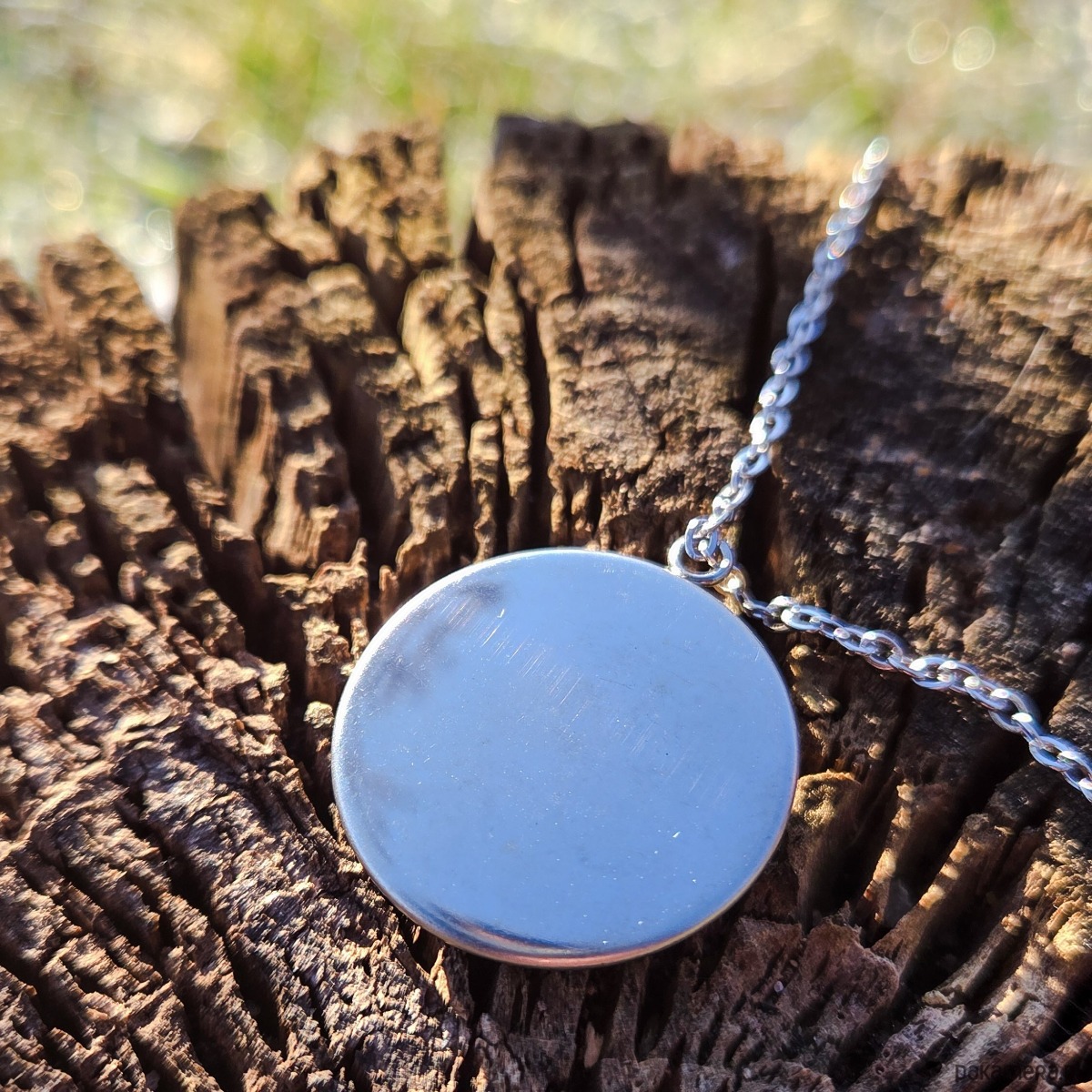 Łańcuszek i zawieszka ze stali chirurgicznej, długość całego nszyjnika 23,5 cm i przedłużka 6 cm, średnica oczka 2.5 cm