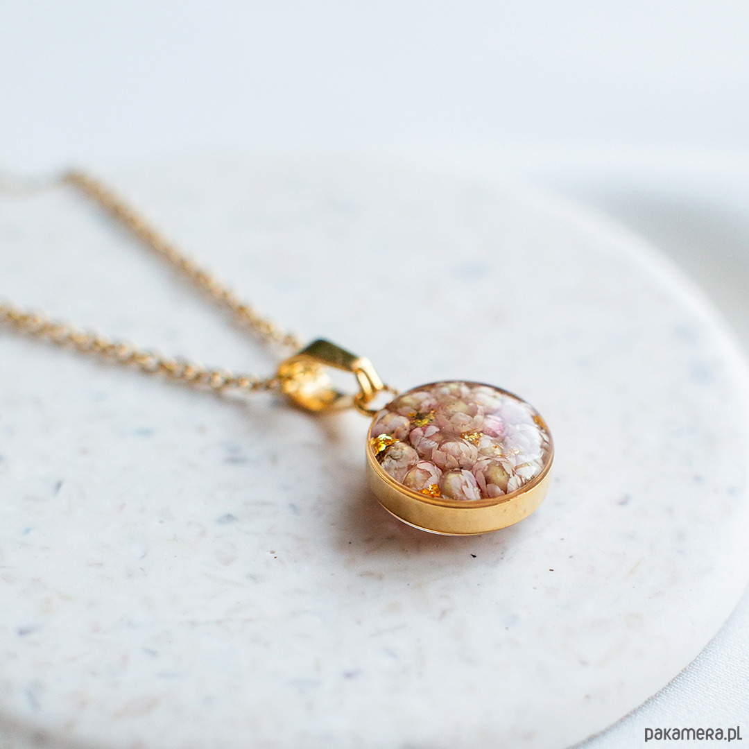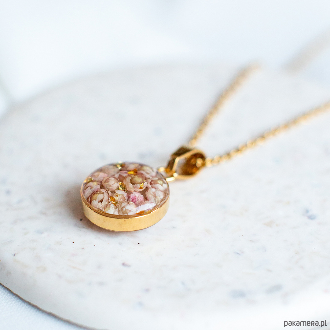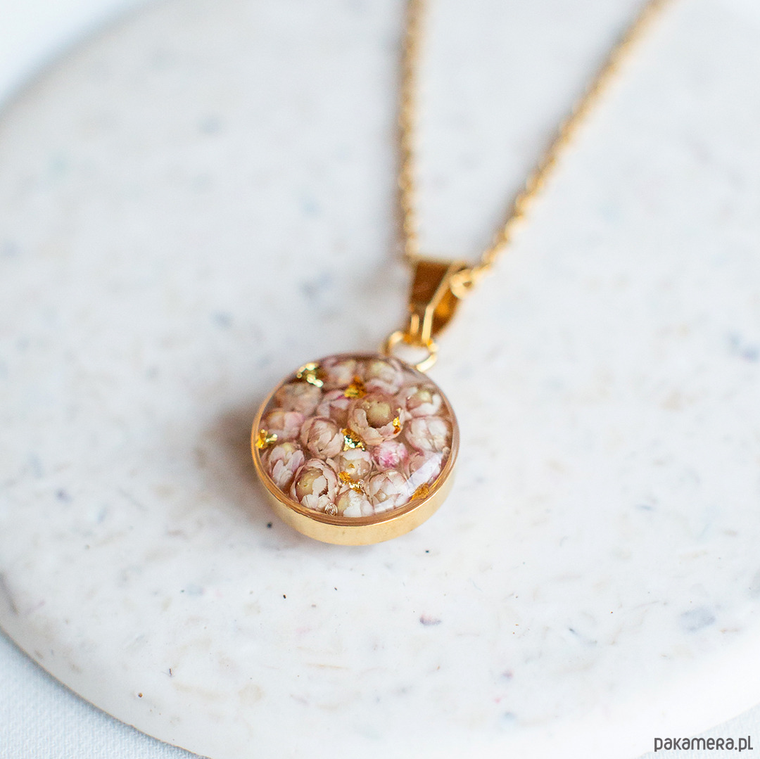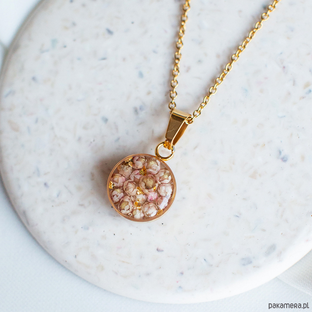 Wisiorek wykonany jest z żywicy epoksydowej z wykorzystaniem suszonych kwiatów. Metalowe elementy to stal nierdzewna szlachetna chirurgiczna.
