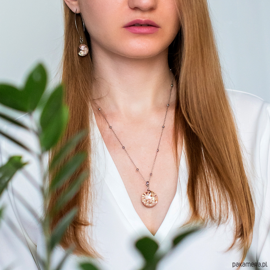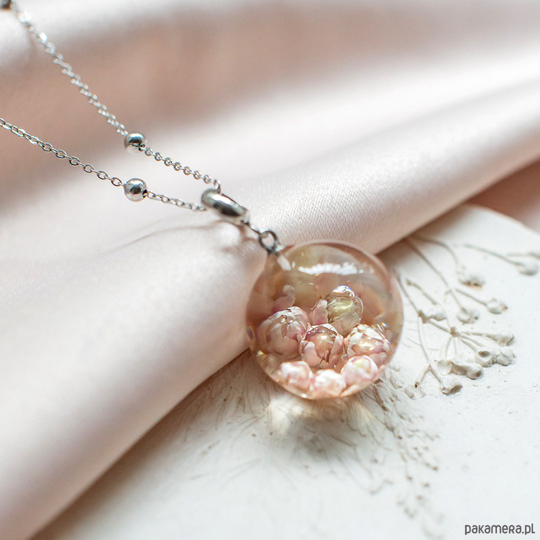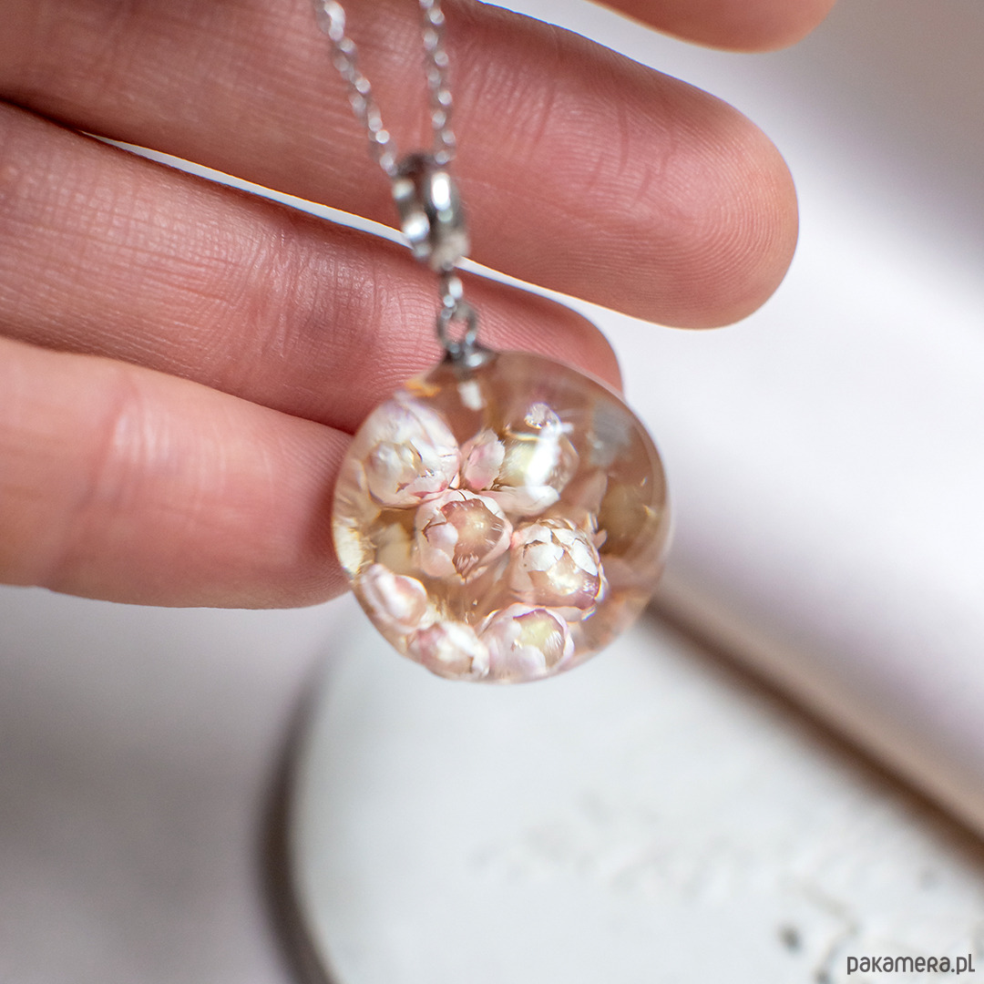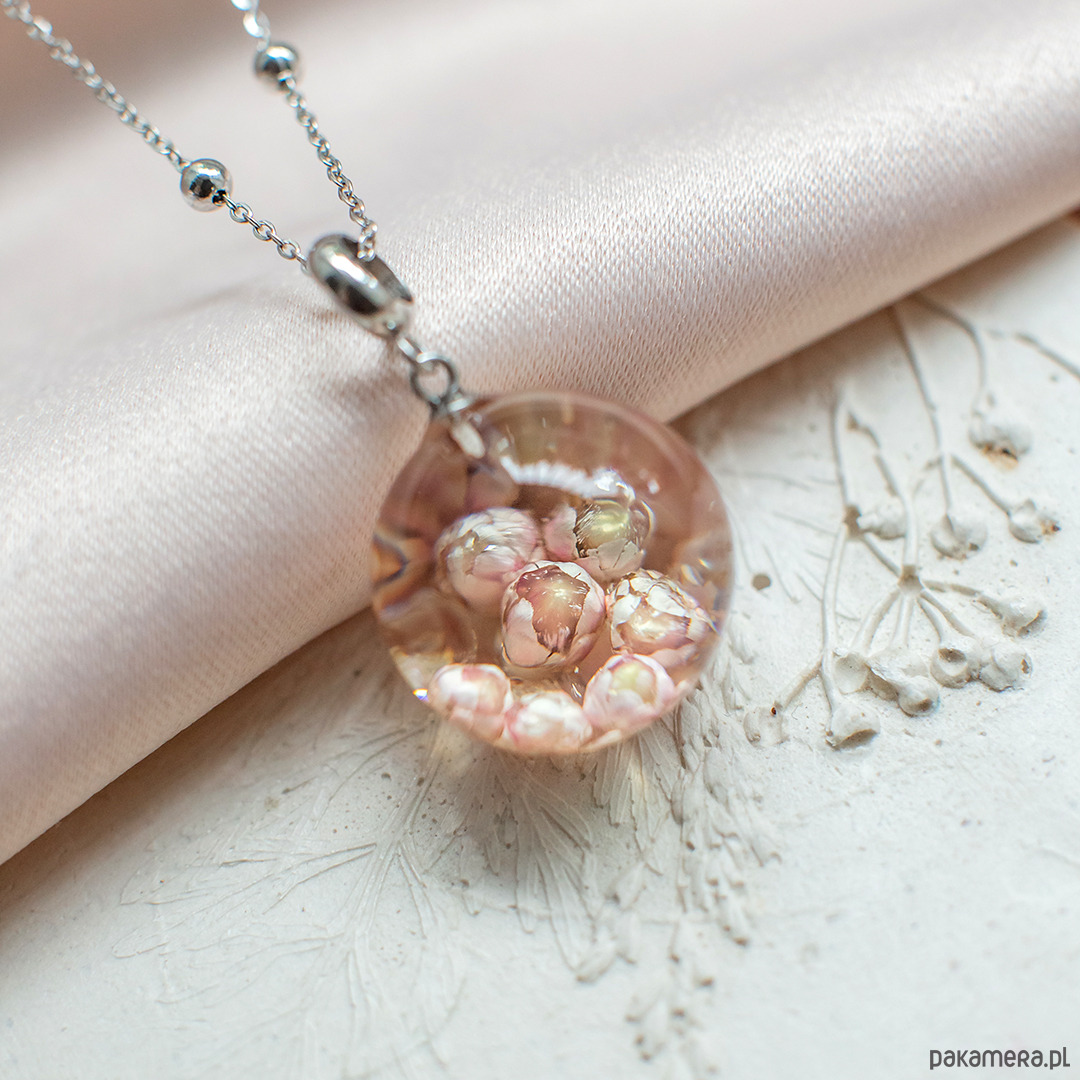 Wisiorek wykonany jest z żywicy epoksydowej z wykorzystaniem suszonych kwiatów. Metalowe elementy to stal nierdzewna szlachetna chirurgiczna.