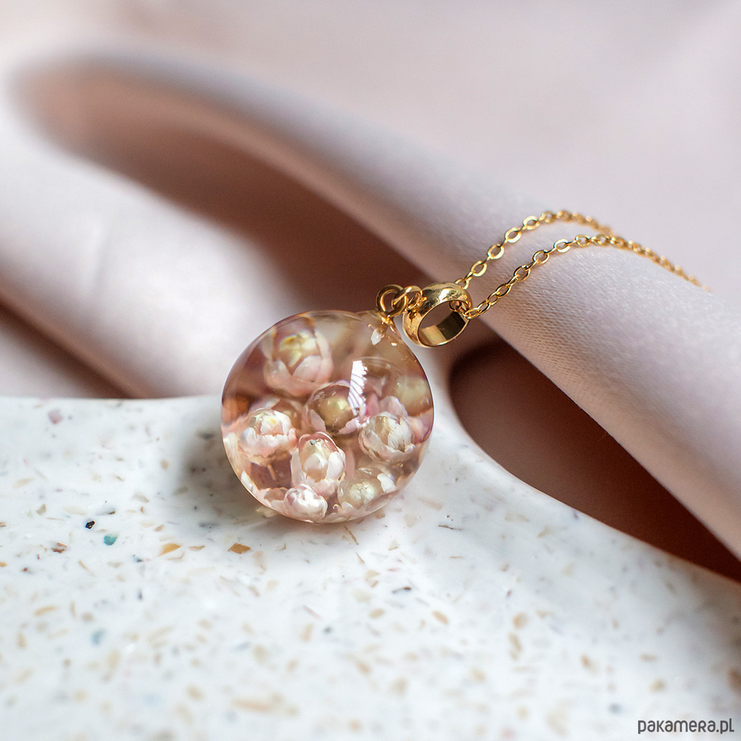 Wisiorek wykonany jest z żywicy epoksydowej z wykorzystaniem suszonych kwiatów. Metalowe elementy to stal nierdzewna szlachetna chirurgiczna.