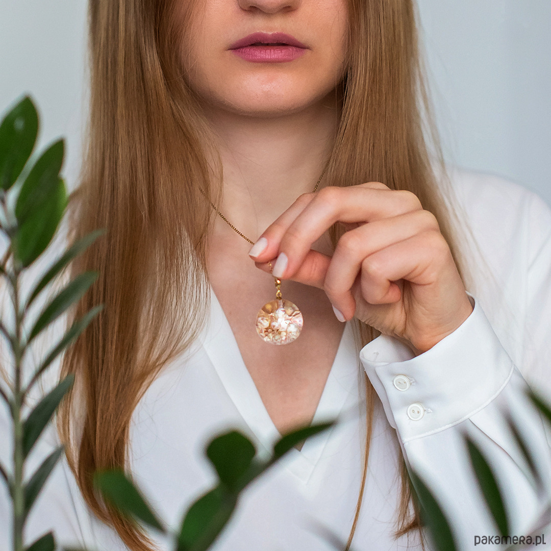 Wisiorek wykonany jest z żywicy epoksydowej z wykorzystaniem suszonych kwiatów. Metalowe elementy to stal nierdzewna szlachetna chirurgiczna.