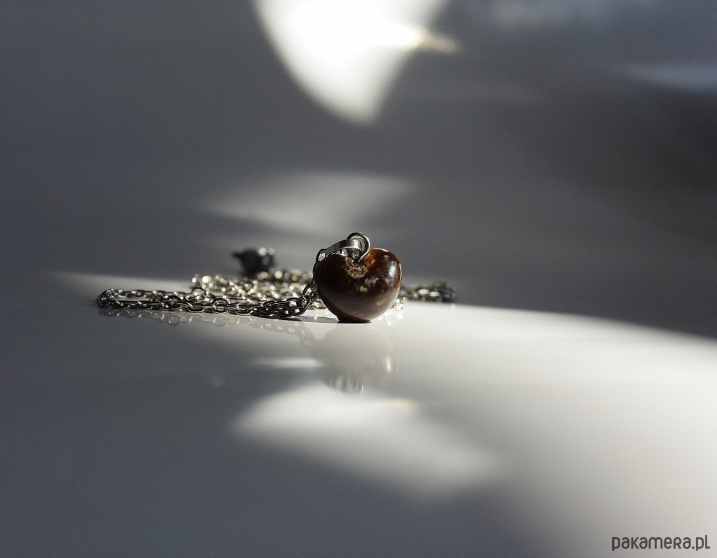 Wymiary pestki: wys. 8 mm, szer. 10 mm, grubość 4 mm. Długość łańcuszka z zapięciem 45 cm.