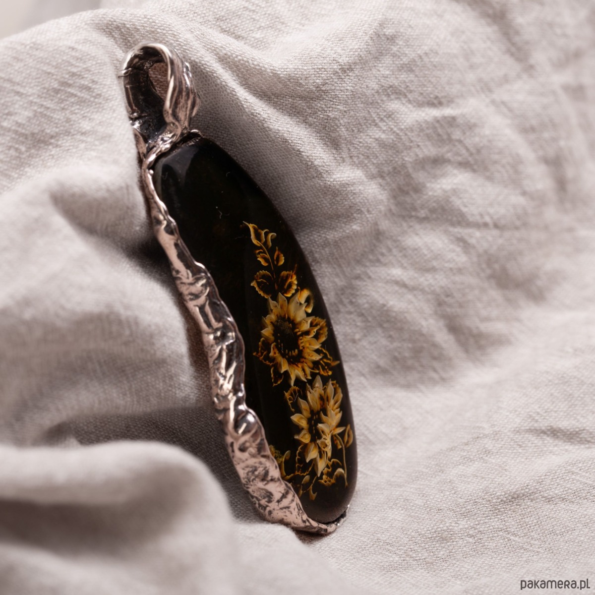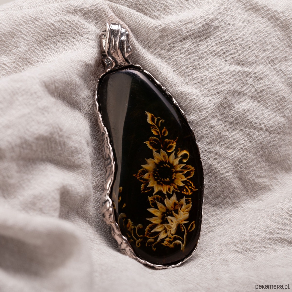 Wisiorek z ręcznie rzeźbionym bursztynem słoneczniki