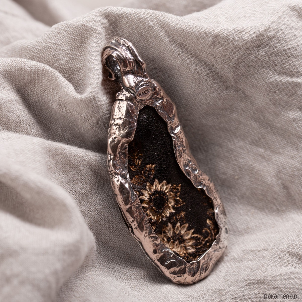 Zachwycający, w całości ręcznie wykonany wisiorek z naturalnego bursztynu bałtyckiego z wyjątkowym, rzeźbionym motywem słoneczników. Każdy detal kwiatów został precyzyjnie wyrzeźbiony, tworząc małe dzieło sztuki w biżuteryjnej formie. Nietuzinkowa forma, intensywny kontrast kolorów i artystyczna kompozycja sprawiają, że ten wisior z pewnością przyciąga wzrok. Idealny dla miłośników unikatowej, rękodzielniczej biżuterii.