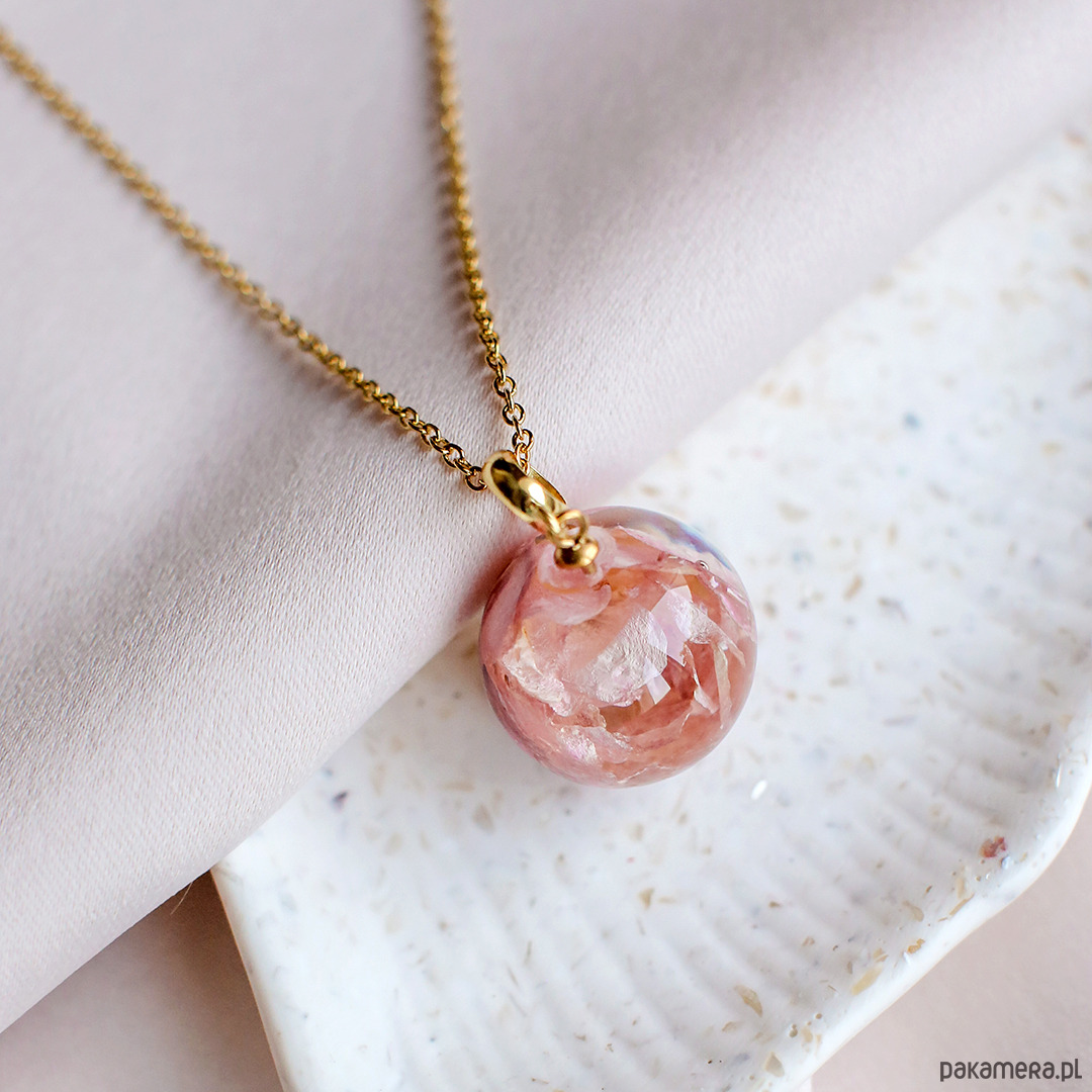 Wisiorek wykonany jest z żywicy epoksydowej z wykorzystaniem suszonych kwiatów. Metalowe elementy to stal nierdzewna szlachetna chirurgiczna.