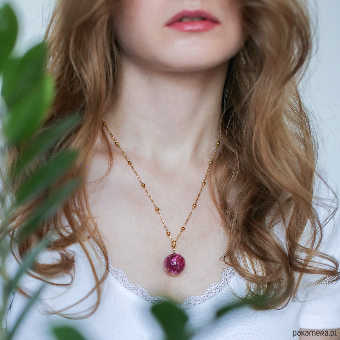 Wisiorek wykonany jest z żywicy epoksydowej z wykorzystaniem suszonych kwiatów. Metalowe elementy to stal nierdzewna szlachetna chirurgiczna.