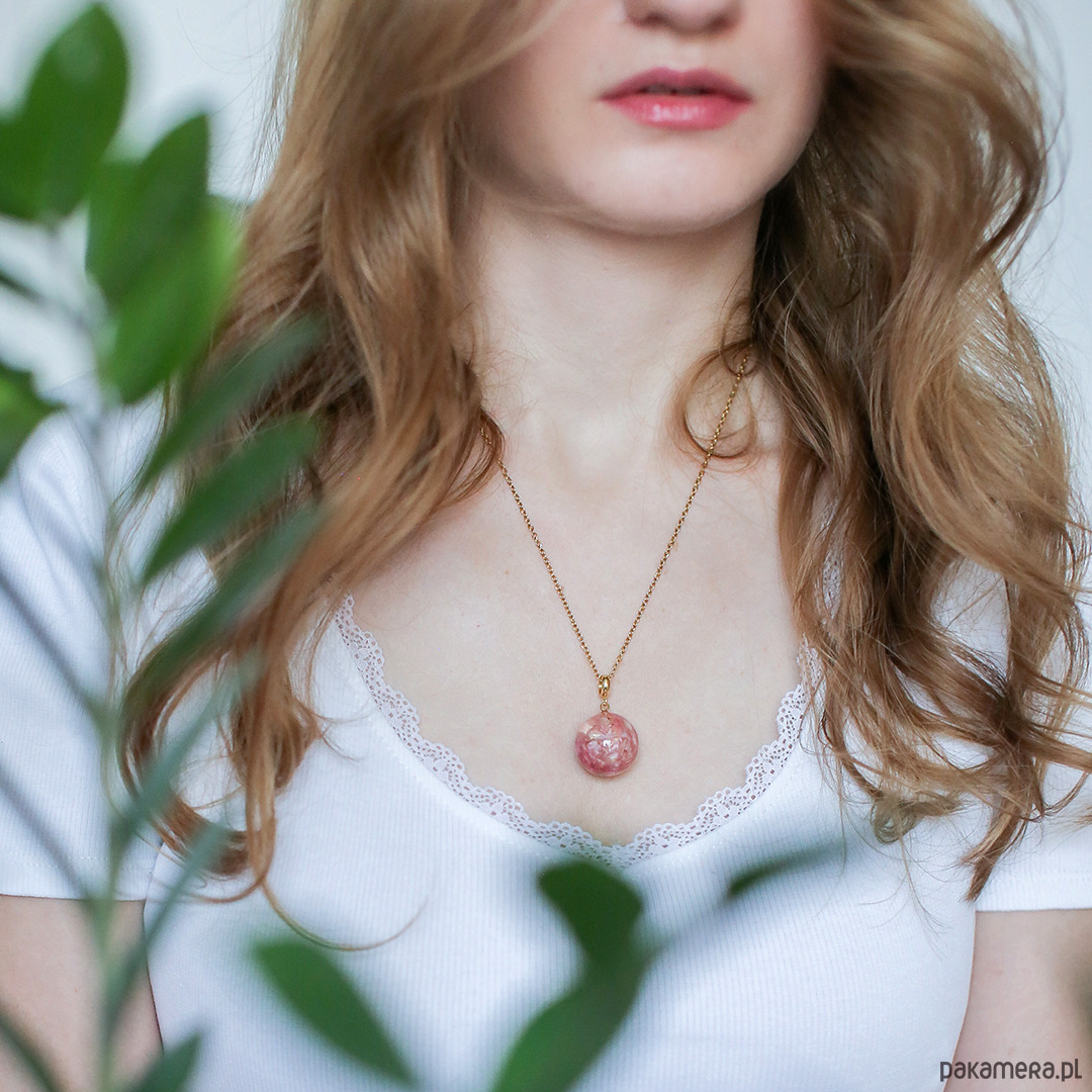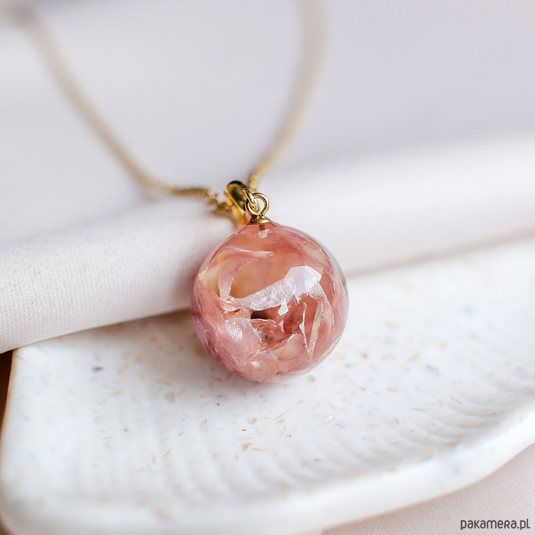 Wisiorek wykonany jest z żywicy epoksydowej z wykorzystaniem suszonych kwiatów. Metalowe elementy to stal nierdzewna szlachetna chirurgiczna.