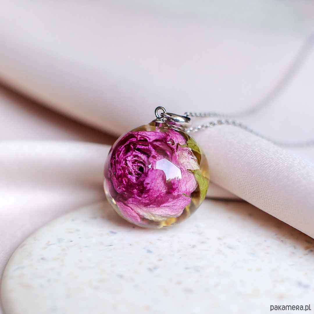 Wisiorek wykonany jest z żywicy epoksydowej z wykorzystaniem suszonych kwiatów. Metalowe elementy to stal nierdzewna szlachetna chirurgiczna.