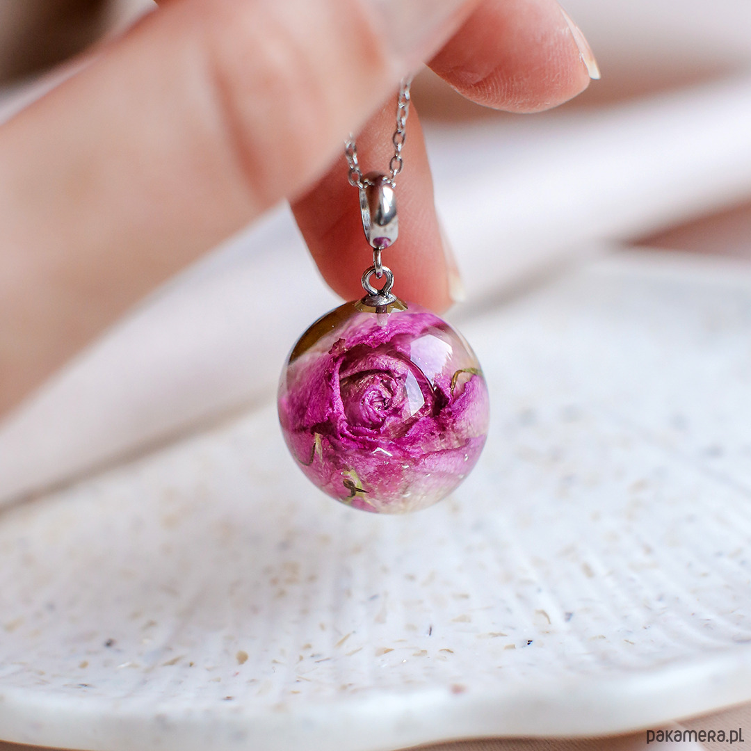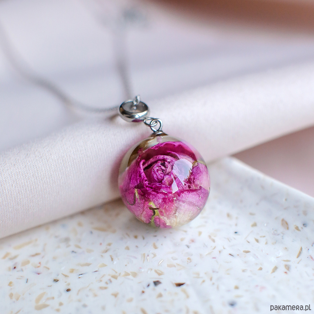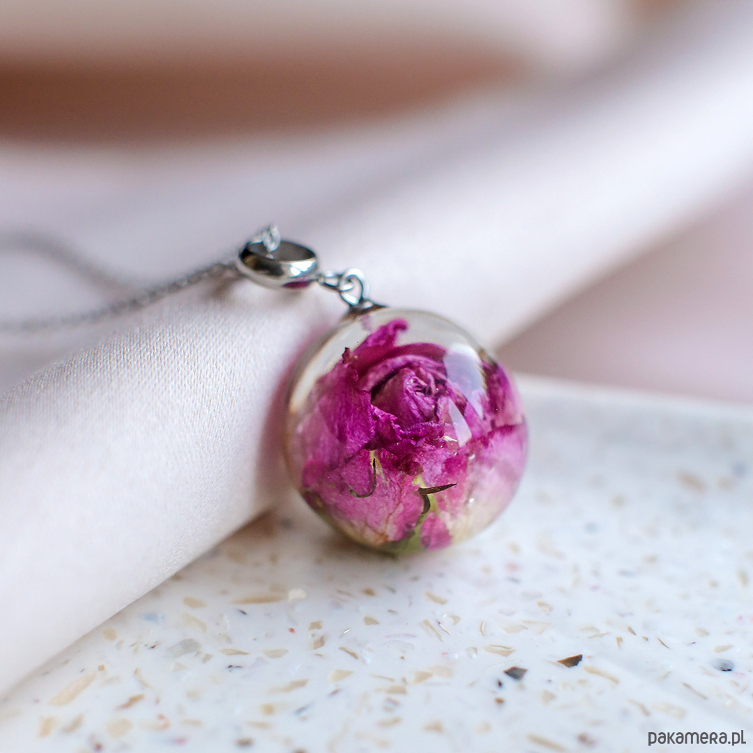 Wisiorek wykonany jest z żywicy epoksydowej z wykorzystaniem suszonych kwiatów. Metalowe elementy to stal nierdzewna szlachetna chirurgiczna.