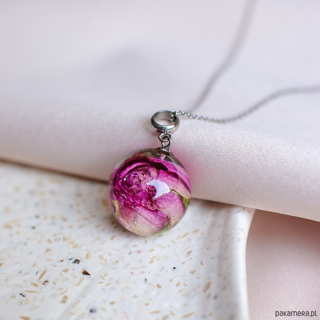 Wisiorek wykonany jest z żywicy epoksydowej z wykorzystaniem suszonych kwiatów. Metalowe elementy to stal nierdzewna szlachetna chirurgiczna.