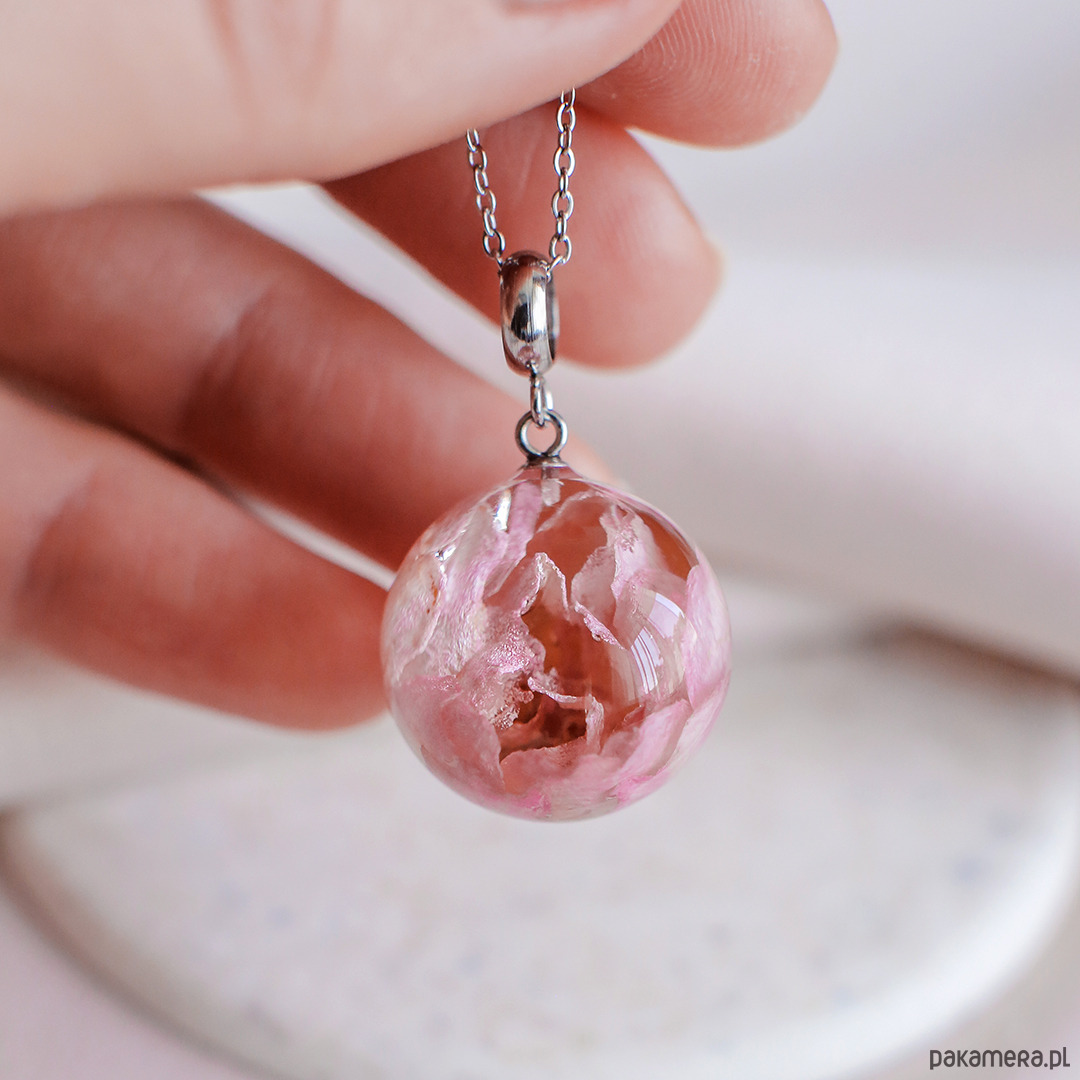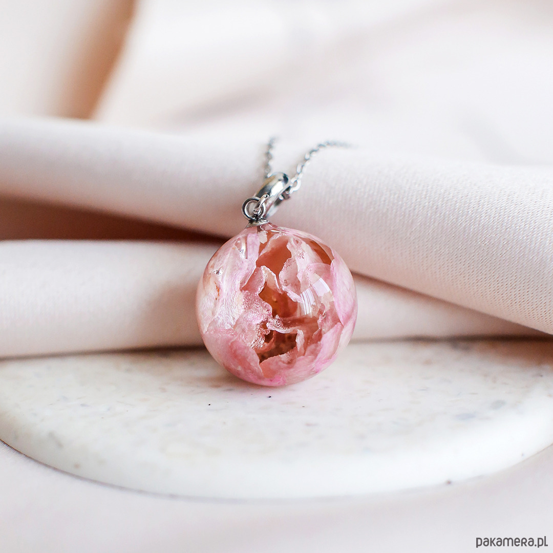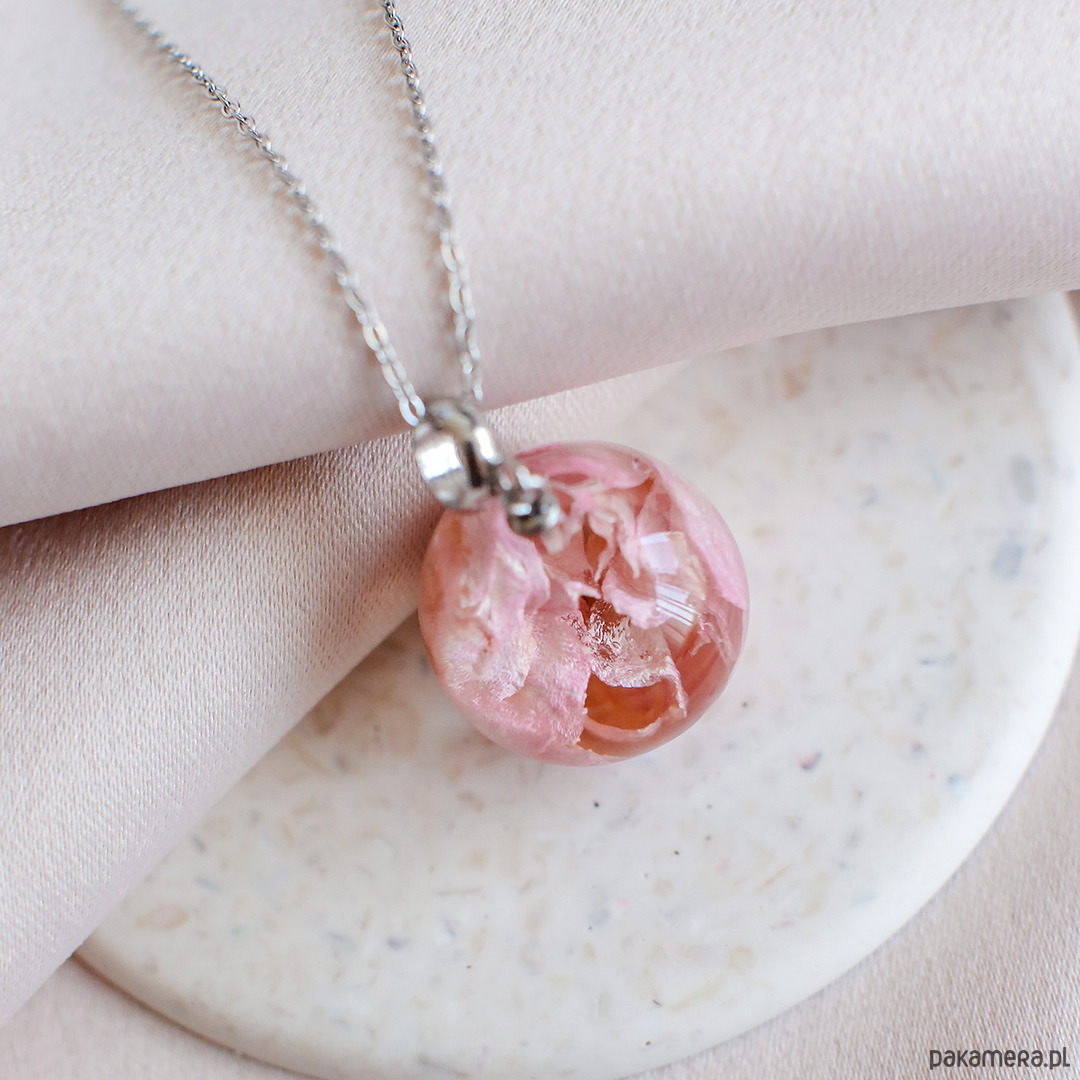 Wisiorek wykonany jest z żywicy epoksydowej z wykorzystaniem suszonych kwiatów. Metalowe elementy to stal nierdzewna szlachetna chirurgiczna.