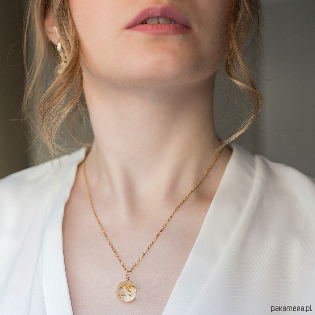 Wisiorek wykonany jest z żywicy epoksydowej z wykorzystaniem suszonych kwiatów. Metalowe elementy to stal nierdzewna szlachetna chirurgiczna.