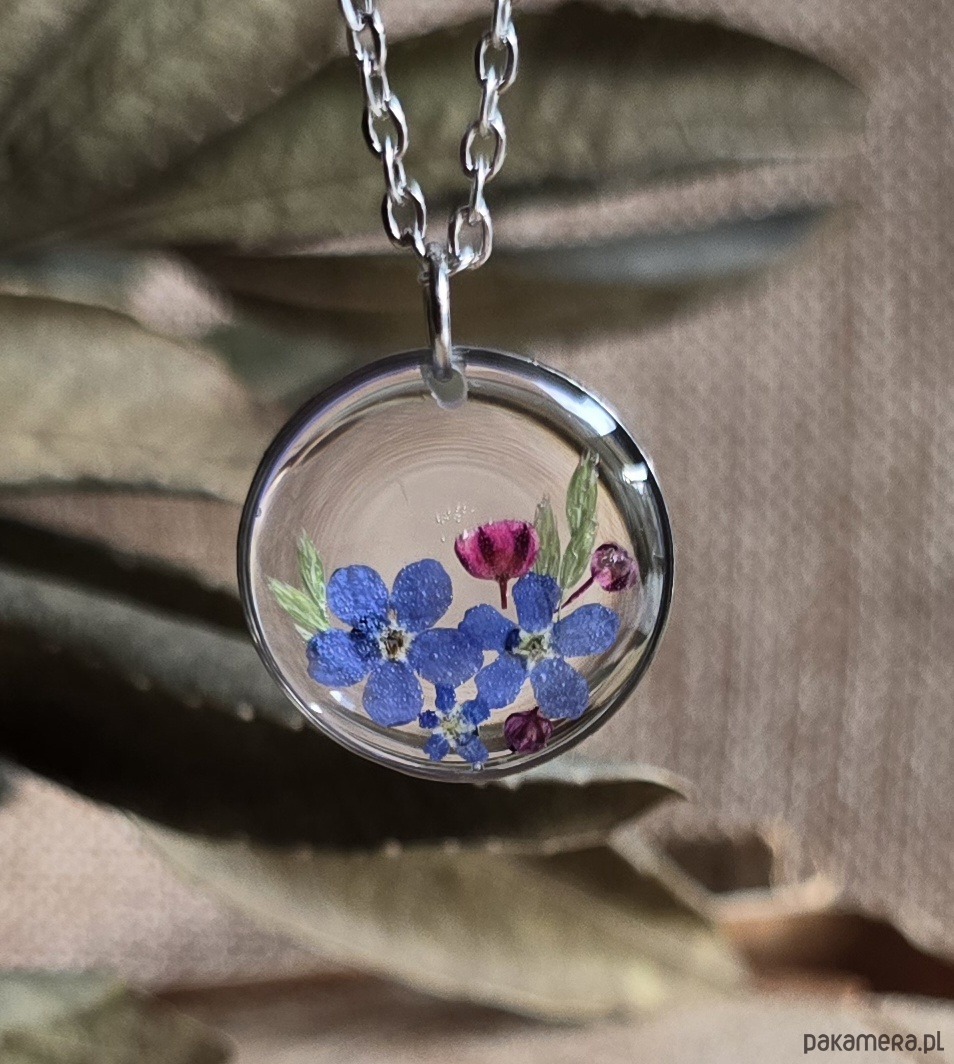 Oferuję Państwu unikalną biżuterię. Zawieszka jest wykonana z suszonych kwiatów i żywicy epoksydowej. Biżuteria jest wspaniałym i oryginalnym prezentem na lata.