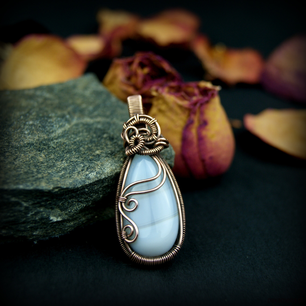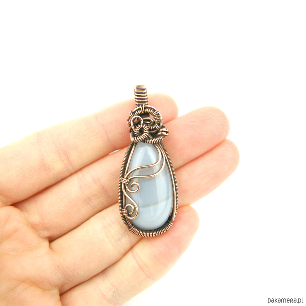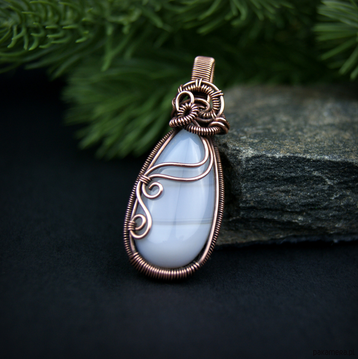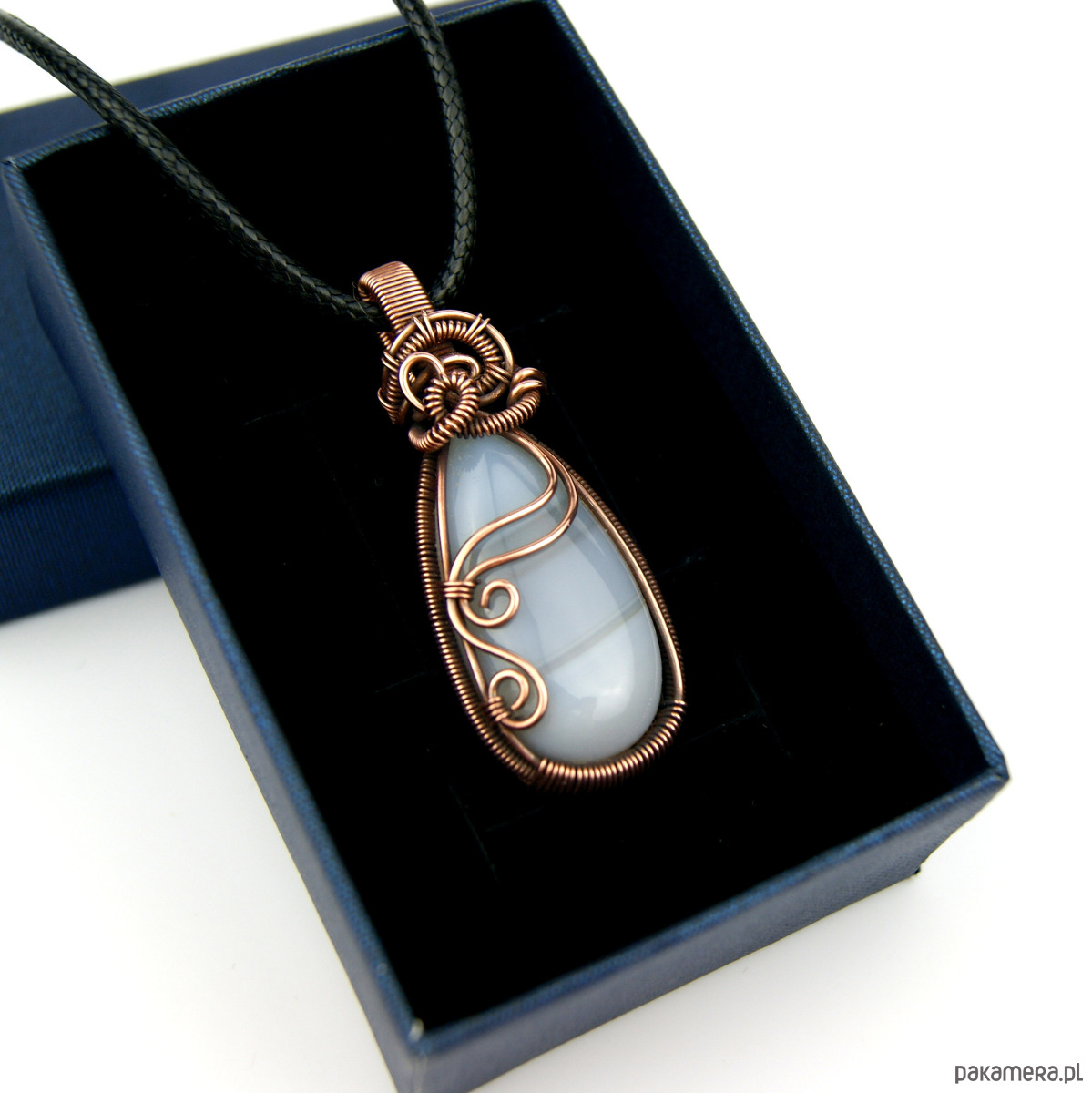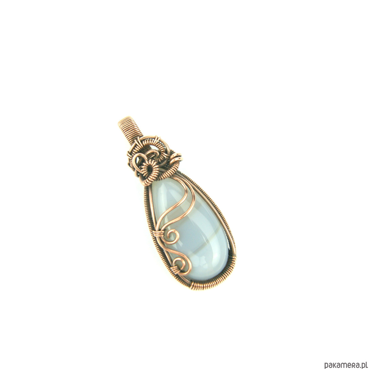 Wisiorek powstał z agatu o mleczno szarej barwie. Całość misternie opleciono miedzią. Biżuteria oksydowana.
