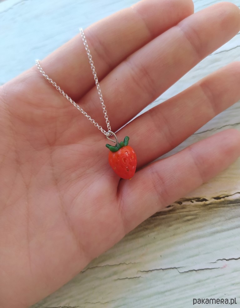 Ręcznie wykonany wisiorek z truskawką wykonaną z masy termoutwardzalnej.
