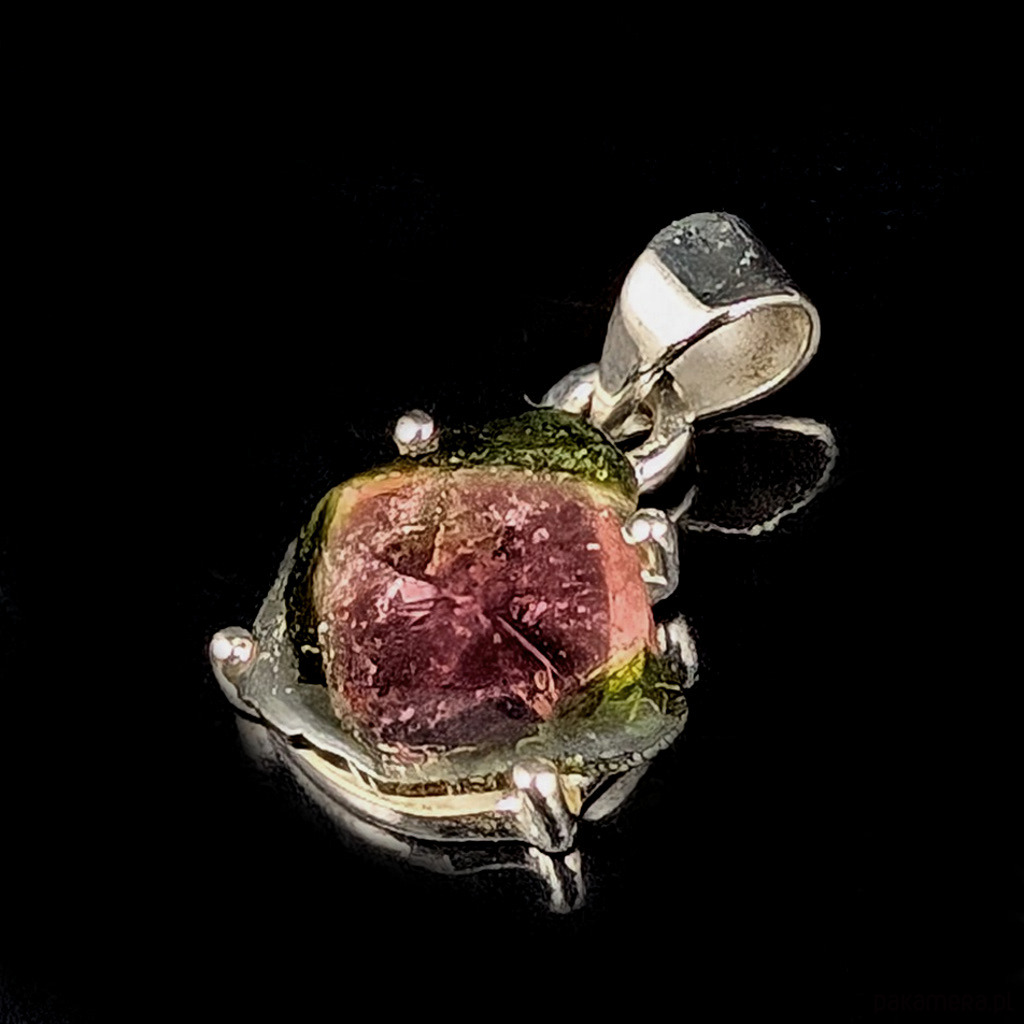 Subtelny wisiorek wykonany ze srebra próby 925 oraz świetnej jakości turmalinu arbuzowego o pięknie odbijającej światło, soczystej barwie. Wymiary oprawy kamienia 15 x 14 mm. Długość z krawatką 22 mm. Waga 2 gramy. Wykonany przez dostawcę kamieni. Zawieszka zostanie zapakowana w ozdobne pudełeczko.