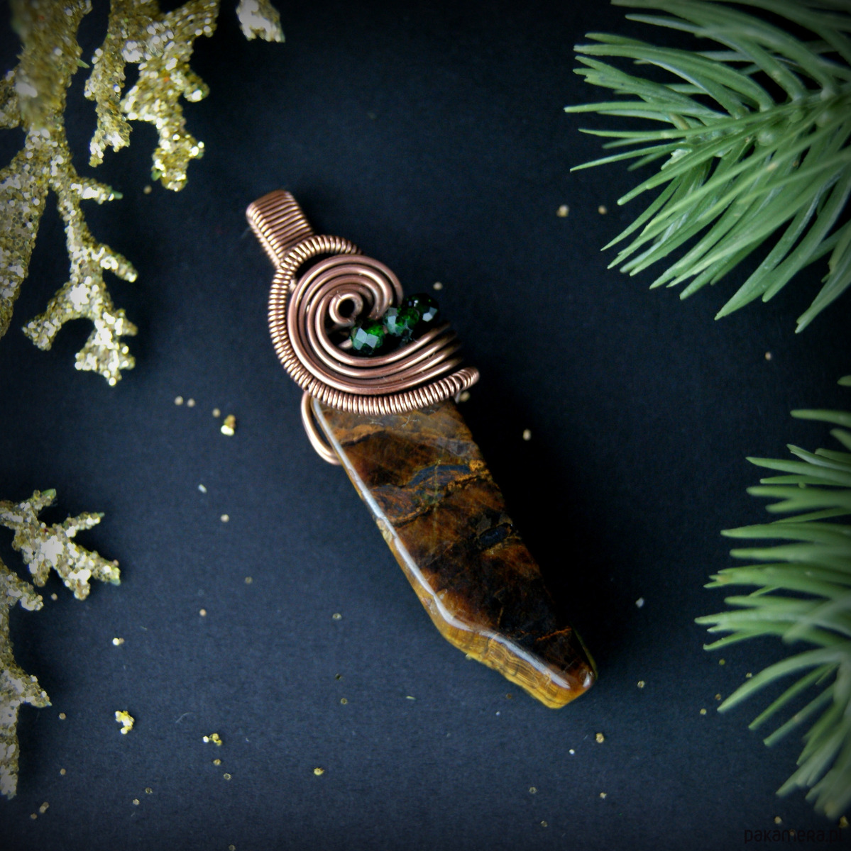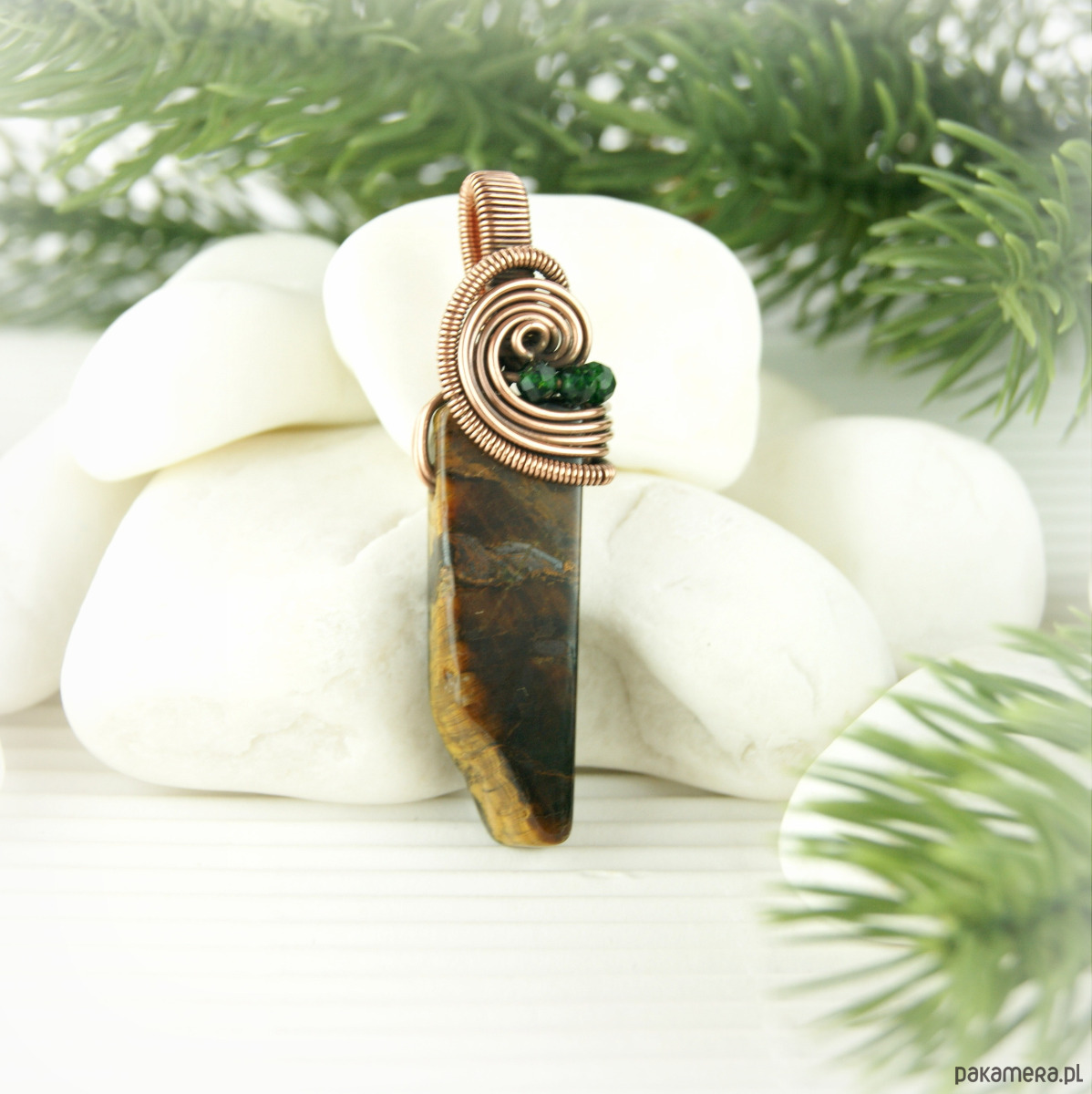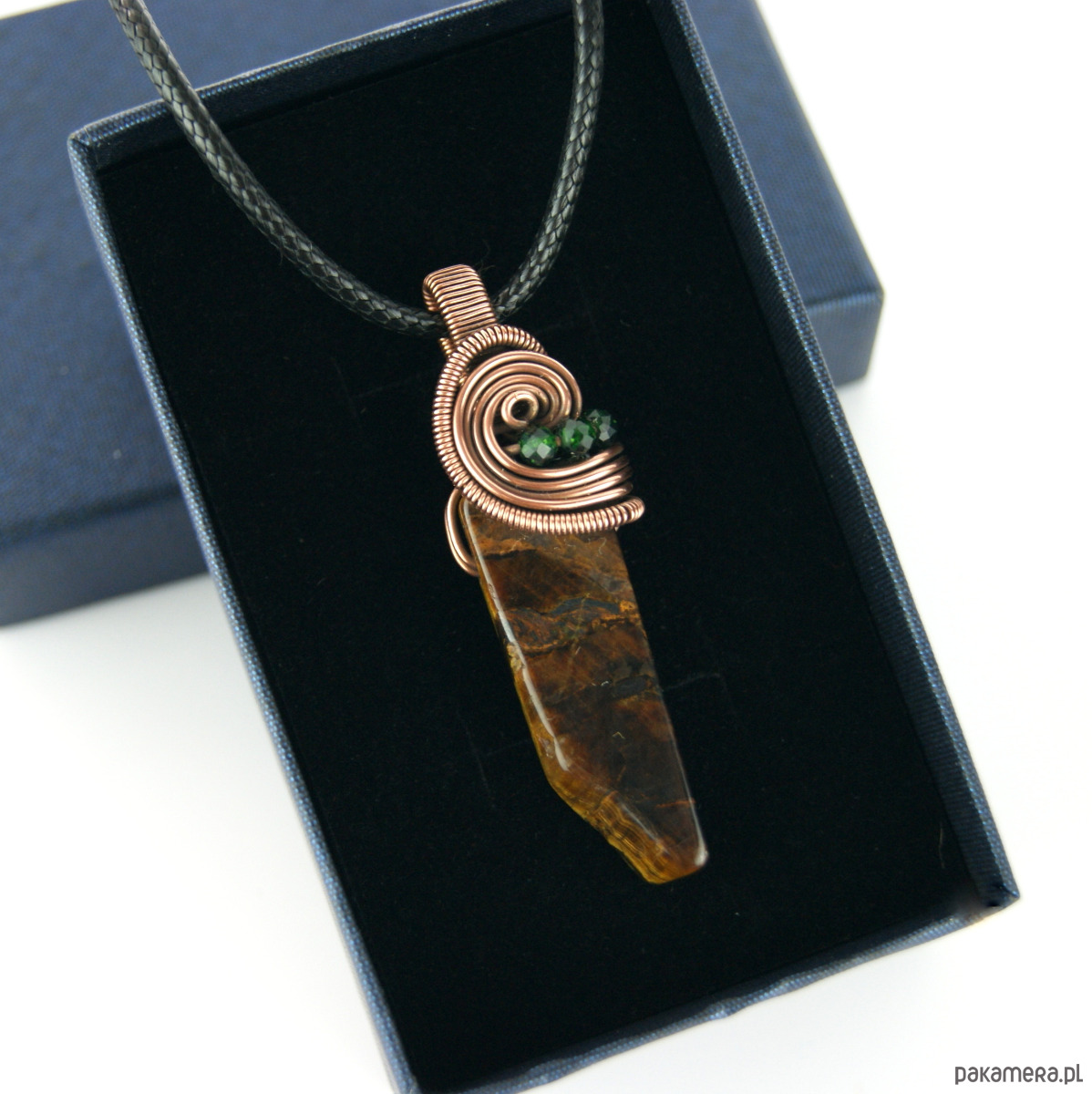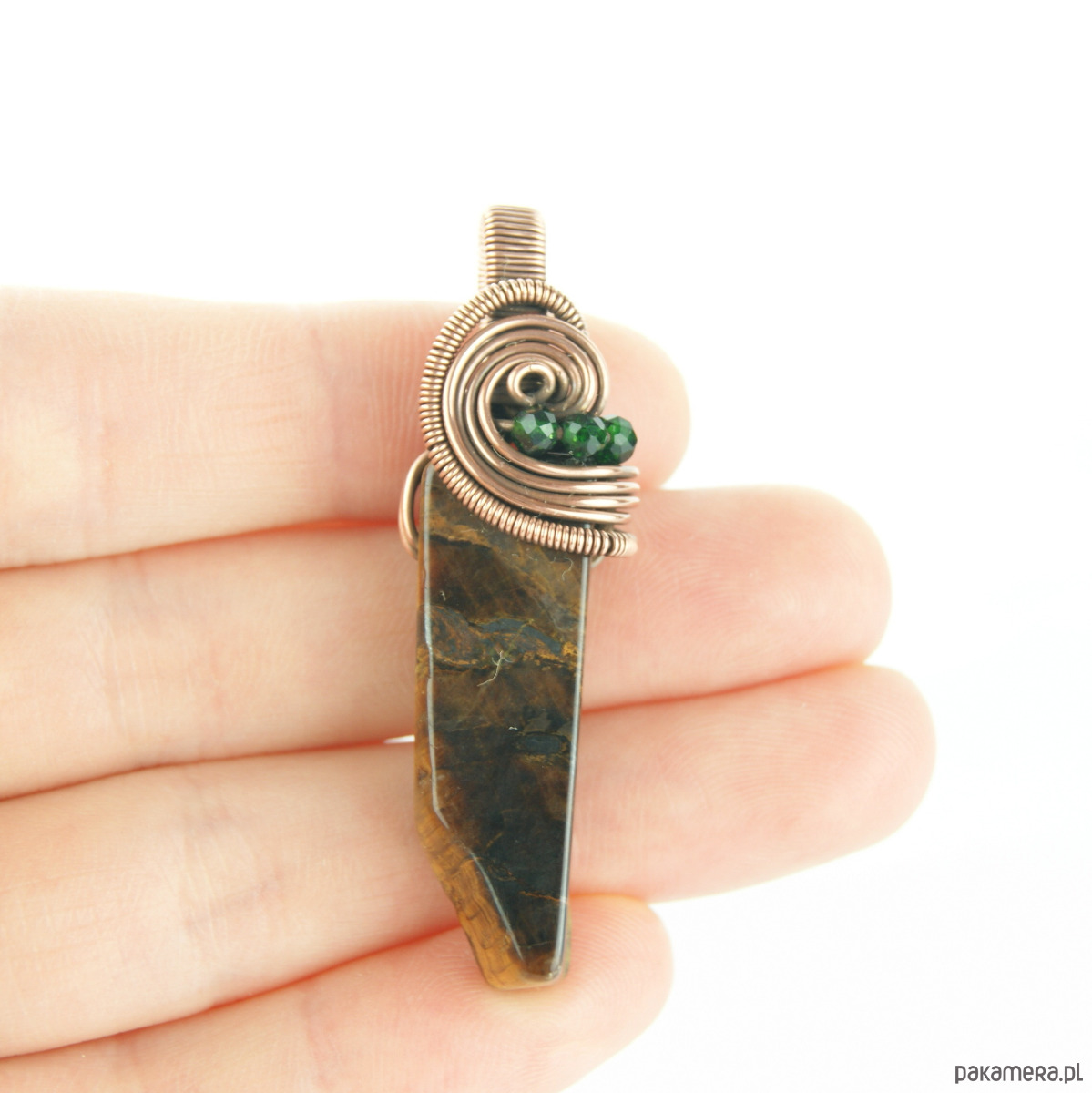 Wisiorek powstał z wyjątkowego kamienia – Tygrysiego oka o nieregularnym kształcie oraz drobnych kamieni szmaragdu nilu. Całość utrzymana w odcieniach brązu, oprawa miedziana.