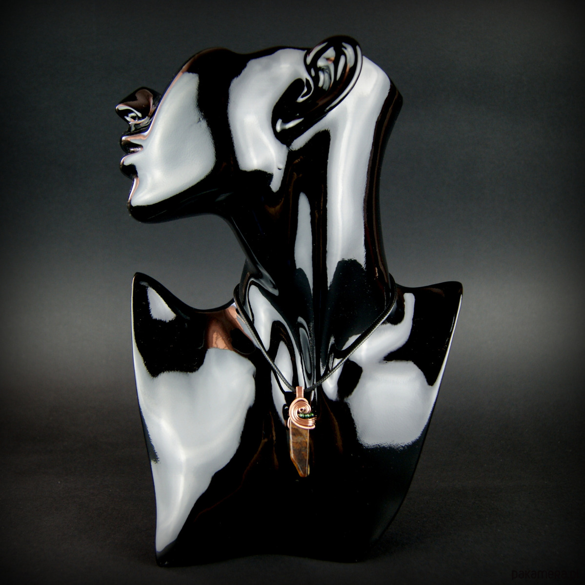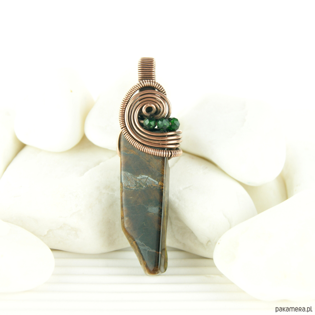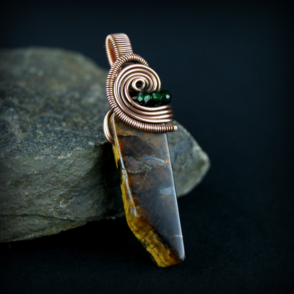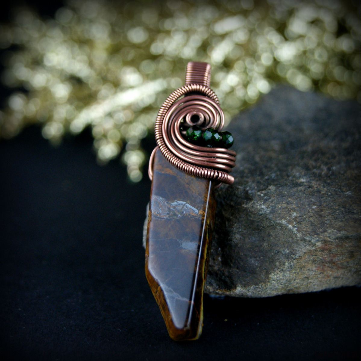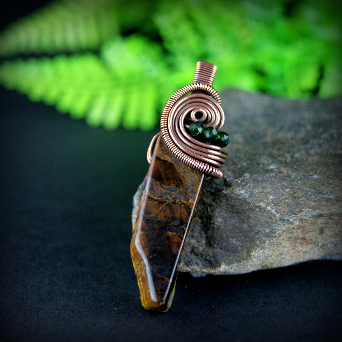 Wisiorek powstał z wyjątkowego kamienia – Tygrysiego oka o nieregularnym kształcie oraz drobnych kamieni szmaragdu nilu. Całość utrzymana w odcieniach brązu, oprawa miedziana.